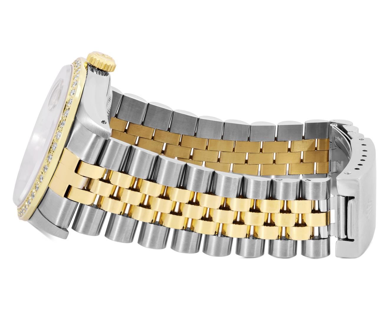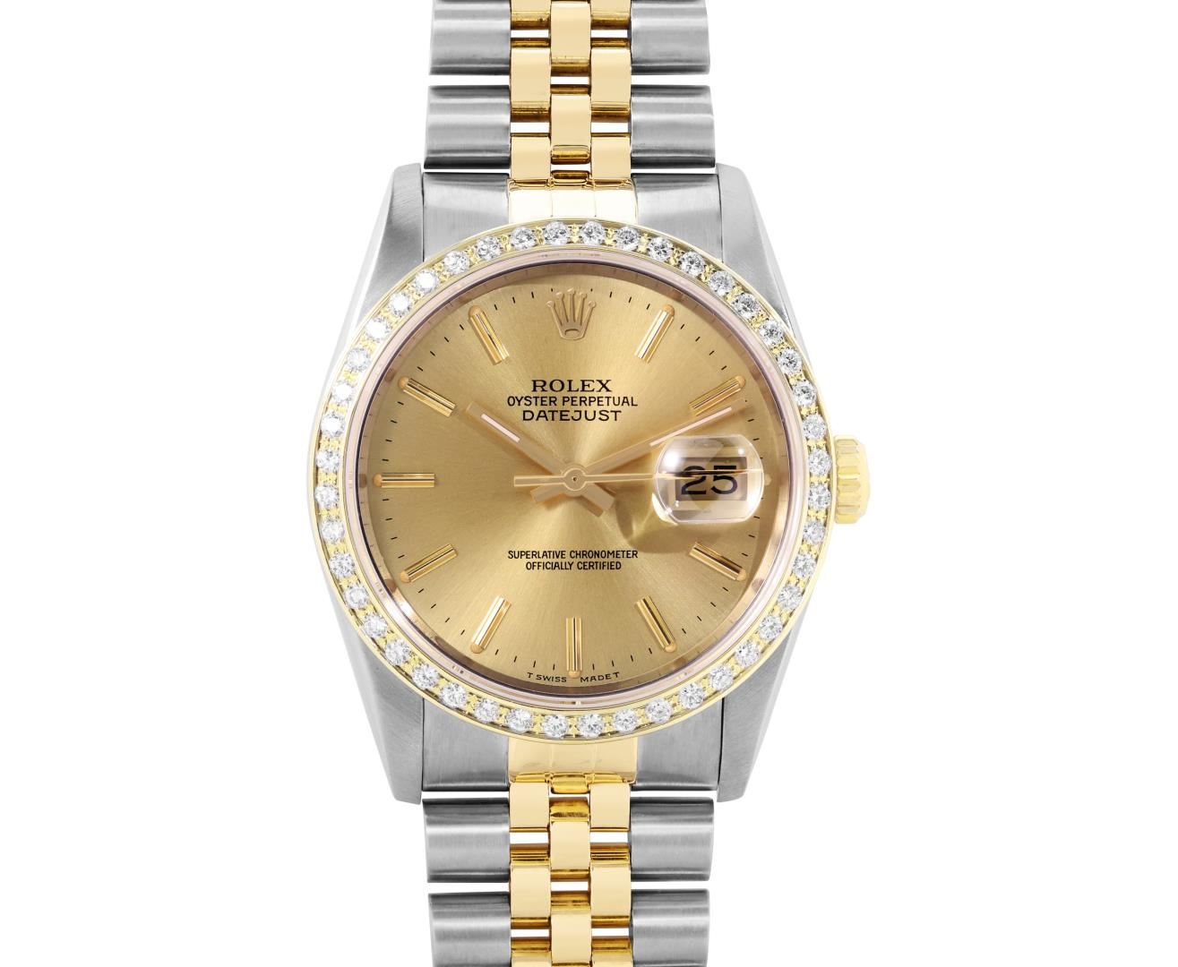 One Mens Pre Owned Two Tone 18K Yellow Gold And Stainless Steel Rolex Datejust Polished, Serviced And Electronically Tested, Rolex Yellow Gold And Stainless Steel Case: 36mm, Rolex Yellow Gold Crown, Custom Bezel: New 18K Yellow Gold Beadset Diamond Bezel, Diamond Count: 44 Diamonds. Custom Crystal: New Sapphire With Magnified Date Window. Custom Hands: New Luminecent Hands. Rolex Movement: Automatic Winding Movement 3135. Rolex Dial: Champagne Dial With Index Hour Markers and Dash Track With Lumi Dots. Date Window: 3 O'Clock Position Date Display, Quickset, Model: Quickset Datejust. Condition: G-6 Extra Fine. Rolex Bracelet: Two Tone 18K Yellow Gold And Stainless Steel Jubilee Band. Bright Polish. 7.0 Inch Length, Adjustable. Standard Clasp, With Rolex Logo. This Watch Has Been Serviced Time Tested And Is In Excellent Condition It Is Free Of All Scratches And Dents. This Watch Comes With A Rolex Box.