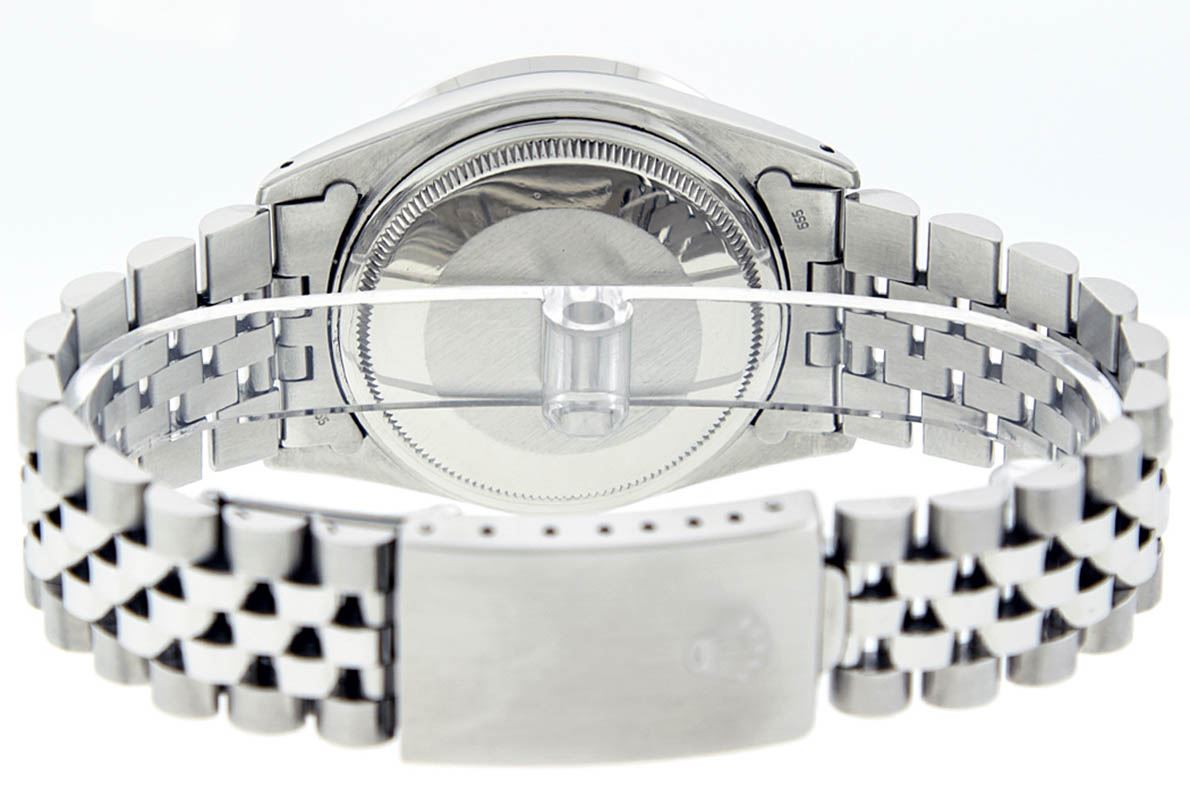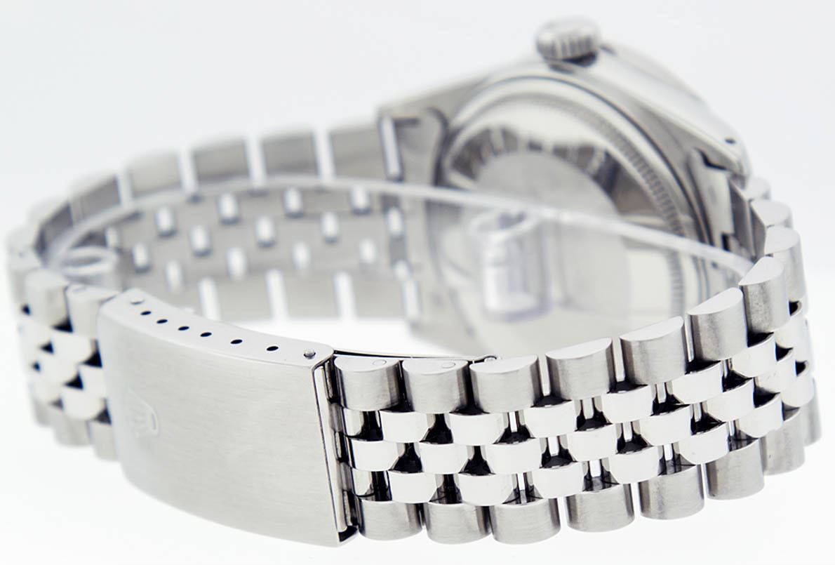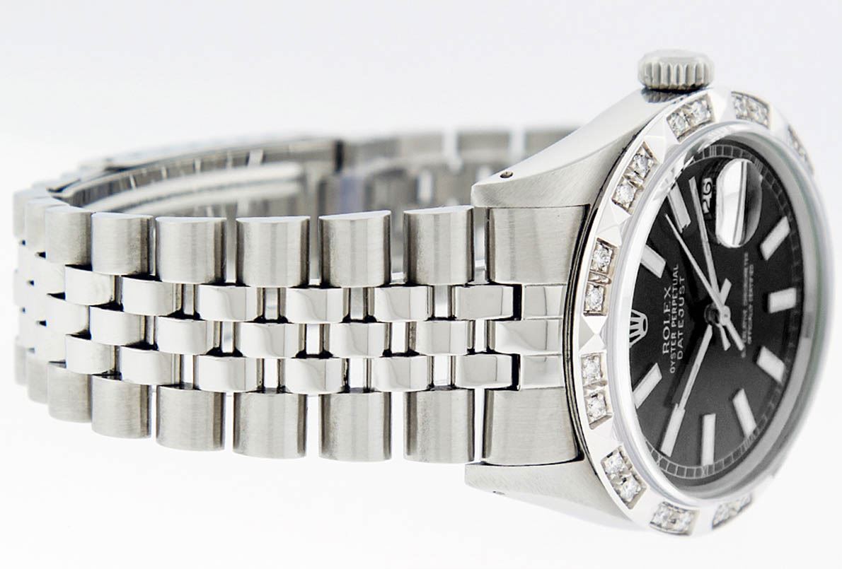 One Mens Rolex Datejust Polished Bright with Satin Finish, Serviced & Electronically Tested, Stainless Steel Case:36mm, Stainless Steel Crown, Custom Bezel:18K White Gold Pyramid Diamond Bezel, Diamond Count: 24 Diamonds Total Weight .70 Carat, Clarity: SI-VS, Color: G to H. Custom Crystal: Synthetic Sapphire Cyclops Lens. Movement: Automatic Winding Movement Caliber 3035. Custom Dial: Black Index Dial With Square Roman Track. Date Window: 3 O'Clock Position Date Display, Quickset, Model: Datejust. Condition: G-6 Extra Fine. Bracelet:Stainless Steel Jubilee. Bright Polish & Satin Finish. 7.0 Inch Length, Adjustable. Standard Clasp, With Rolex Logo.
