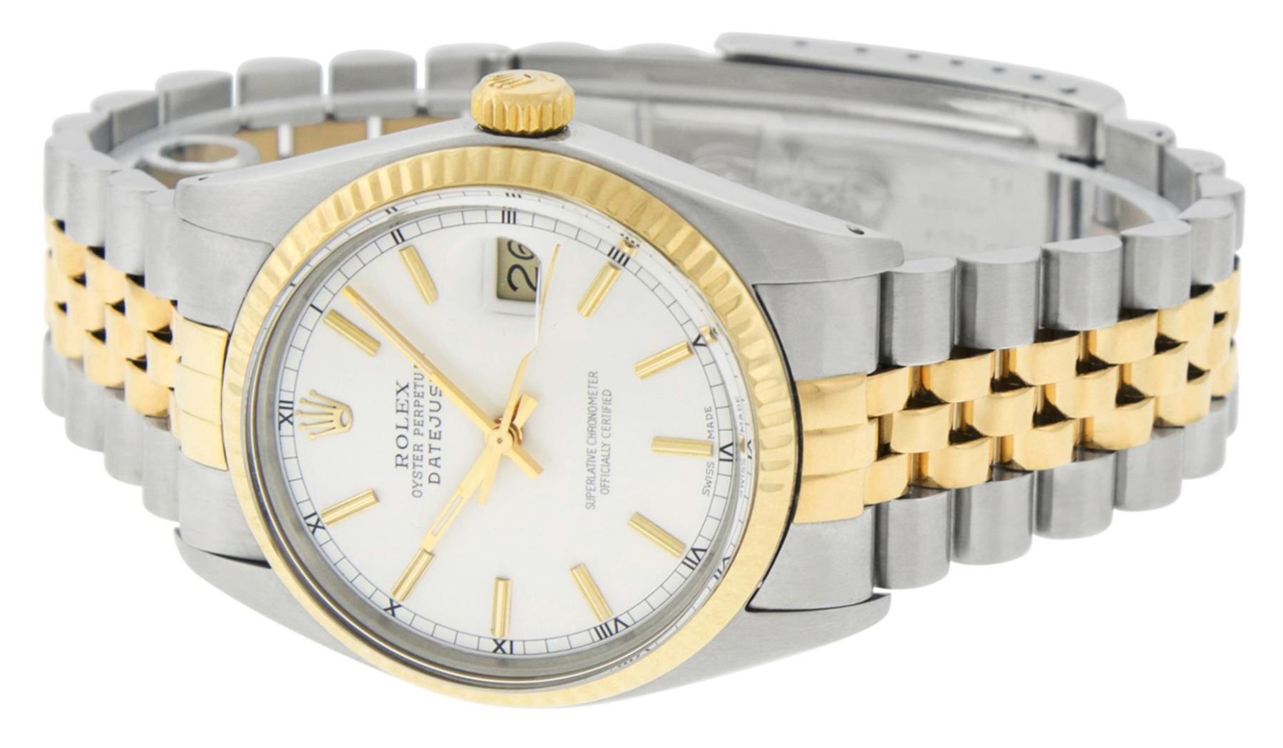 One Mens Rolex Two Tone Yellow Gold And Stainless Steel Datejust Polished, Serviced & Electronically Tested, 14K Yellow Gold & Stainless Steel Case: 36mm, 14K Yellow Gold Crown, Rolex Bezel: 14K Yellow Gold Fluted Bezel. Custom Crystal: New Acrylic With Magnified Date Window. Custom Hands: New Luminescent Hands. Rolex Movement: Automatic Winding Movement 3035. Custom Dial: Refinished To Silver With Index Hour Markers And Square Track. Date Window: 3 O'Clock Position Date Display, Quickset, Model: Datejust. Condition: G-6 Extra Fine. Rolex Bracelet: 14K Two Tone Yellow Gold & Stainless Steel Jubilee Band. Bright Polish. 7.0 Inch Length, Adjustable. Standard Clasp, With Rolex Logo. This Watch Has Been Serviced Time Tested And Is In Excellent Condition It Is Free Of All Scratches And Dents.