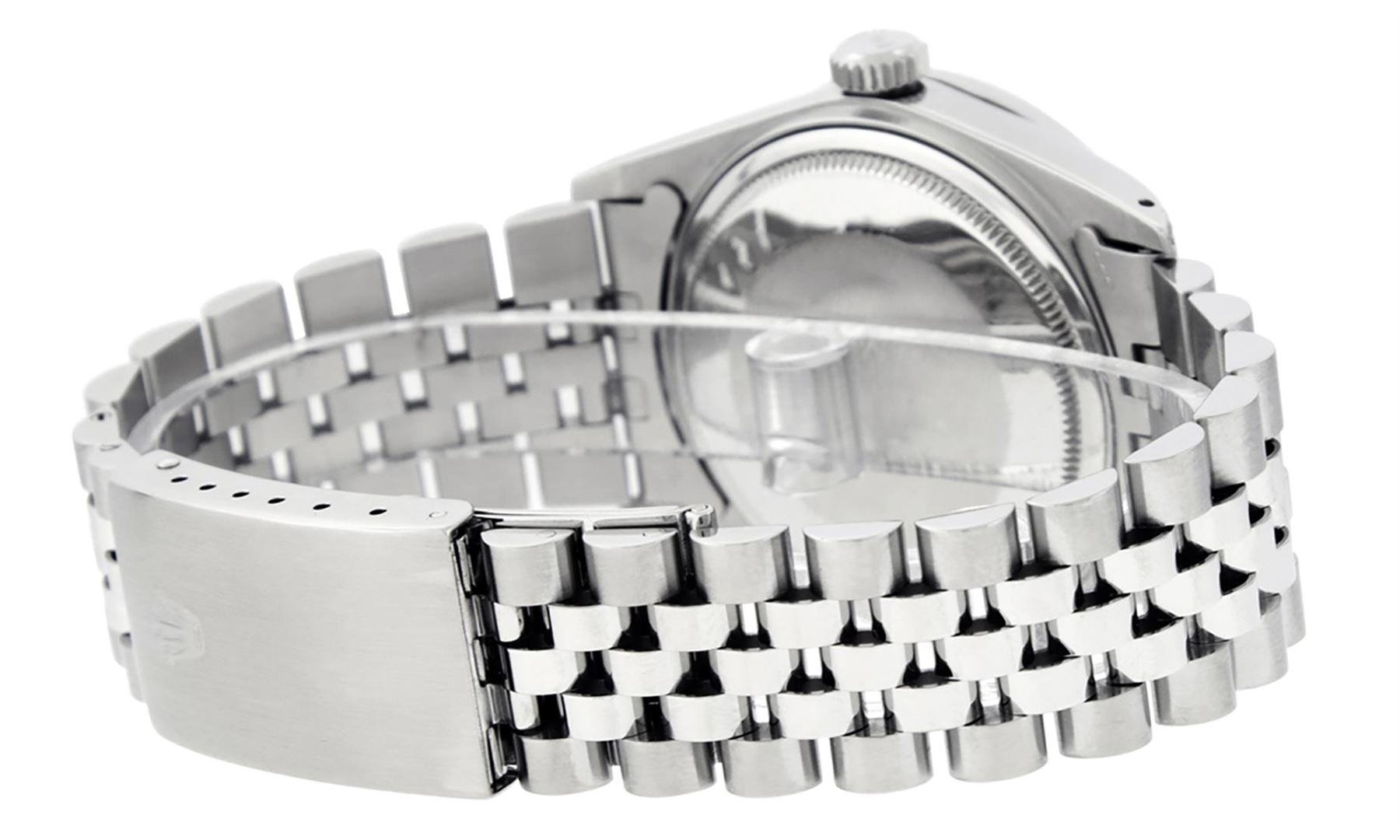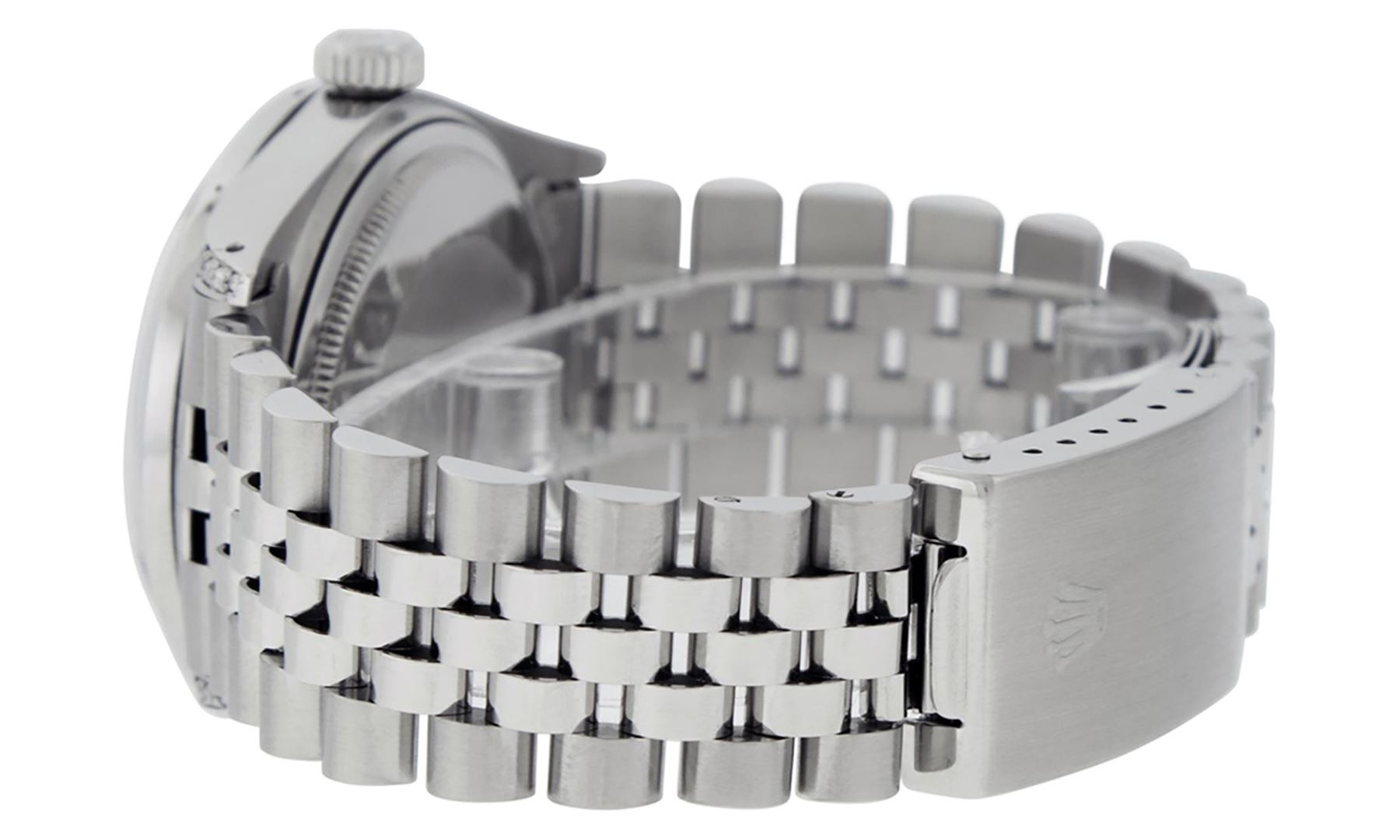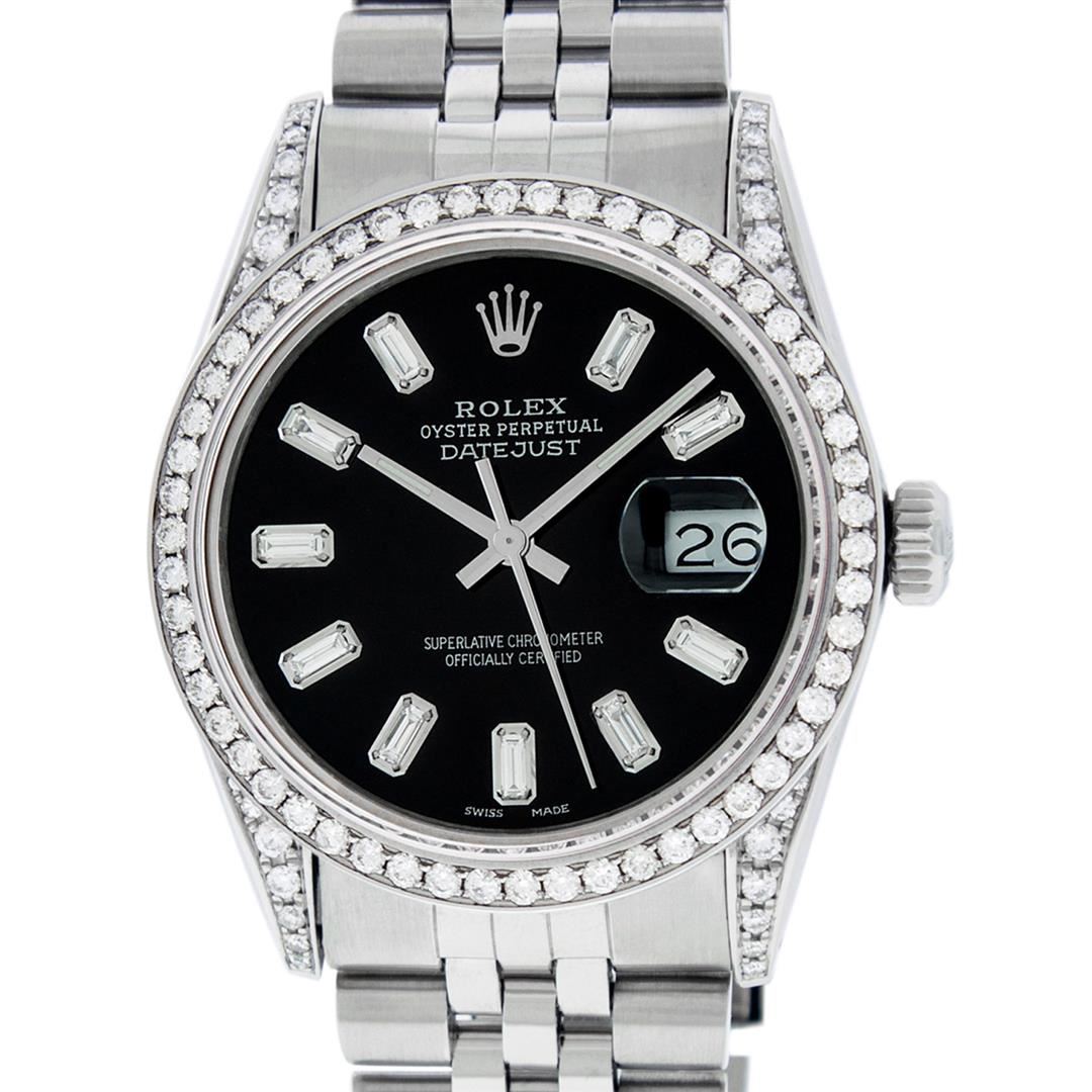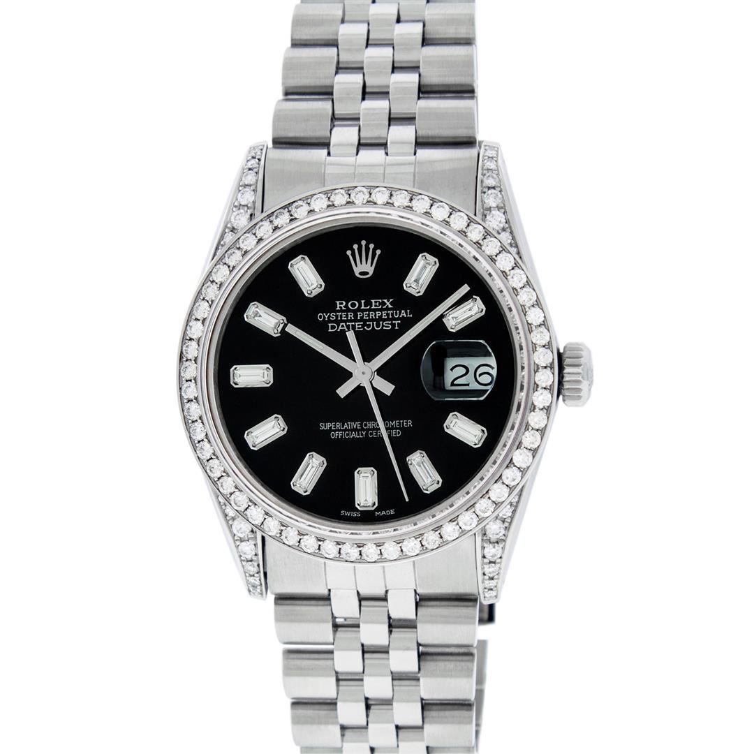 One Mens Rolex Datejust Polished Bright with Satin Finish, Serviced & Electronically Tested, Stainless Steel Case: 36mm, Custom Diamond Lugs: 28 Diamonds On Lugs, Color: G to H, Clarity: SI-VS. Stainless Steel Crown, Custom Bezel: New Stainless Diamond Beadset Bezel, Diamond Count: 54 Diamonds On Bezel, Total Weight 1.00 Carat, Clarity: SI-VS, Color: G to H. New Custom Crystal: Scratch Resistant Synthetic Sapphire Cyclops Lens. Custom Hands: New Luminescent Hands. Movement: Automatic Winding Movement. Custom Dial: Black With Baguette Diamond Hour Markers, Stone Count: 10 Baguette Diamonds In Dial, Diamond Color: G To H In Color, Clarity: VS. Date Window: 3 O'Clock Position Date Display, Quickset, Model: Datejust Condition: G-6 Extra Fine. Bracelet: Stainless Steel Jubilee Band. Bright Polish & Satin Finish. 7.0 Inch Length, Adjustable. Standard Clasp, With Rolex Logo. This Watch Has Been Serviced And Polished And Its Free Of All Dents And Scratches.