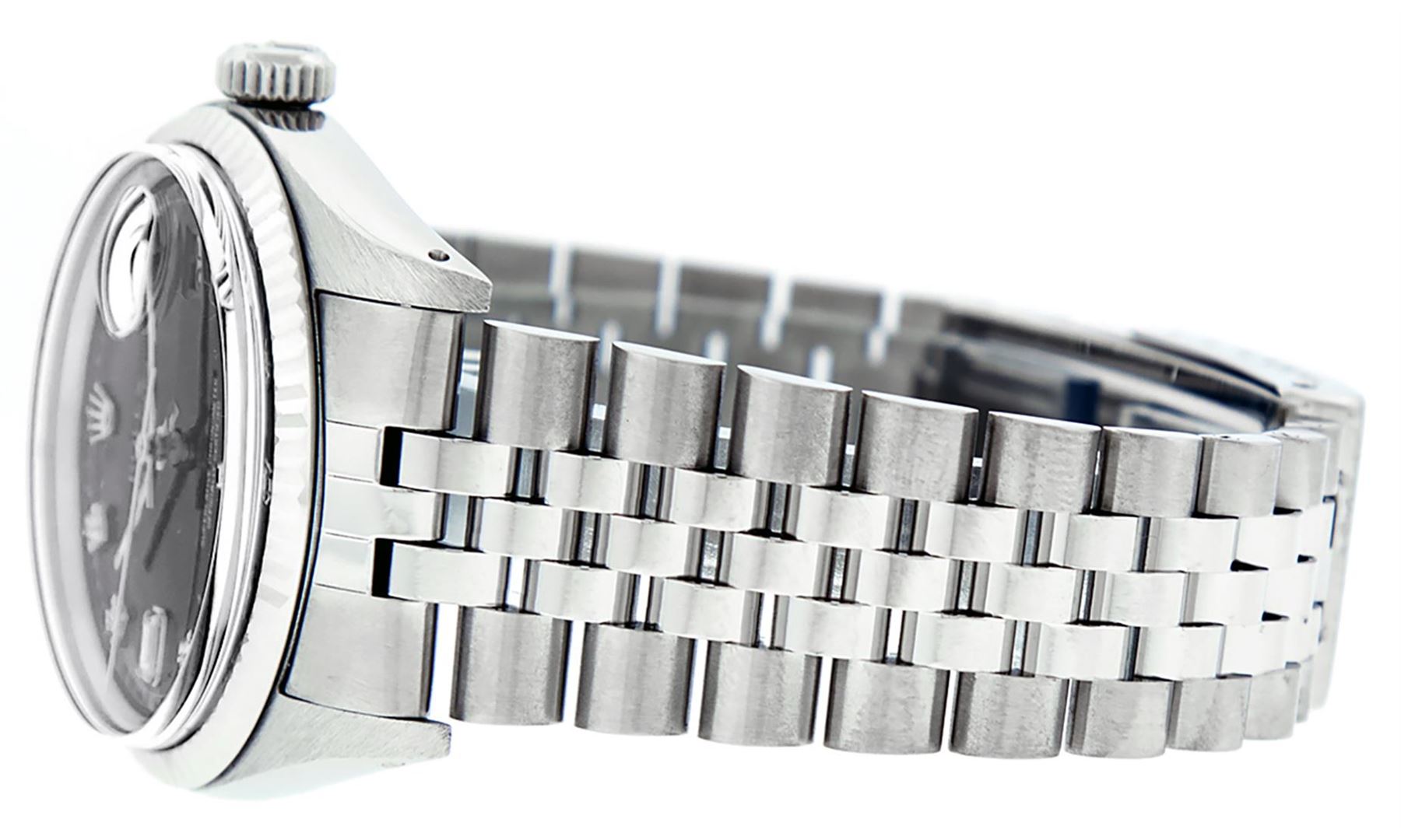One Mens Pre Owned Stainless Steel Rolex Datejust Polished Bright with Satin Finish, This Watch Has Been Serviced & Electronically Tested, Rolex Stainless Steel Case: 36mm, Rolex Stainless Steel Crown, Rolex Bezel: 14K White Gold Fluted Bezel. Custom Crystal: New Acrylic Cyclops Lens. Custom Hands: New Luminescent Hands. Rolex Movement: Automatic Winding Movement. Custom Dial: Refinished To Black With Custom Added Diamonds 8 + 2 Dial With Roman Track, Diamond Count: 8 Diamonds + 2 Baguettes in Dial G To H In Color, SI-VS Clarity. Date Window: 3 O'Clock Position Date Display, Quickset, Model: Datejust, Condition: G-6 Extra Fine. Rolex Bracelet: Stainless Steel Jubilee Band. Bright Polish & Satin Finish. 7.0 Inch Length, Adjustable. Standard Clasp, With Rolex Logo. This Watch Has Been Serviced Time Tested And Is In Excellent Condition It Is Free Of All Scratches And Dents.