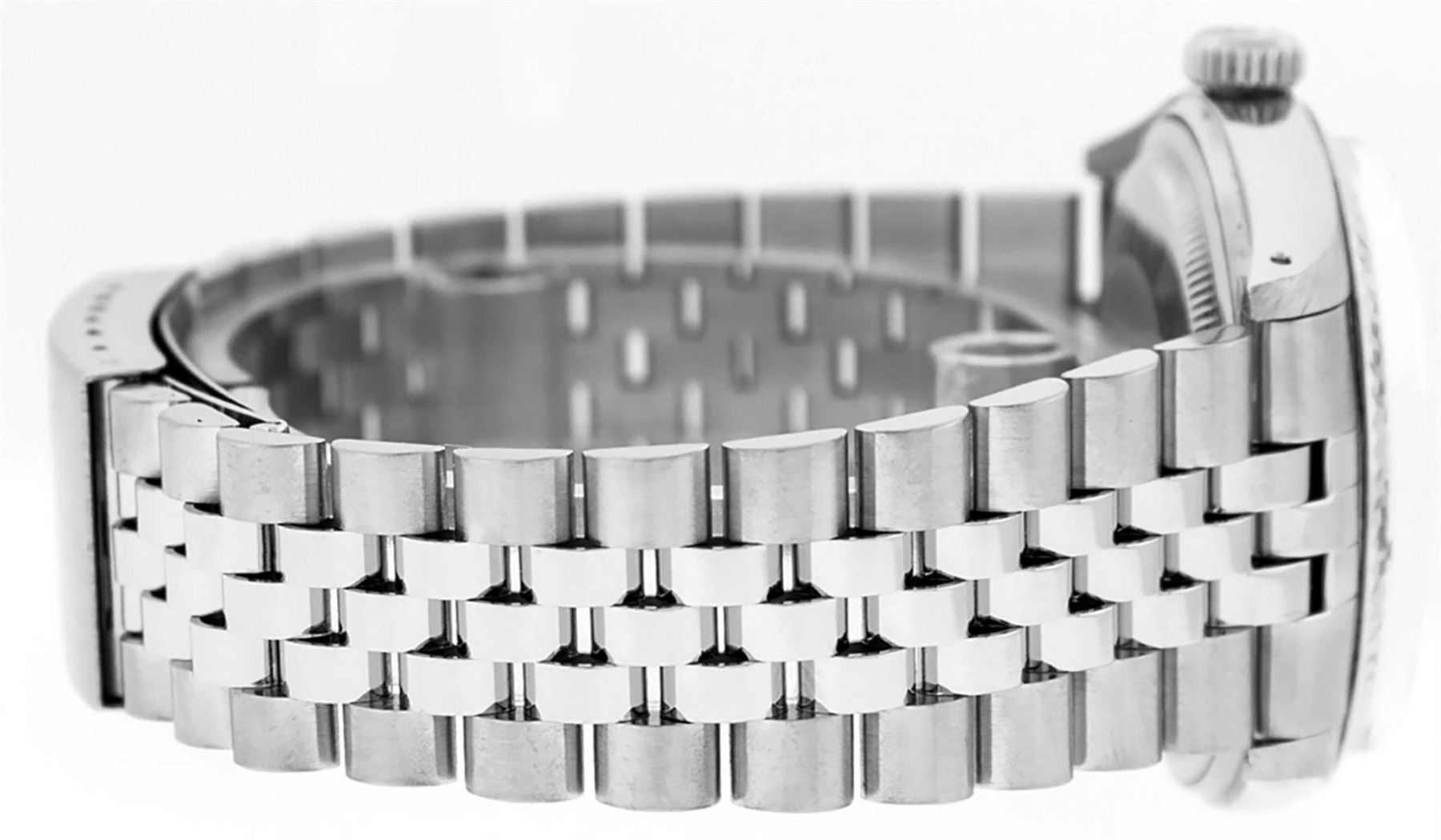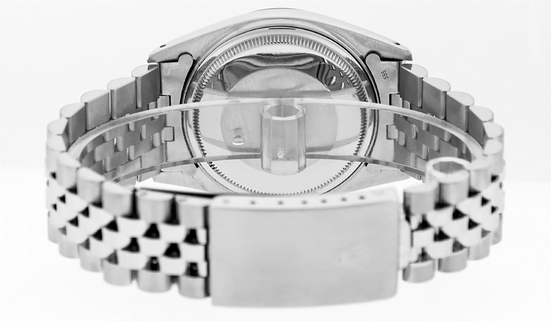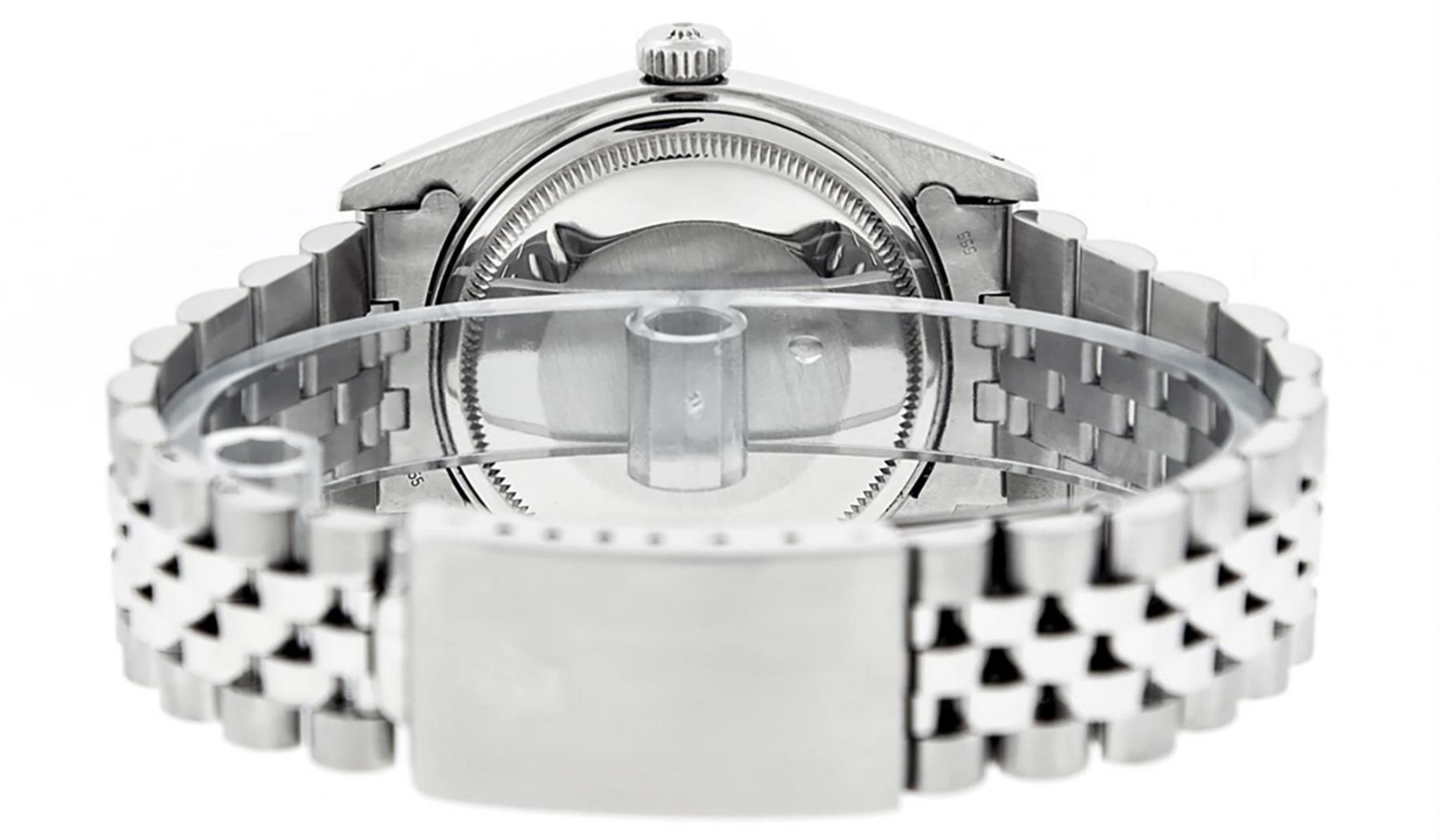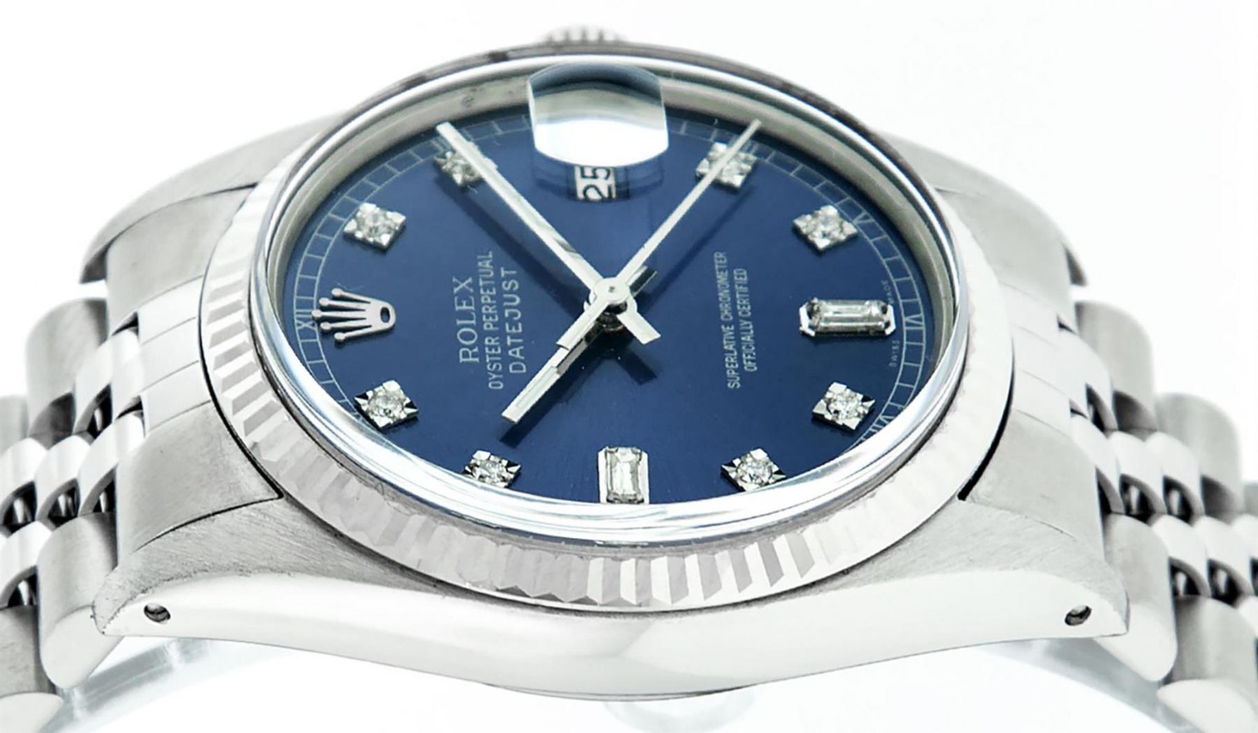 One Mens Stainless Steel Rolex Datejust Polished Bright with Satin Finish, This Watch Has Been Serviced & Electronically Tested, Stainless Steel Case: 36mm, Stainless Steel Crown, Bezel: 14K White Gold Fluted Bezel. Custom Crystal: New Acrylic Cyclops Lens. Custom Hands: New Luminescent Hands. Movement: Automatic Winding Movement. Custom Dial: Blue Diamond Dial With Diamond Hour Markers, Diamond Count: 8 Diamonds + 2 Diamond Baguettes in Dial, G To H In Color, SI-VS Clarity. Date Window: 3 O'Clock Position Date Display, Quickset, Model: Datejust, Condition: G-6 Extra Fine. Bracelet: Stainless Steel Jubilee. Bright Polish & Satin Finish. 7.0 Inch Length, Adjustable. Standard Clasp, With Rolex Logo. This Watch Has Been Serviced Time Tested And Is In Excellent Condition It Is Free Of All Scratches And Dents