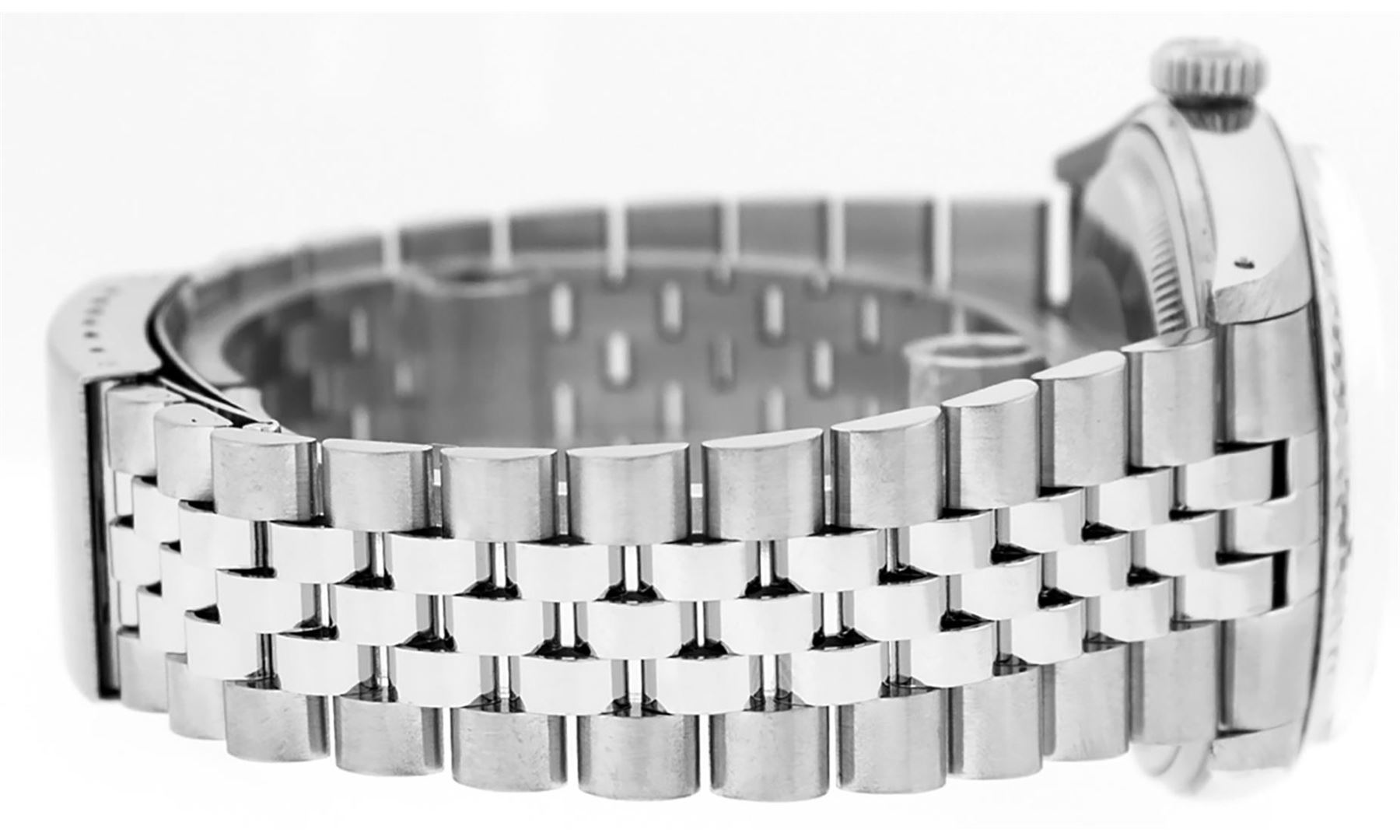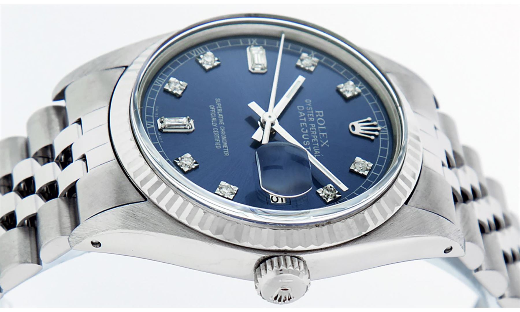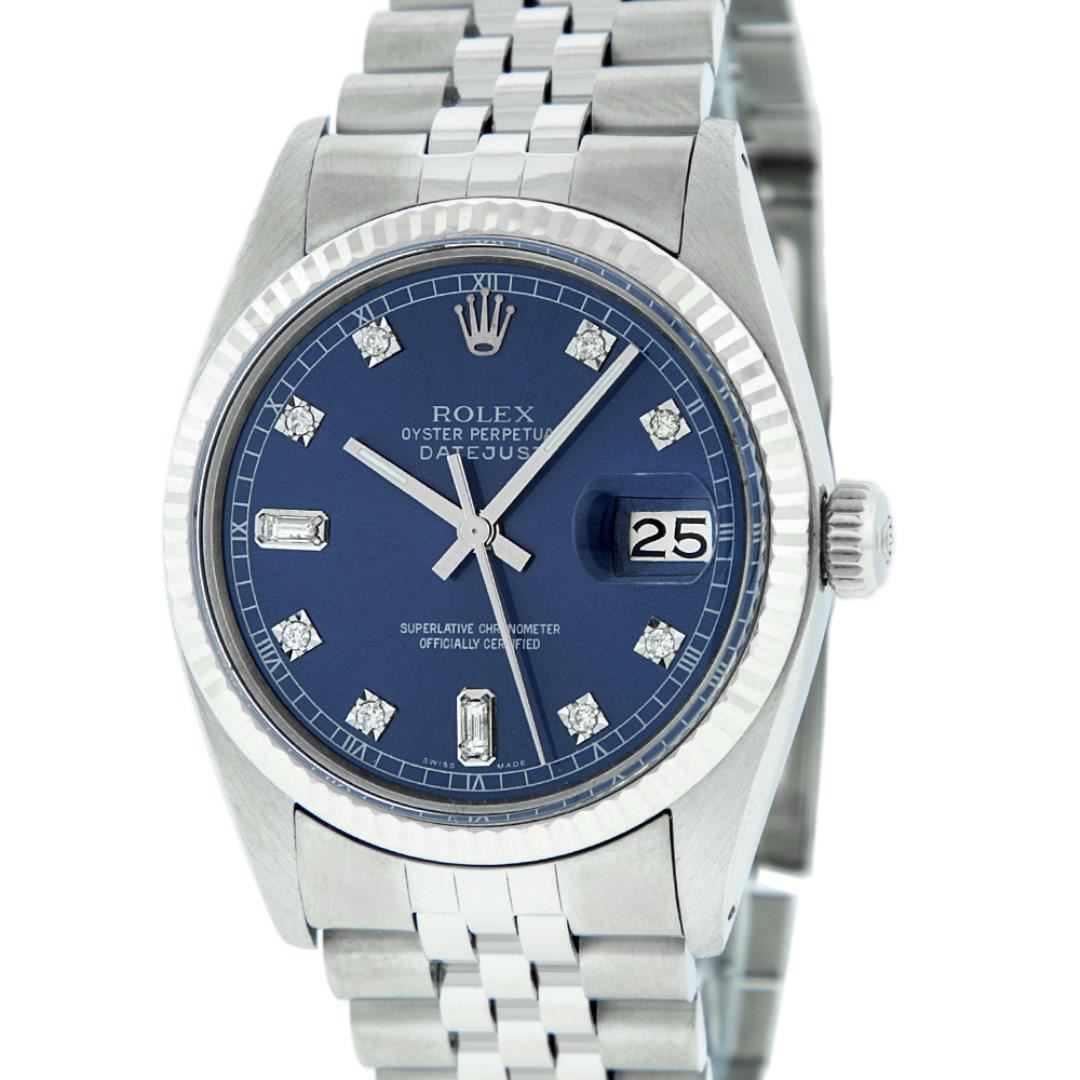 One Mens Pre Owned Stainless Steel Rolex Datejust Polished Bright with Satin Finish, This Watch Has Been Serviced And Electronically Tested, Rolex Stainless Steel Case: 36mm, Rolex Stainless Steel Crown, Rolex Bezel: 14K White Gold Fluted Bezel. Custom Crystal: New Acrylic With Magnified Date Window. Custom Hands: New Luminescent Hands. Rolex Movement: Automatic Winding Movement 3035. Custom Dial: Custom Blue Dial With Added Diamonds, Diamond Count: 8 Diamonds + 2 Diamond Baguettes in Dial. Date Window: 3 O'Clock Position Date Display, Quickset, Model: Datejust, Condition: G-6 Extra Fine. Rolex Bracelet: Stainless Steel Jubilee Band. Bright Polish And Satin Finish. 7.0 Inch Length, Adjustable. Standard Clasp, With Rolex Logo. This Watch Has Been Serviced Time Tested And Is In Excellent Condition It Is Free Of All Scratches And Dents.