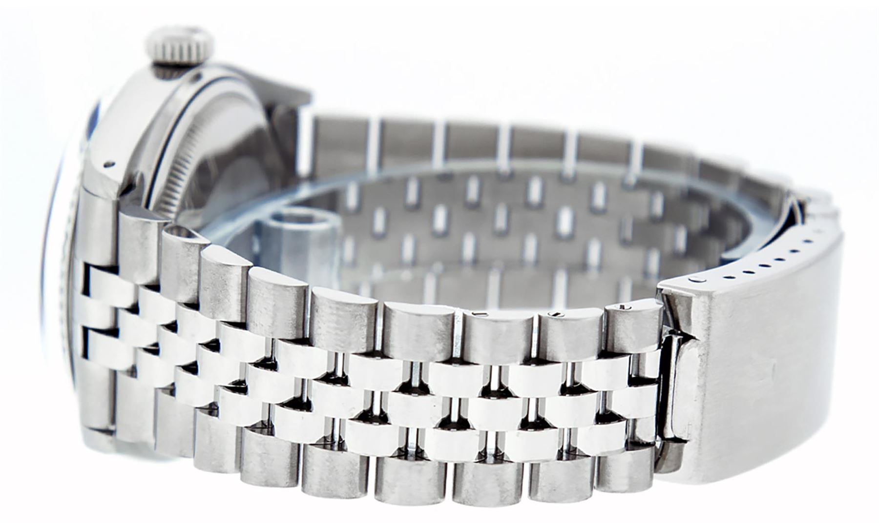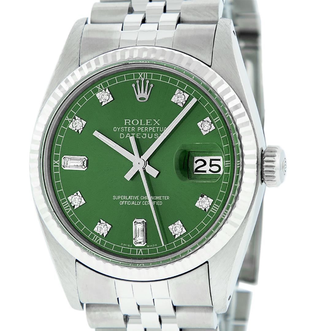 One Mens Pre Owned Rolex Stainless Steel Rolex Datejust Polished Bright with Satin Finish, This Watch Has Been Serviced & Electronically Tested, Stainless Steel Case: 36mm, Rolex Stainless Steel Crown, Rolex Bezel: 14K White Gold Fluted Bezel. Custom Crystal: New Acrylic Cyclops Lens. Custom Hands: New Luminescent Hands. Rolex Movement: Automatic Winding Movement. Custom Dial: Refinished To Green With Added Diamonds 8 + 2 Dial With Roman Track, Diamond Count: 8 Diamonds + 2 Diamond Baguettes In Dial G To H In Color, SI-VS Clarity. Date Window: 3 O'Clock Position Date Display, Quickset, Model: Datejust, Condition: G-6 Extra Fine. Rolex Bracelet: Stainless Steel Jubilee Band. Bright Polish & Satin Finish. 7.0 Inch Length, Adjustable. Standard Clasp, With Rolex Logo. This Watch Has Been Serviced Time Tested And Is In Excellent Condition It Is Free Of All Scratches And Dents.
