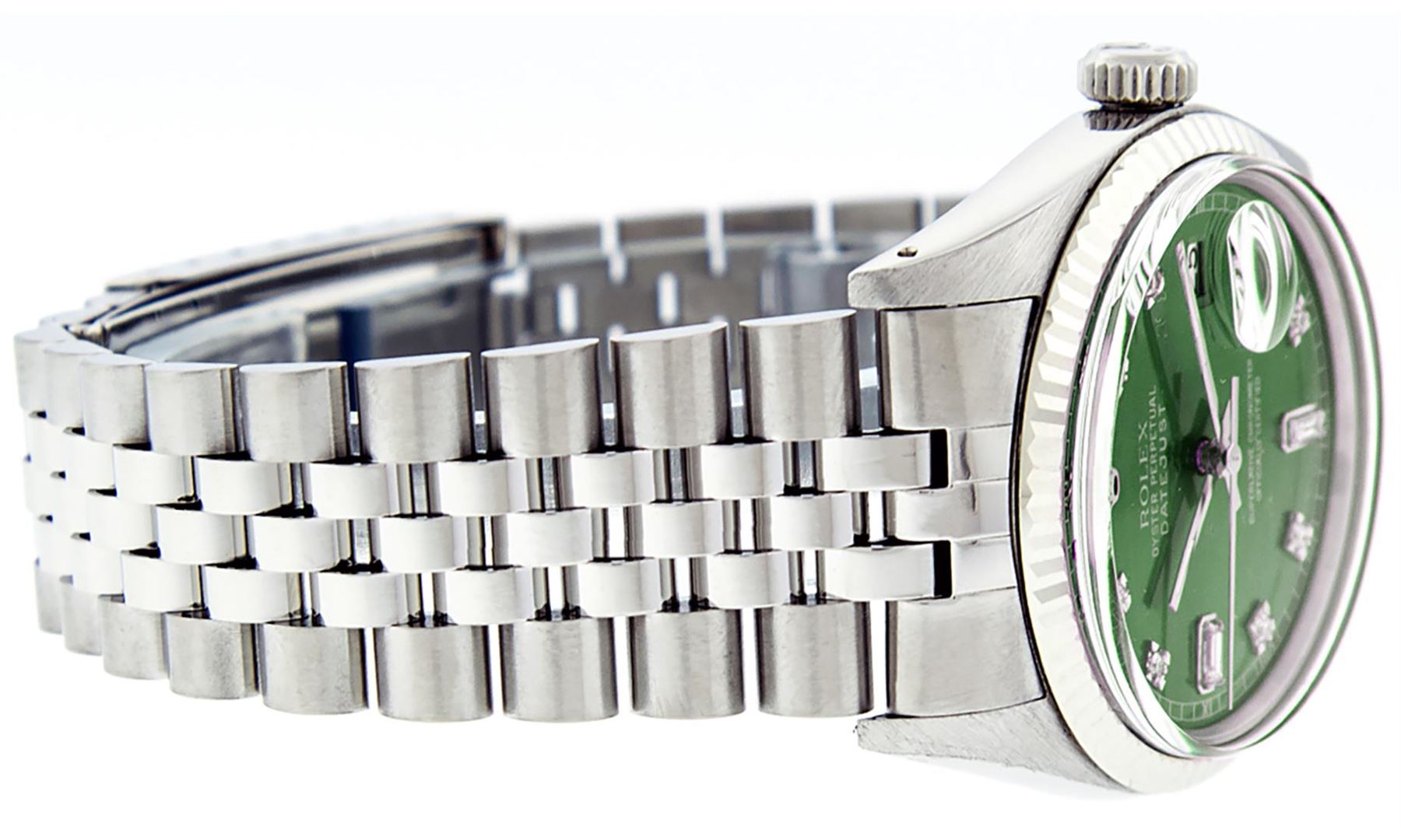 One Mens Pre Owned Rolex Stainless Steel Rolex Datejust Polished Bright with Satin Finish, This Watch Has Been Serviced & Electronically Tested, Stainless Steel Case: 36mm, Rolex Stainless Steel Crown, Rolex Bezel: 14K White Gold Fluted Bezel. Custom Crystal: New Acrylic Cyclops Lens. Custom Hands: New Luminescent Hands. Rolex Movement: Automatic Winding Movement. Custom Dial: Refinished To Green With Added Diamonds 8 + 2 Dial With Roman Track, Diamond Count: 8 Diamonds + 2 Diamond Baguettes In Dial G To H In Color, SI-VS Clarity. Date Window: 3 O'Clock Position Date Display, Quickset, Model: Datejust, Condition: G-6 Extra Fine. Rolex Bracelet: Stainless Steel Jubilee Band. Bright Polish & Satin Finish. 7.0 Inch Length, Adjustable. Standard Clasp, With Rolex Logo. This Watch Has Been Serviced Time Tested And Is In Excellent Condition It Is Free Of All Scratches And Dents.