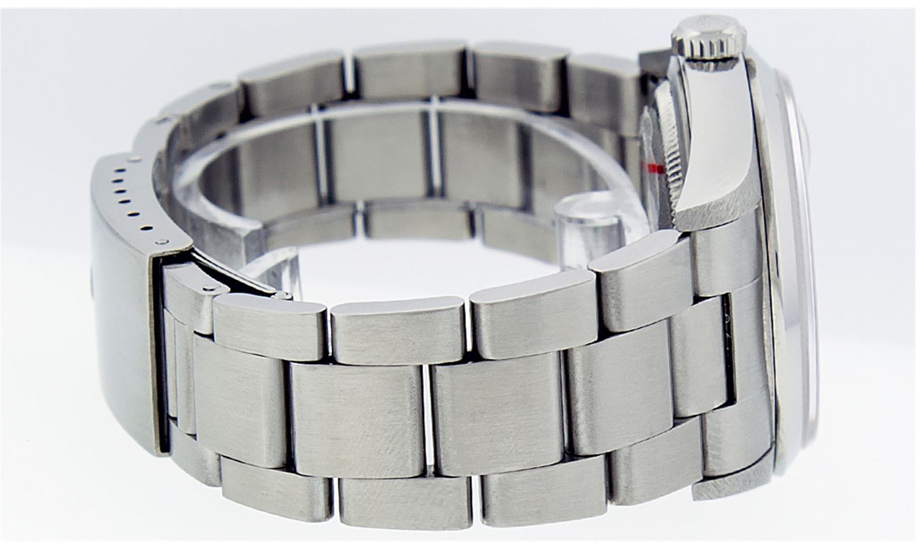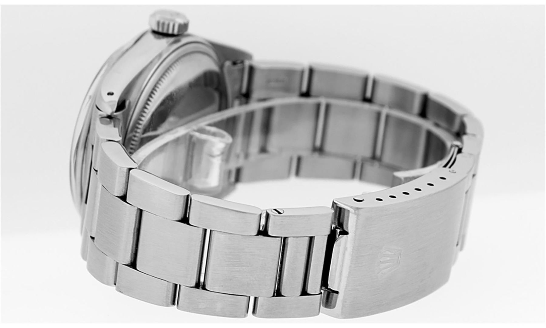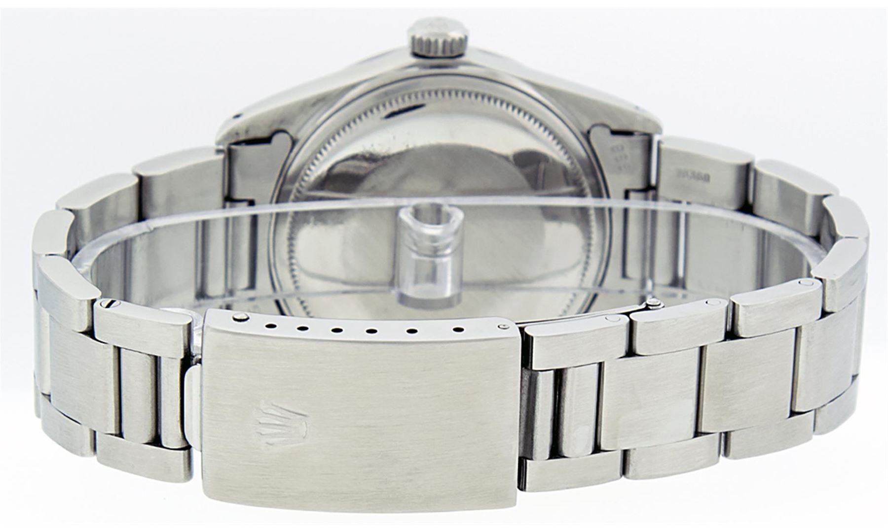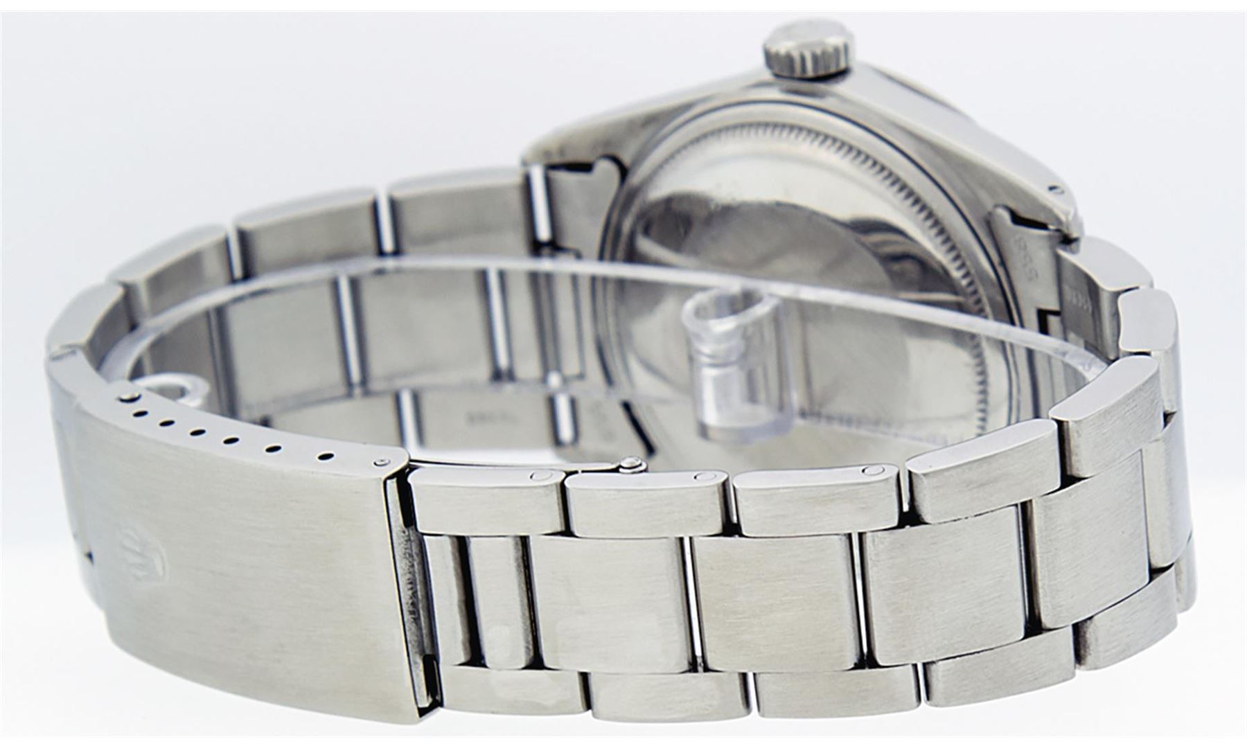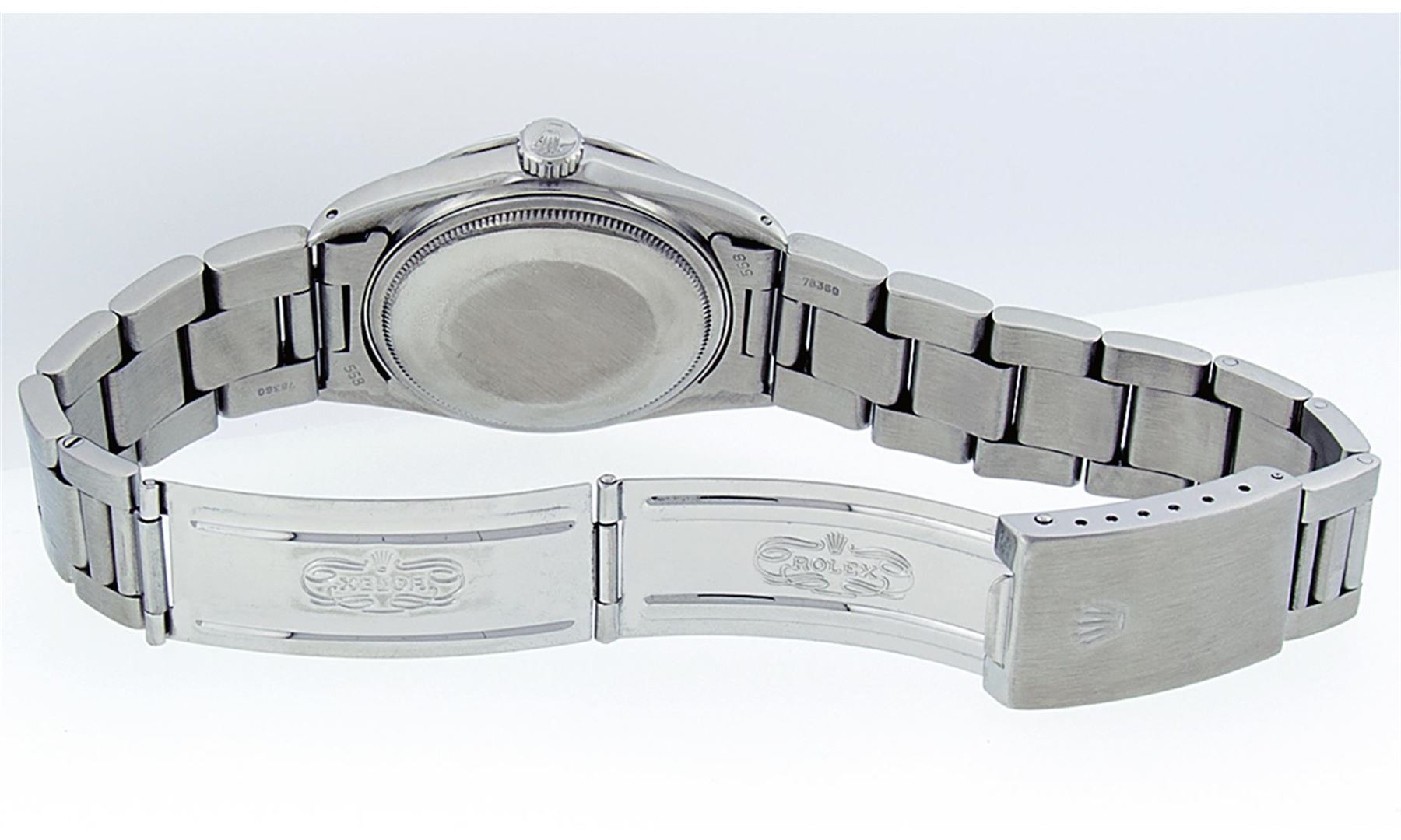 One Mens Stainless Steel Rolex Datejust Polished Bright with Satin Finish, This Watch Has Been Serviced & Electronically Tested, Stainless Steel Case: 36mm, Stainless Steel Crown, Bezel: White Gold Fluted Bezel. Custom Crystal: New Acrylic Cyclops Lens. Custom Hands: New Luminescent Hands. Movement: Automatic Winding Movement. Custom Dial: Meteorite Diamond Dial With Diamond Hour Markers, Diamond Count: 10 Diamonds in Dial G To H In Color, SI-VS Clarity. Date Window: 3 O'Clock Position Date Display, Quickset, Model: Datejust, Condition: G-6 Extra Fine. Bracelet: Stainless Steel Oyster Band. Bright Polish & Satin Finish. 7.0 Inch Length, Adjustable. Standard Clasp, With Rolex Logo. This Watch Has Been Serviced Time Tested And Is In Excellent Condition It Is Free Of All Scratches And Dents