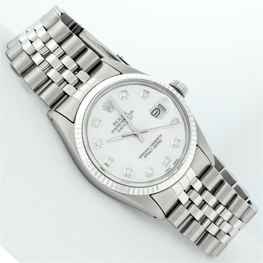 One Mens Pre Owned Stainless Steel Rolex Datejust Polished Bright with Satin Finish, This Watch Has Been Serviced & Electronically Tested, Rolex Stainless Steel Case: 36mm, Rolex Stainless Steel Crown, Rolex Bezel: 14K White Gold Fluted Bezel. Custom Crystal: New Acrylic Cyclops Lens. Custom Hands: New Luminescent Hands. Rolex Movement: Automatic Winding Movement. Custom Dial: Refinished Mother Of Pearl Diamond Dial With Added Diamond Hour Markers, Diamond Count: 10 Diamonds in Dial G To H In Color, SI-VS Clarity. Date Window: 3 O'Clock Position Date Display, Quickset, Model: Datejust, Condition: G-6 Extra Fine. Rolex Bracelet: Stainless Steel Jubilee Band. Bright Polish & Satin Finish. 7.0 Inch Length, Adjustable. Standard Clasp, With Rolex Logo. This Watch Has Been Serviced Time Tested And Is In Excellent Condition It Is Free Of All Scratches And Dents.