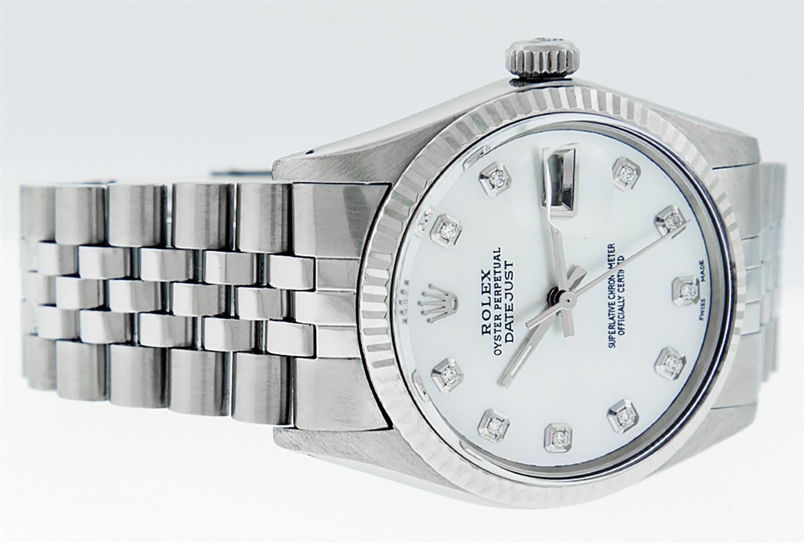 One Mens Pre Owned Stainless Steel Rolex Datejust Polished Bright with Satin Finish, This Watch Has Been Serviced & Electronically Tested, Rolex Stainless Steel Case: 36mm, Rolex Stainless Steel Crown, Rolex Bezel: 14K White Gold Fluted Bezel. Custom Crystal: New Acrylic Cyclops Lens. Custom Hands: New Luminescent Hands. Rolex Movement: Automatic Winding Movement. Custom Dial: Refinished Mother Of Pearl Diamond Dial With Added Diamond Hour Markers, Diamond Count: 10 Diamonds in Dial G To H In Color, SI-VS Clarity. Date Window: 3 O'Clock Position Date Display, Quickset, Model: Datejust, Condition: G-6 Extra Fine. Rolex Bracelet: Stainless Steel Jubilee Band. Bright Polish & Satin Finish. 7.0 Inch Length, Adjustable. Standard Clasp, With Rolex Logo. This Watch Has Been Serviced Time Tested And Is In Excellent Condition It Is Free Of All Scratches And Dents.