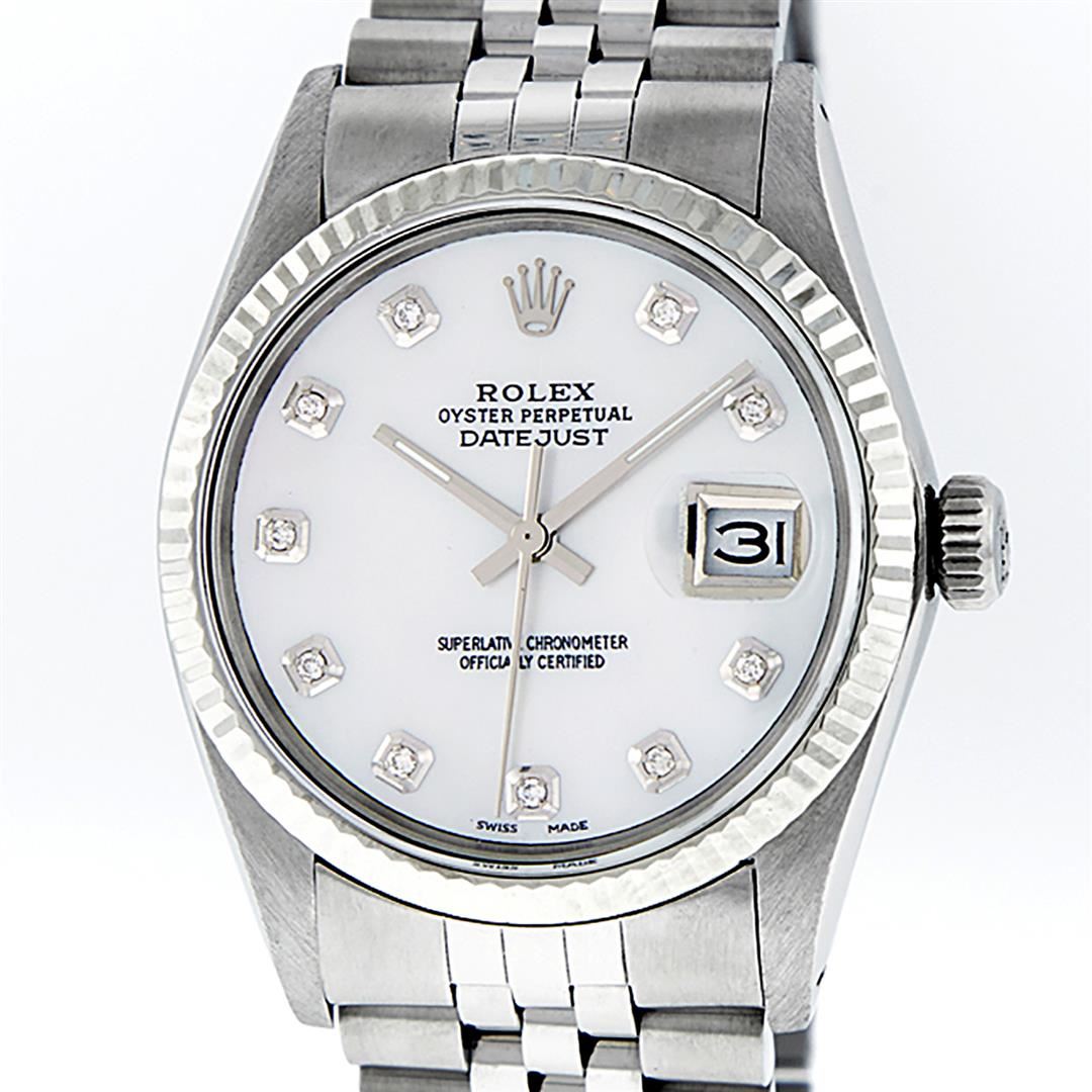 One Mens Pre Owned Stainless Steel Rolex Datejust Polished Bright with Satin Finish, This Watch Has Been Serviced & Electronically Tested, Rolex Stainless Steel Case: 36mm, Rolex Stainless Steel Crown, Rolex Bezel: 14K White Gold Fluted Bezel. Custom Crystal: New Acrylic Cyclops Lens. Custom Hands: New Luminescent Hands. Rolex Movement: Automatic Winding Movement. Custom Dial: Refinished Mother Of Pearl Diamond Dial With Added Diamond Hour Markers, Diamond Count: 10 Diamonds in Dial G To H In Color, SI-VS Clarity. Date Window: 3 O'Clock Position Date Display, Quickset, Model: Datejust, Condition: G-6 Extra Fine. Rolex Bracelet: Stainless Steel Jubilee Band. Bright Polish & Satin Finish. 7.0 Inch Length, Adjustable. Standard Clasp, With Rolex Logo. This Watch Has Been Serviced Time Tested And Is In Excellent Condition It Is Free Of All Scratches And Dents.