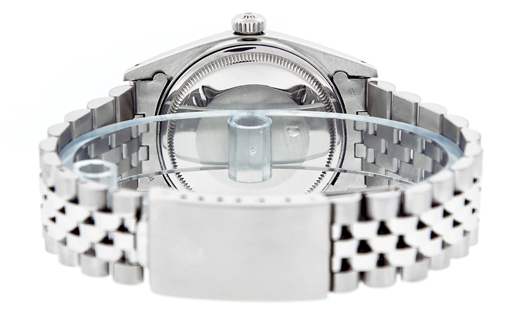 One Mens Stainless Steel Rolex Datejust Polished Bright with Satin Finish, This Watch Has Been Serviced & Electronically Tested, Stainless Steel Case: 36mm, Stainless Steel Crown, Bezel: 14K White Gold Fluted Bezel. Custom Crystal: New Acrylic Cyclops Lens. Custom Hands: New Luminescent Hands. Movement: Automatic Winding Movement. Custom Dial: Dial Refinished To Purple With Custom Added Diamonds 8 + 2 Dial With Roman Track, Diamond Count: 8 Diamonds + 2 Baguettes in Dial G To H In Color, SI-VS Clarity. Date Window: 3 O'Clock Position Date Display, Quickset, Model: Datejust, Condition: G-6 Extra Fine. Bracelet: Stainless Steel Jubilee Band. Bright Polish & Satin Finish. 7.0 Inch Length, Adjustable. Standard Clasp, With Rolex Logo. This Watch Has Been Serviced Time Tested And Is In Excellent Condition It Is Free Of All Scratches And Dents.