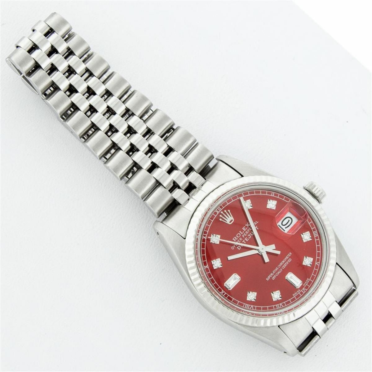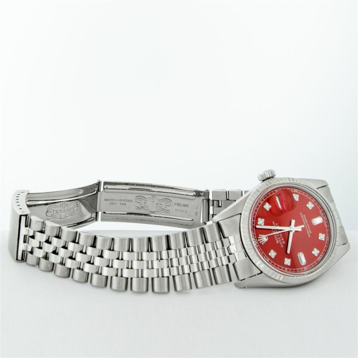 One Mens Stainless Steel Rolex Datejust Polished Bright with Satin Finish, This Watch Has Been Serviced & Electronically Tested, Stainless Steel Case: 36mm, Stainless Steel Crown, Bezel: 14K White Gold Fluted Bezel. Custom Crystal: New Acrylic Cyclops Lens. Custom Hands: New Luminescent Hands. Movement: Automatic Winding Movement. Custom Dial: Red Diamond 8 + 2 Dial With Roman Track, Diamond Count: 8 Diamonds + 2 Baguettes in Dial G To H In Color, SI-VS Clarity. Date Window: 3 O'Clock Position Date Display, Quickset, Model: Datejust, Condition: G-6 Extra Fine. Bracelet: Stainless Steel Jubilee Band. Bright Polish & Satin Finish. 7.0 Inch Length, Adjustable. Standard Clasp, With Rolex Logo. This Watch Has Been Serviced Time Tested And Is In Excellent Condition It Is Free Of All Scratches And Dents.