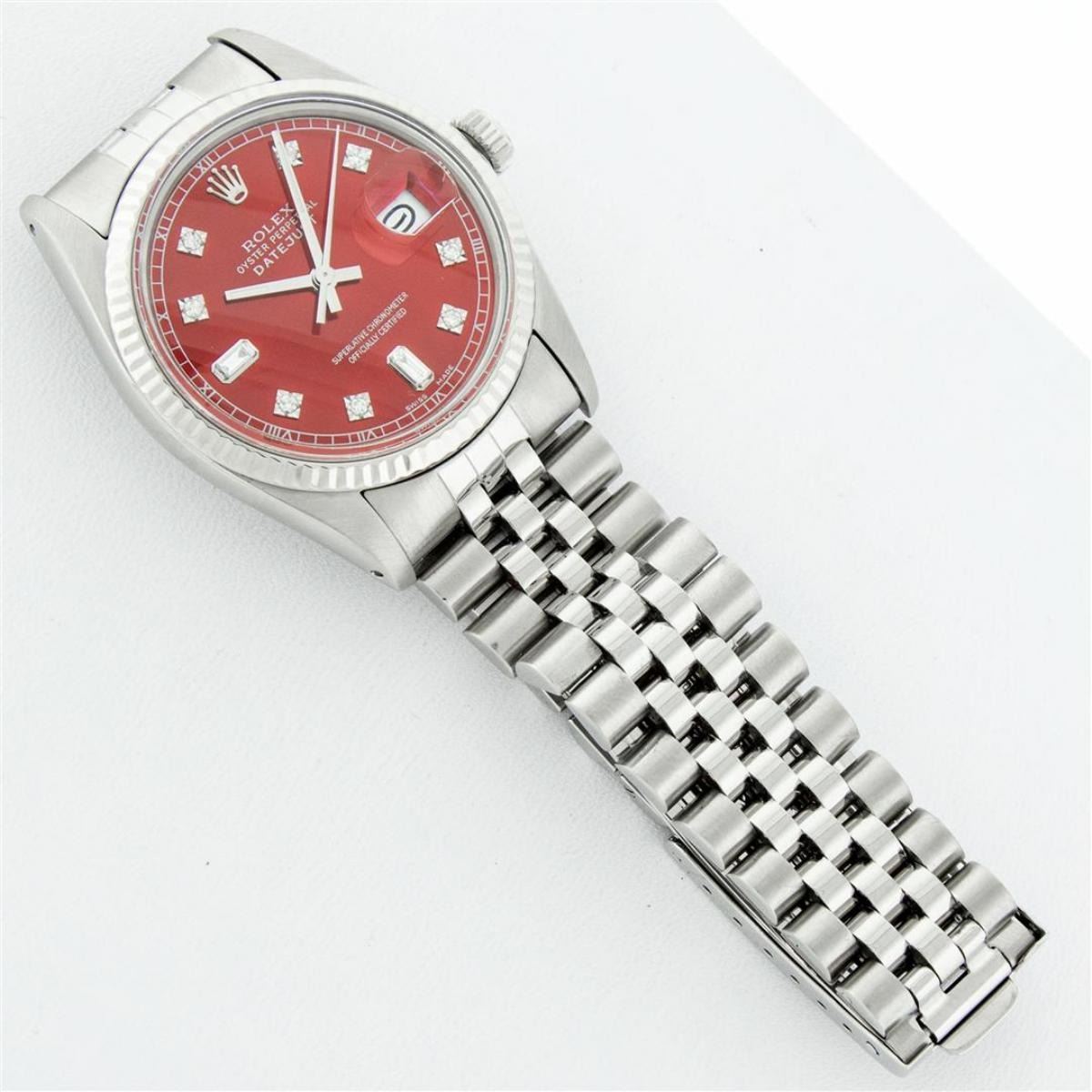 One Mens Stainless Steel Rolex Datejust Polished Bright with Satin Finish, This Watch Has Been Serviced & Electronically Tested, Stainless Steel Case: 36mm, Stainless Steel Crown, Bezel: 14K White Gold Fluted Bezel. Custom Crystal: New Acrylic Cyclops Lens. Custom Hands: New Luminescent Hands. Movement: Automatic Winding Movement. Custom Dial: Red Diamond 8 + 2 Dial With Roman Track, Diamond Count: 8 Diamonds + 2 Baguettes in Dial G To H In Color, SI-VS Clarity. Date Window: 3 O'Clock Position Date Display, Quickset, Model: Datejust, Condition: G-6 Extra Fine. Bracelet: Stainless Steel Jubilee Band. Bright Polish & Satin Finish. 7.0 Inch Length, Adjustable. Standard Clasp, With Rolex Logo. This Watch Has Been Serviced Time Tested And Is In Excellent Condition It Is Free Of All Scratches And Dents.