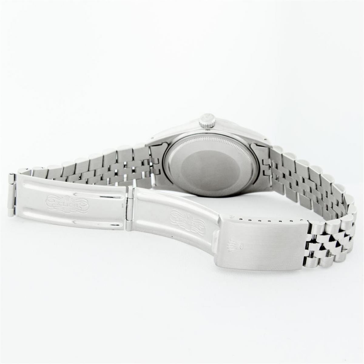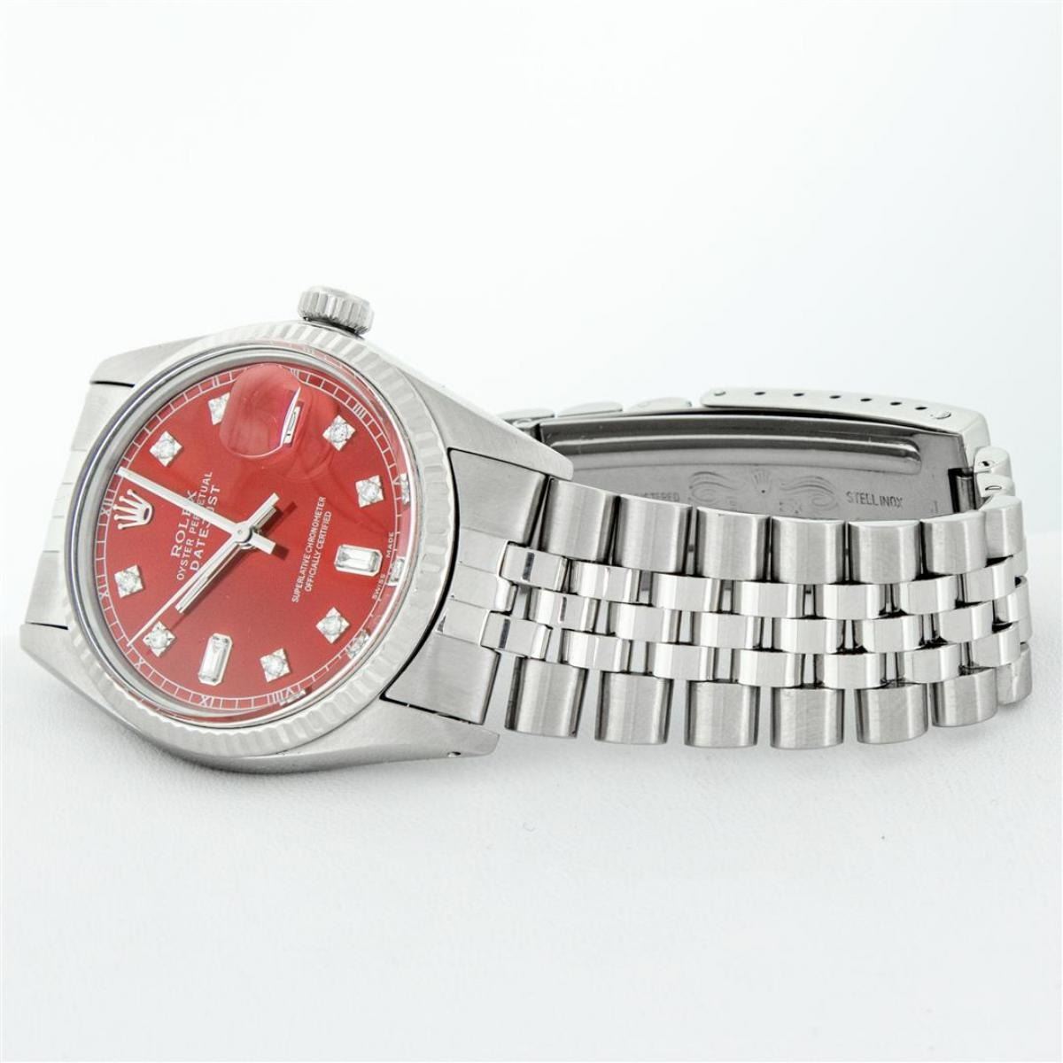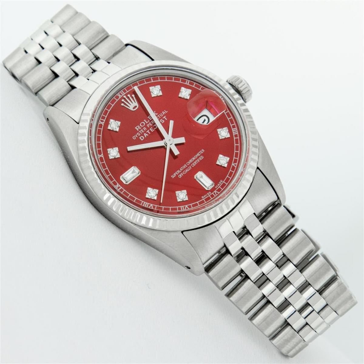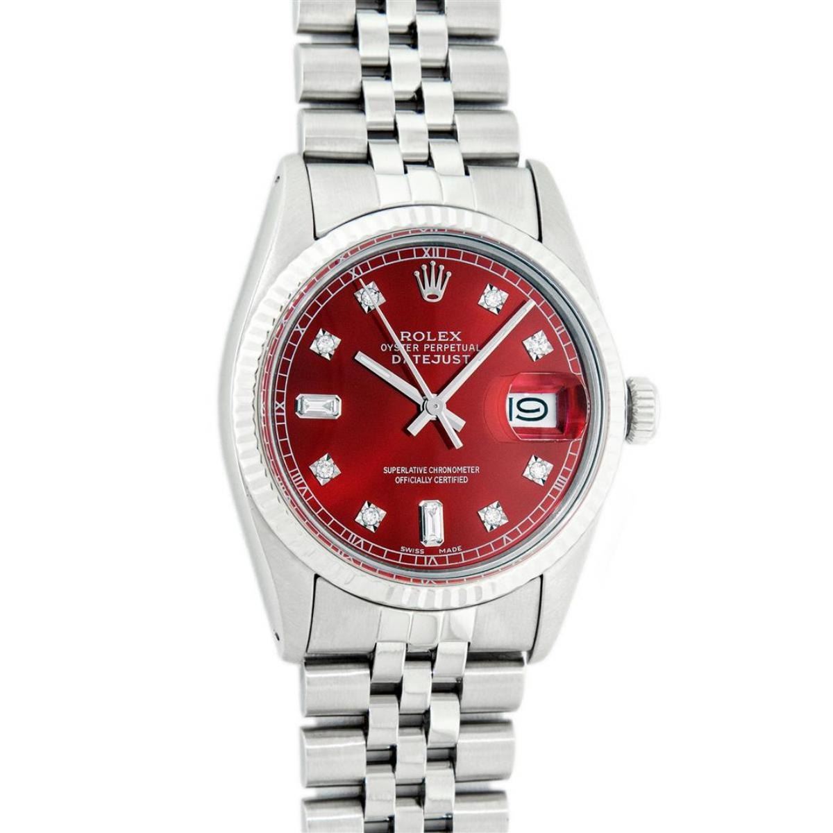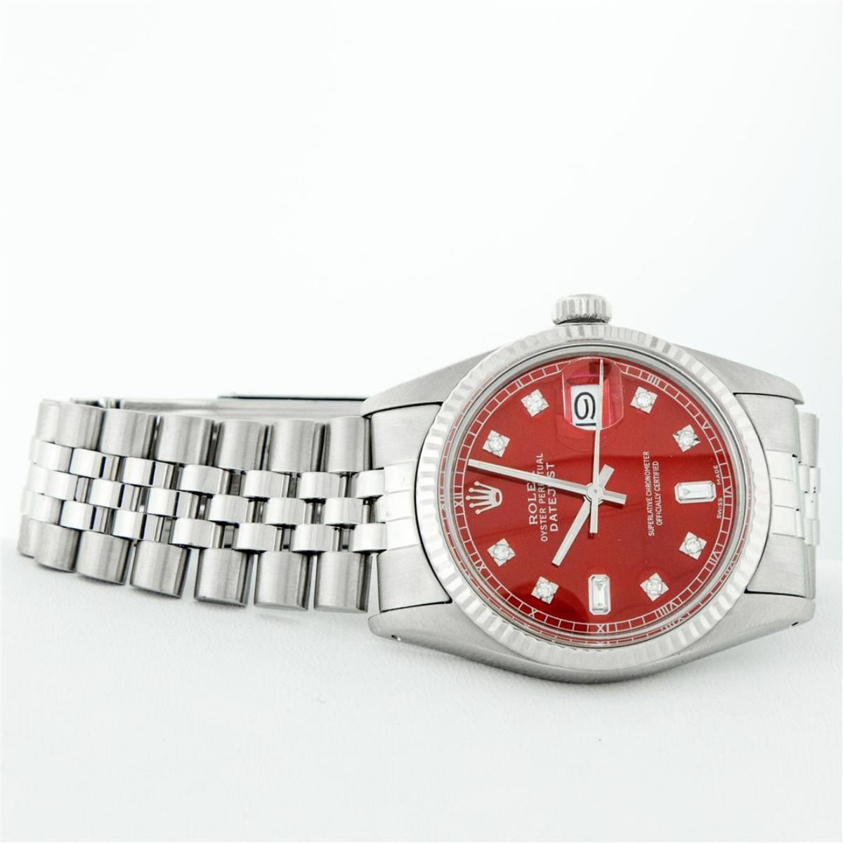 One Mens Stainless Steel Rolex Datejust Polished Bright with Satin Finish, This Watch Has Been Serviced & Electronically Tested, Stainless Steel Case: 36mm, Stainless Steel Crown, Bezel: 14K White Gold Fluted Bezel. Custom Crystal: New Acrylic Cyclops Lens. Custom Hands: New Luminescent Hands. Movement: Automatic Winding Movement. Custom Dial: Red Diamond 8 + 2 Dial With Roman Track, Diamond Count: 8 Diamonds + 2 Baguettes in Dial G To H In Color, SI-VS Clarity. Date Window: 3 O'Clock Position Date Display, Quickset, Model: Datejust, Condition: G-6 Extra Fine. Bracelet: Stainless Steel Jubilee Band. Bright Polish & Satin Finish. 7.0 Inch Length, Adjustable. Standard Clasp, With Rolex Logo. This Watch Has Been Serviced Time Tested And Is In Excellent Condition It Is Free Of All Scratches And Dents.