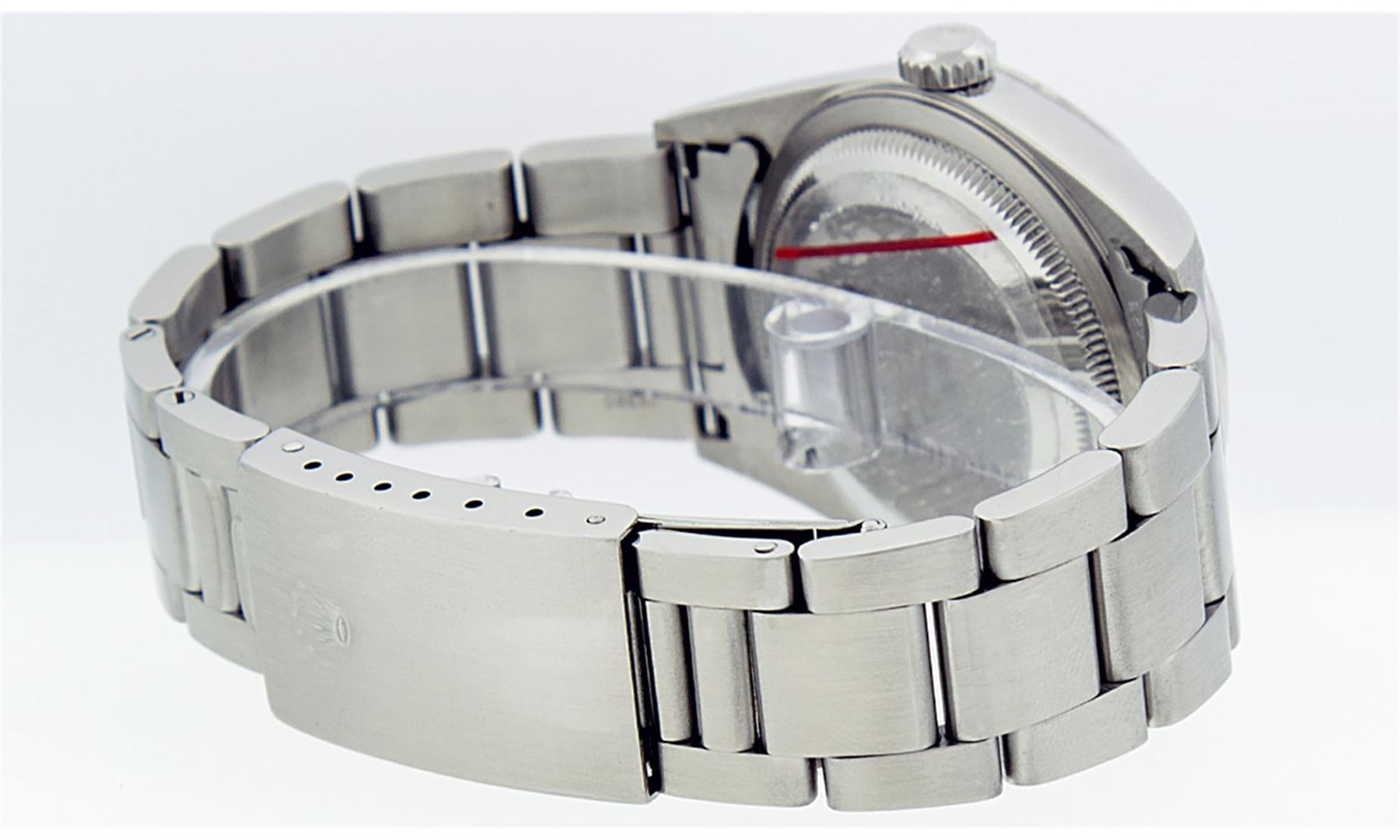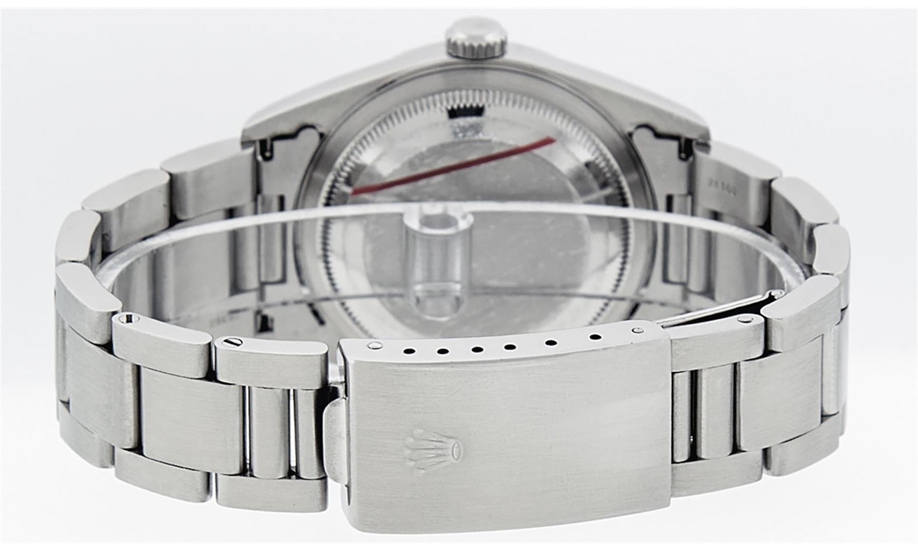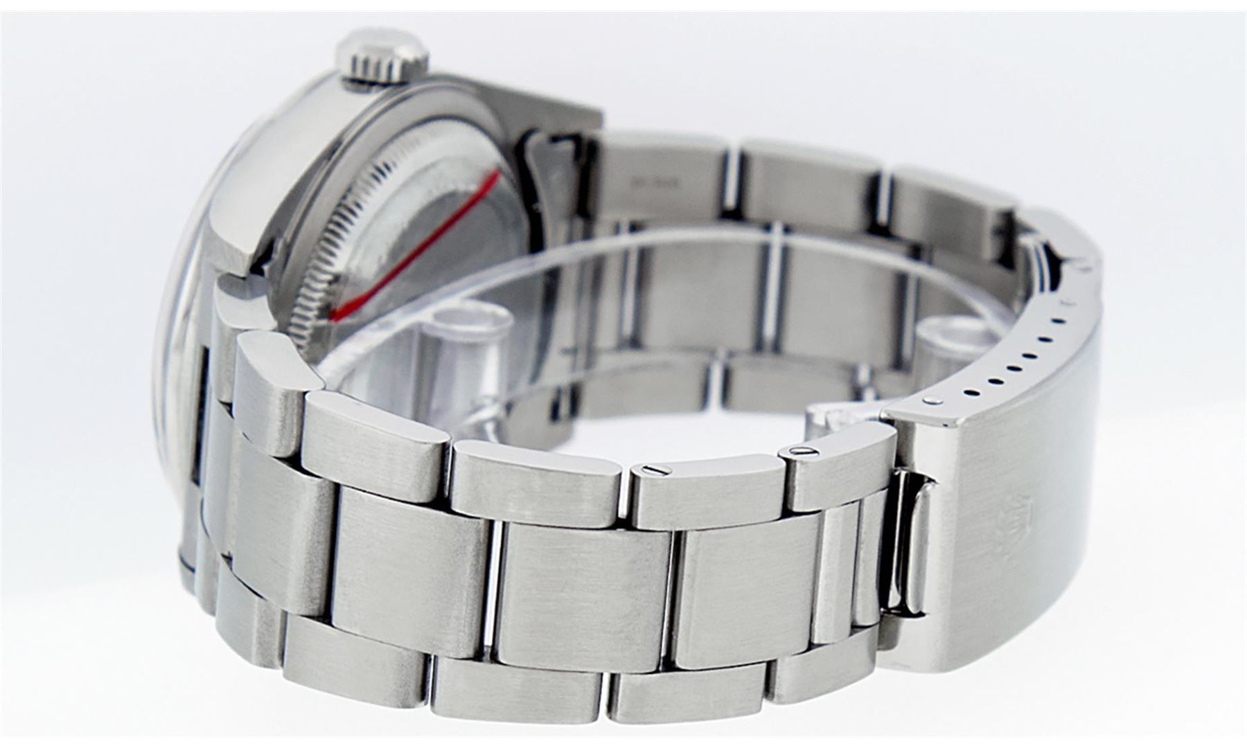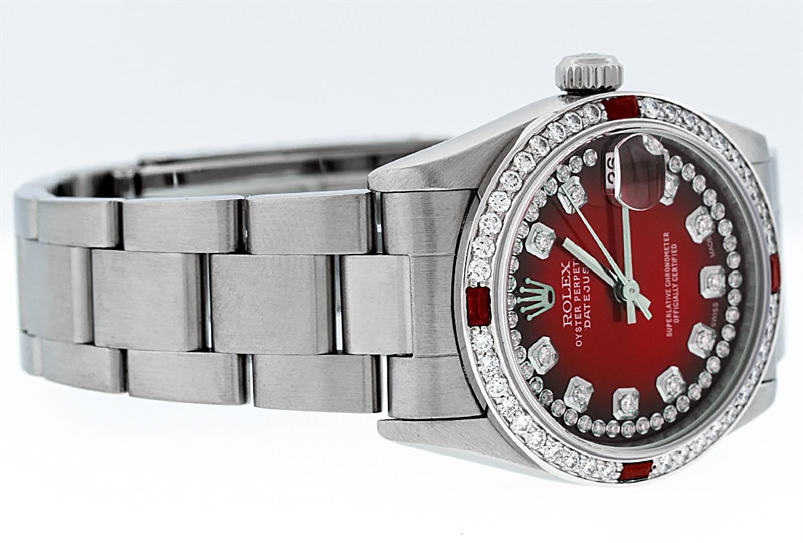 One Mens Pre Owned Rolex Datejust Polished Bright with Satin Finish, Serviced & Electronically Tested, Stainless Steel Case: 36mm, Stainless Steel Crown, Custom Bezel: New 18K White Gold Diamond + Ruby Beadset, Diamond Count: 36 Diamonds + 4 Rubies. Custom Crystal: New Sapphire With Magnified Date Window. Custom Hands: New Luminescent Hands. Rolex Movement: Automatic Winding Movement Caliber 3135. Custom Dial: Red Vignette String Diamond Dial, Stone Count: 43 Diamonds On Dial. Date Window: 3 O'Clock Position Date Display, Quickset, Model: Datejust Condition: G-6 Extra Fine. Rolex Bracelet: Stainless Steel Oyster Band. Bright Polish & Satin Finish. 7.0 Inch Length, Adjustable. Standard Clasp, With Rolex Logo. This Watch Has Been Serviced And Polished And Its Free Of All Dents And Scratches.