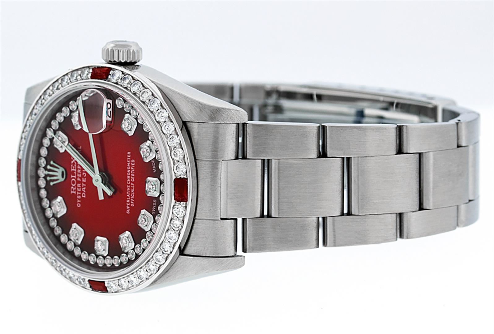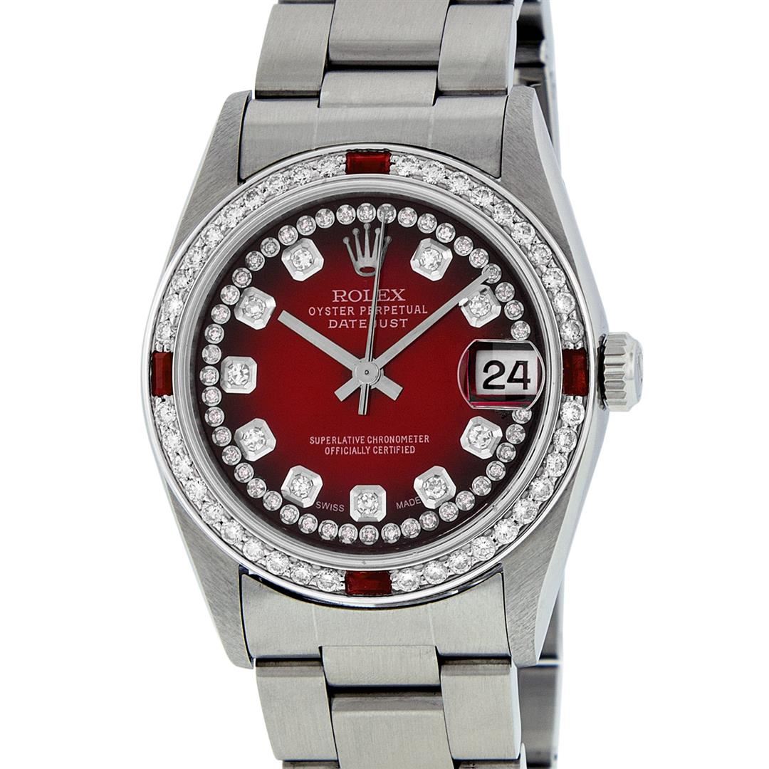 One Mens Pre Owned Rolex Datejust Polished Bright with Satin Finish, Serviced & Electronically Tested, Stainless Steel Case: 36mm, Stainless Steel Crown, Custom Bezel: New 18K White Gold Diamond + Ruby Beadset, Diamond Count: 36 Diamonds + 4 Rubies. Custom Crystal: New Sapphire With Magnified Date Window. Custom Hands: New Luminescent Hands. Rolex Movement: Automatic Winding Movement Caliber 3135. Custom Dial: Red Vignette String Diamond Dial, Stone Count: 43 Diamonds On Dial. Date Window: 3 O'Clock Position Date Display, Quickset, Model: Datejust Condition: G-6 Extra Fine. Rolex Bracelet: Stainless Steel Oyster Band. Bright Polish & Satin Finish. 7.0 Inch Length, Adjustable. Standard Clasp, With Rolex Logo. This Watch Has Been Serviced And Polished And Its Free Of All Dents And Scratches.