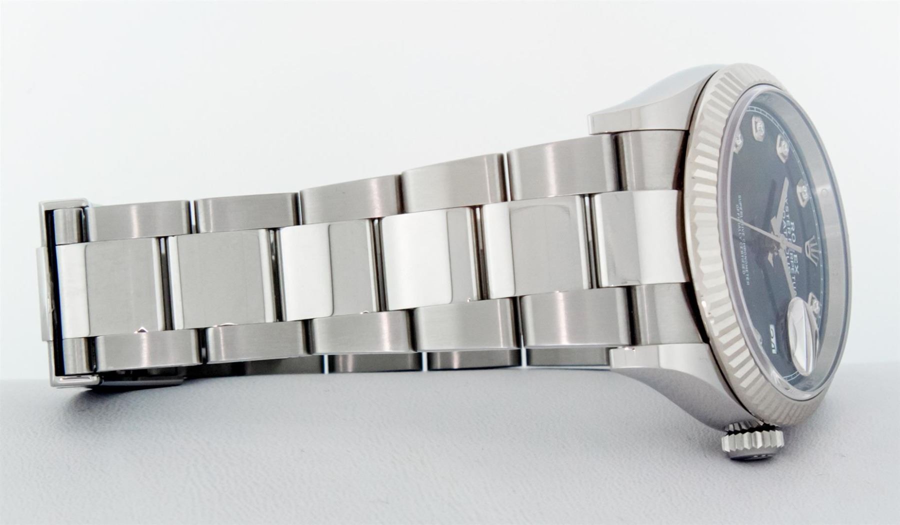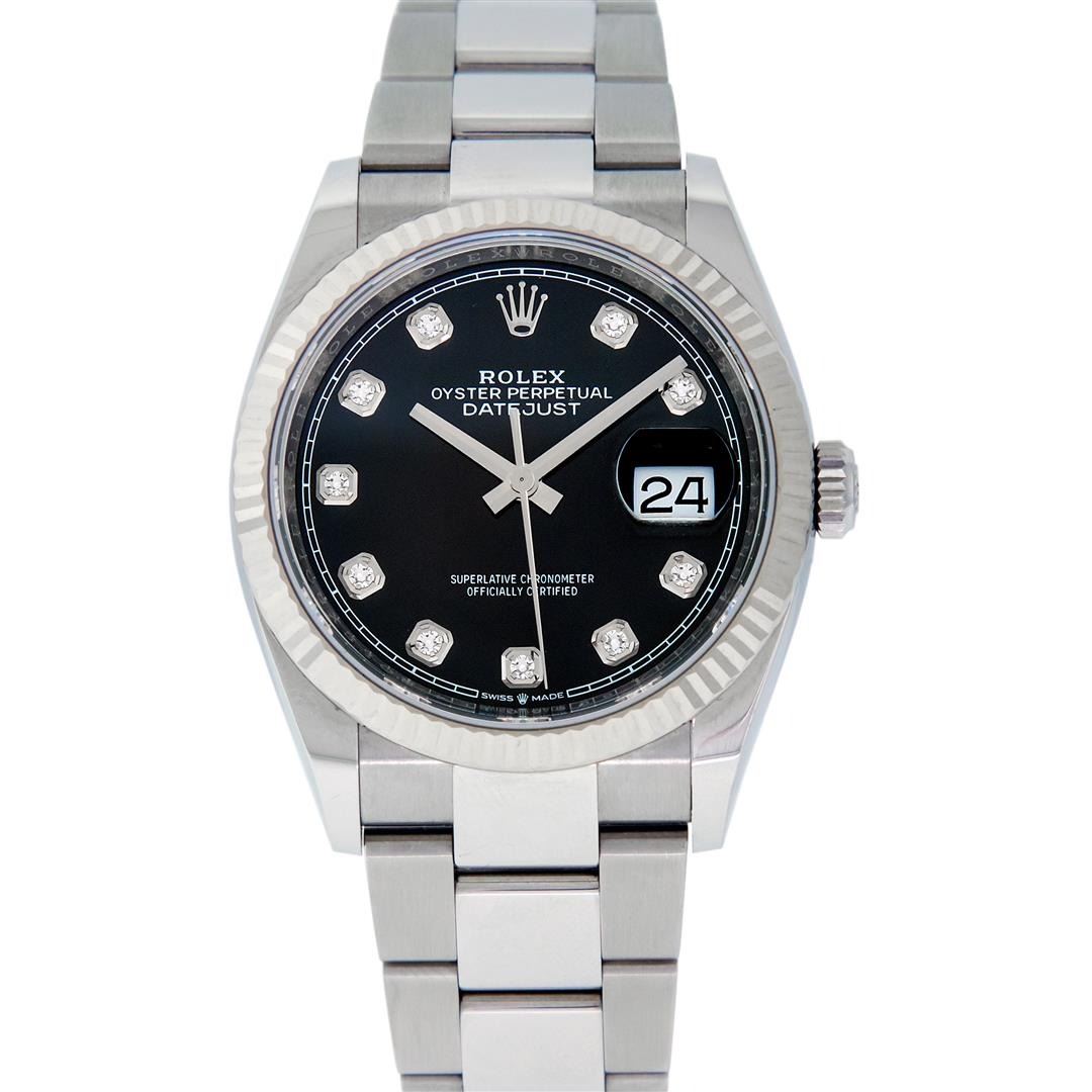 One Mens Pre Owned Rolex Datejust 36MM Polished, Serviced & Electronically Tested, Rolex Stainless Steel Case: 36mm, Stainless Steel Crown, Rolex Bezel: 18K White Gold Fluted Bezel, Crystal: Sapphire With Magnified Date Window. Hands: Solid Hands. Rolex M