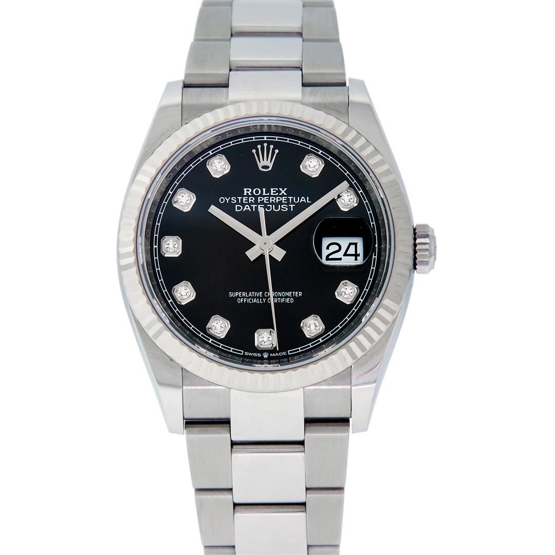One Mens Pre Owned Rolex Datejust 36MM Polished, Serviced & Electronically Tested, Rolex Stainless Steel Case: 36mm, Stainless Steel Crown, Rolex Bezel: 18K White Gold Fluted Bezel, Crystal: Sapphire With Magnified Date Window. Hands: Solid Hands. Rolex Movement: Automatic Winding Movement 3235. Rolex Dial: Black Diamond Dial With Square Track, Diamond Count: 10 Diamonds On Dial, Clarity: VS. Date Window: 3 O'Clock Position Date Display, Quickset, Model: Datejust. Condition: G-6 Extra Fine. Rolex Bracelet: Stainless Steel Oyster Band. Bright Polish & Satin Finish. 7.0 Inch Length, Adjustable. Standard Clasp, With Rolex Logo. This Watch Has Been Serviced Time Tested And Is In Excellent Condition It Is Free Of All Scratches And Dents.