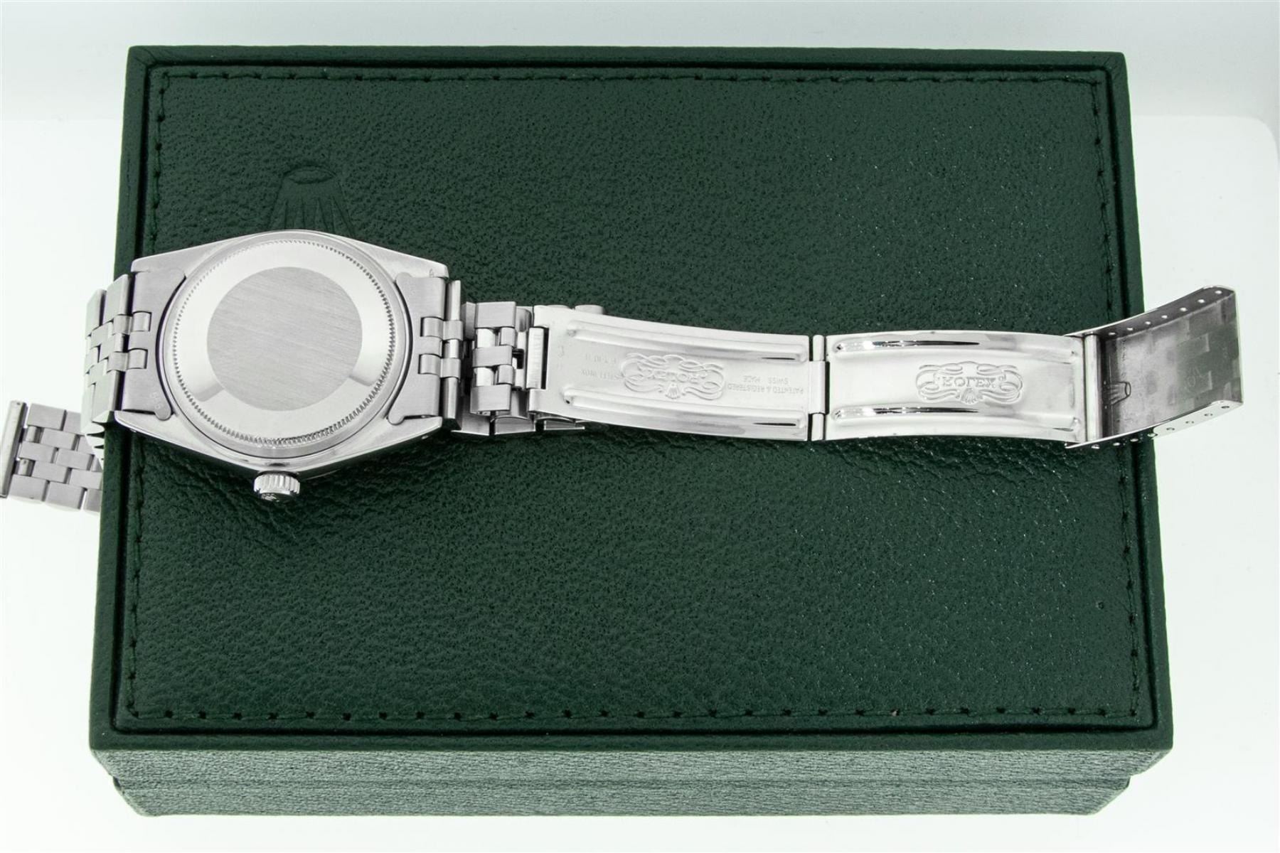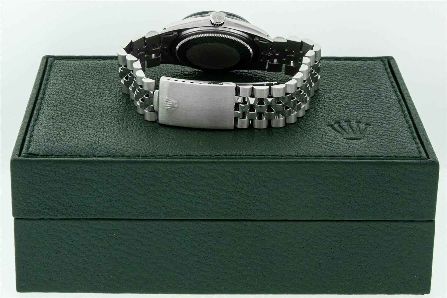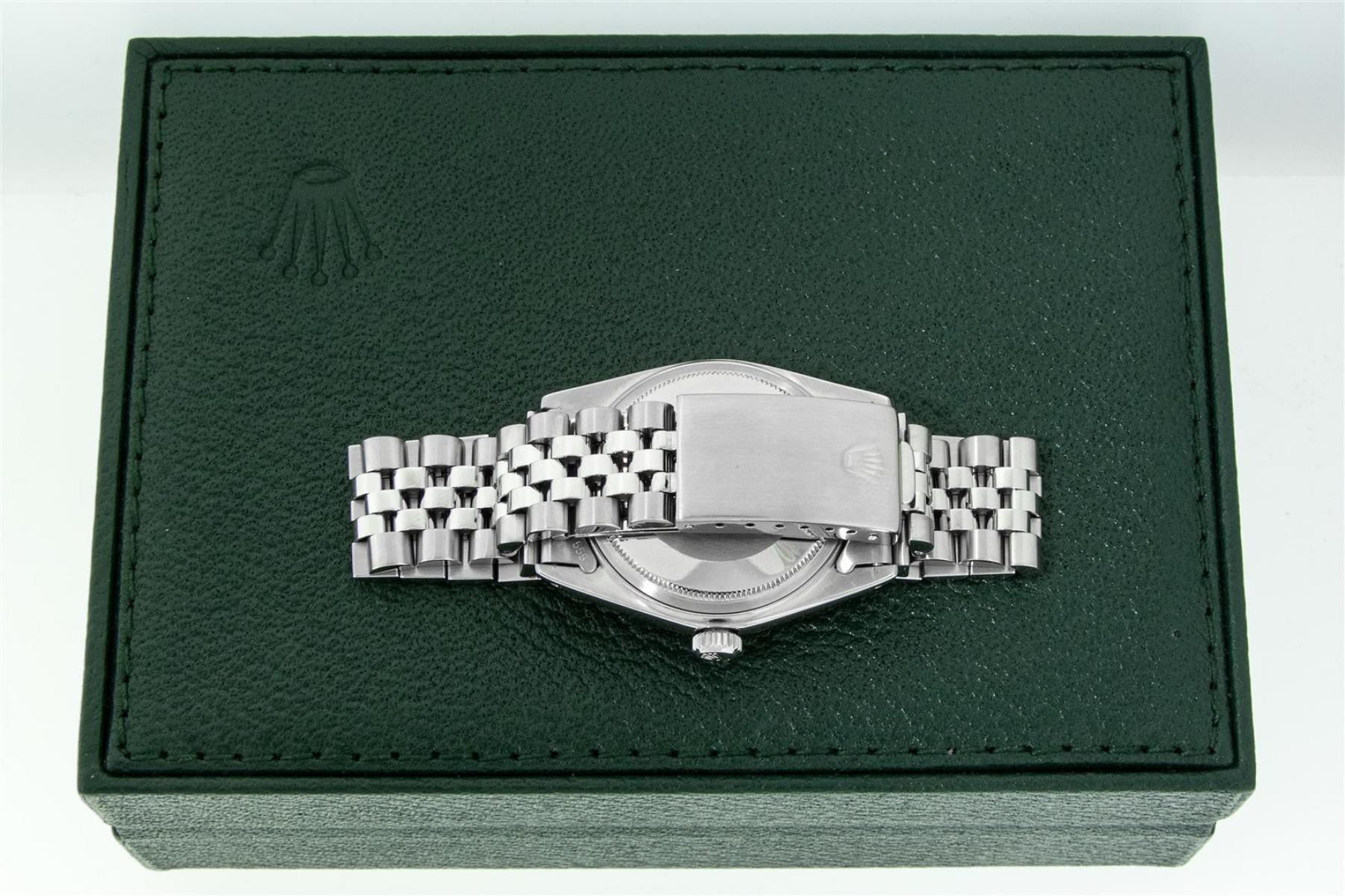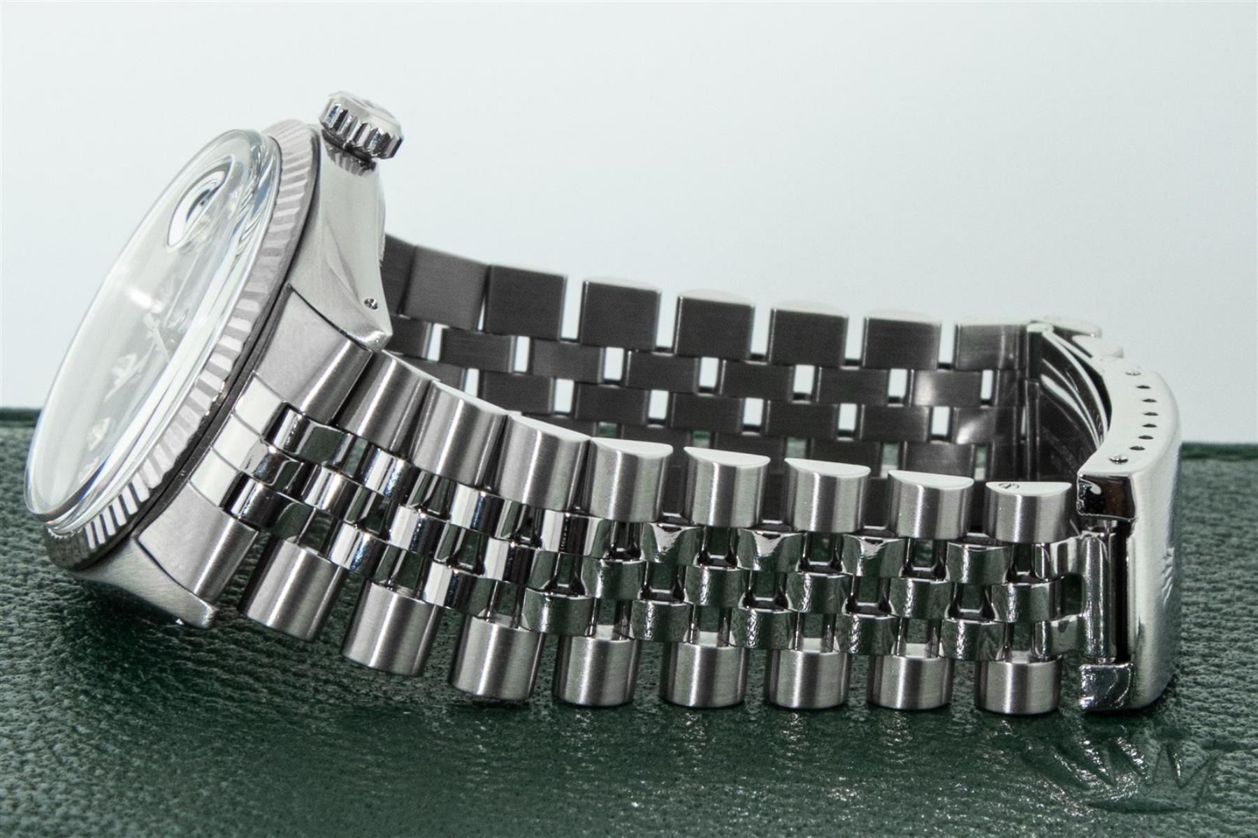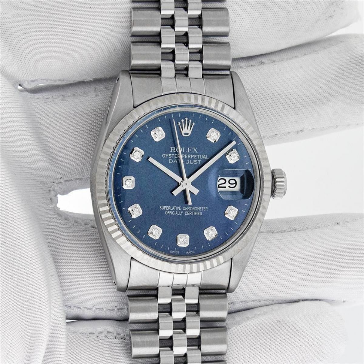 One Mens Stainless Steel Rolex Datejust Polished Bright with Satin Finish, Serviced & Electronically Tested, Stainless Steel Case: 36mm, Stainless Steel Crown, Bezel: New 14K White Gold Fluted Bezel. Custom Crystal: New Acrylic Cyclops Lens. Custom Hands: New Luminescent Hands. Movement: Automatic Winding Movement. Custom Dial: Blue Diamond Dial With Line Track, Diamond Count: 10 Diamond in Dial G To H In Color, SI-VS Clarity. Date Window: 3 O'Clock Position Date Display, Quickset, Model: Datejust, Condition: G-6 Extra Fine. Bracelet: Stainless Steel Jubilee. Bright Polish & Satin Finish. 7.0 Inch Length, Adjustable. Standard Clasp, With Rolex Logo. This Watch Has Been Serviced Time Tested And Is In Excellent Condition It Is Free Of All Scratches And Dents. This Watch Comes With A Rolex Box.