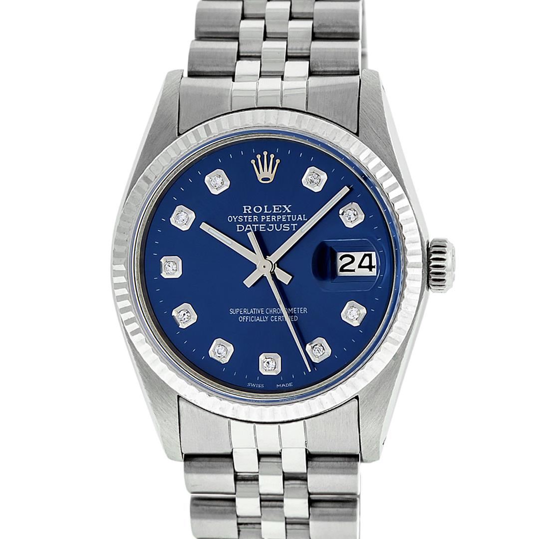 One Mens Stainless Steel Rolex Datejust Polished Bright with Satin Finish, Serviced & Electronically Tested, Stainless Steel Case: 36mm, Stainless Steel Crown, Bezel: New 14K White Gold Fluted Bezel. Custom Crystal: New Acrylic Cyclops Lens. Custom Hands: New Luminescent Hands. Movement: Automatic Winding Movement. Custom Dial: Blue Diamond Dial With Line Track, Diamond Count: 10 Diamond in Dial G To H In Color, SI-VS Clarity. Date Window: 3 O'Clock Position Date Display, Quickset, Model: Datejust, Condition: G-6 Extra Fine. Bracelet: Stainless Steel Jubilee. Bright Polish & Satin Finish. 7.0 Inch Length, Adjustable. Standard Clasp, With Rolex Logo. This Watch Has Been Serviced Time Tested And Is In Excellent Condition It Is Free Of All Scratches And Dents.