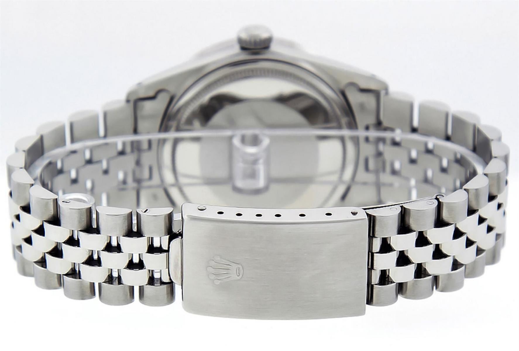 One Mens Stainless Steel Rolex Datejust Polished Bright with Satin Finish, Serviced & Electronically Tested, Stainless Steel Case: 36mm, Stainless Steel Crown, Bezel: New 14K White Gold Fluted Bezel. Custom Crystal: New Acrylic Cyclops Lens. Custom Hands: New Luminescent Hands. Movement: Automatic Winding Movement. Custom Dial: Blue Diamond Dial With Line Track, Diamond Count: 10 Diamond in Dial G To H In Color, SI-VS Clarity. Date Window: 3 O'Clock Position Date Display, Quickset, Model: Datejust, Condition: G-6 Extra Fine. Bracelet: Stainless Steel Jubilee. Bright Polish & Satin Finish. 7.0 Inch Length, Adjustable. Standard Clasp, With Rolex Logo. This Watch Has Been Serviced Time Tested And Is In Excellent Condition It Is Free Of All Scratches And Dents