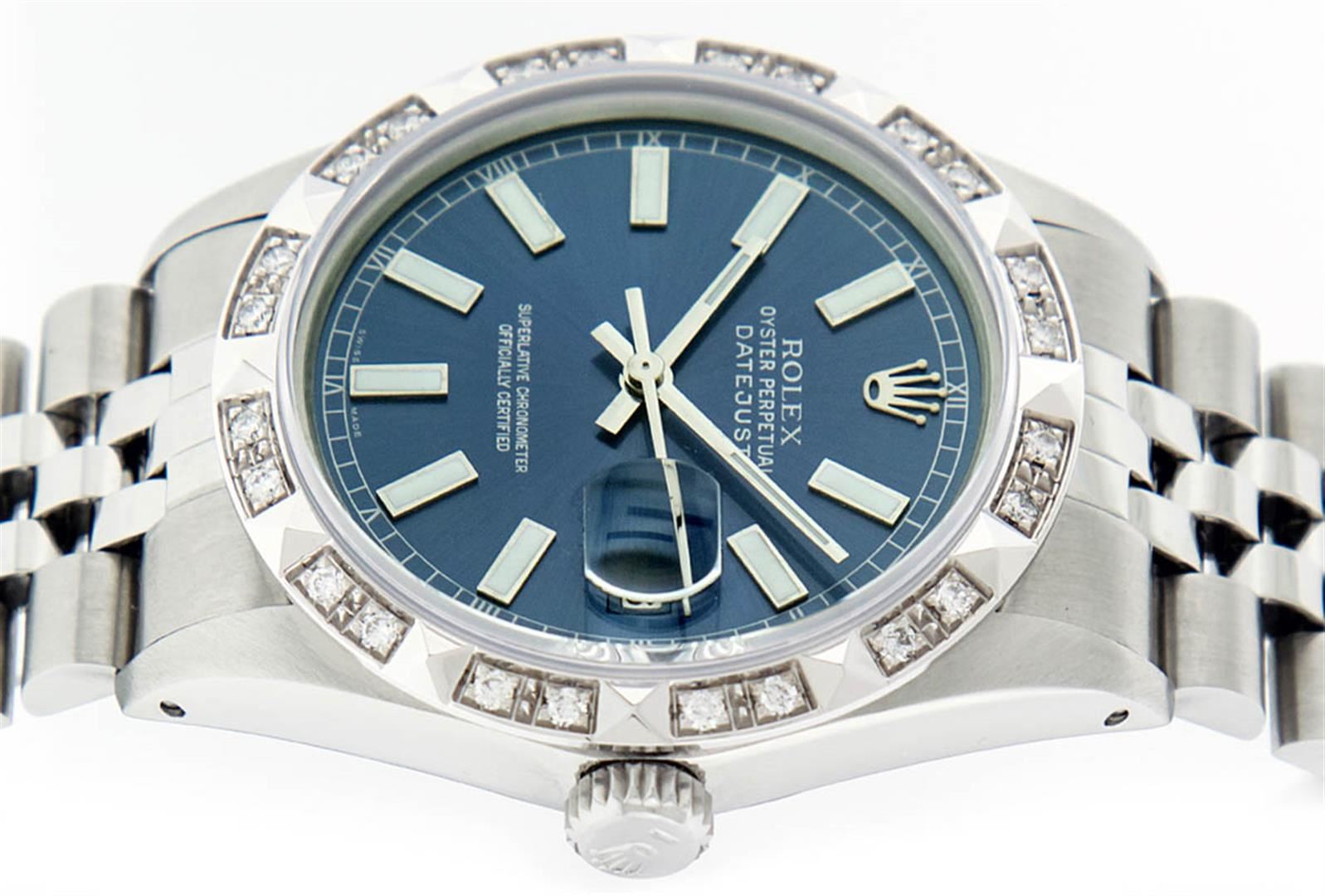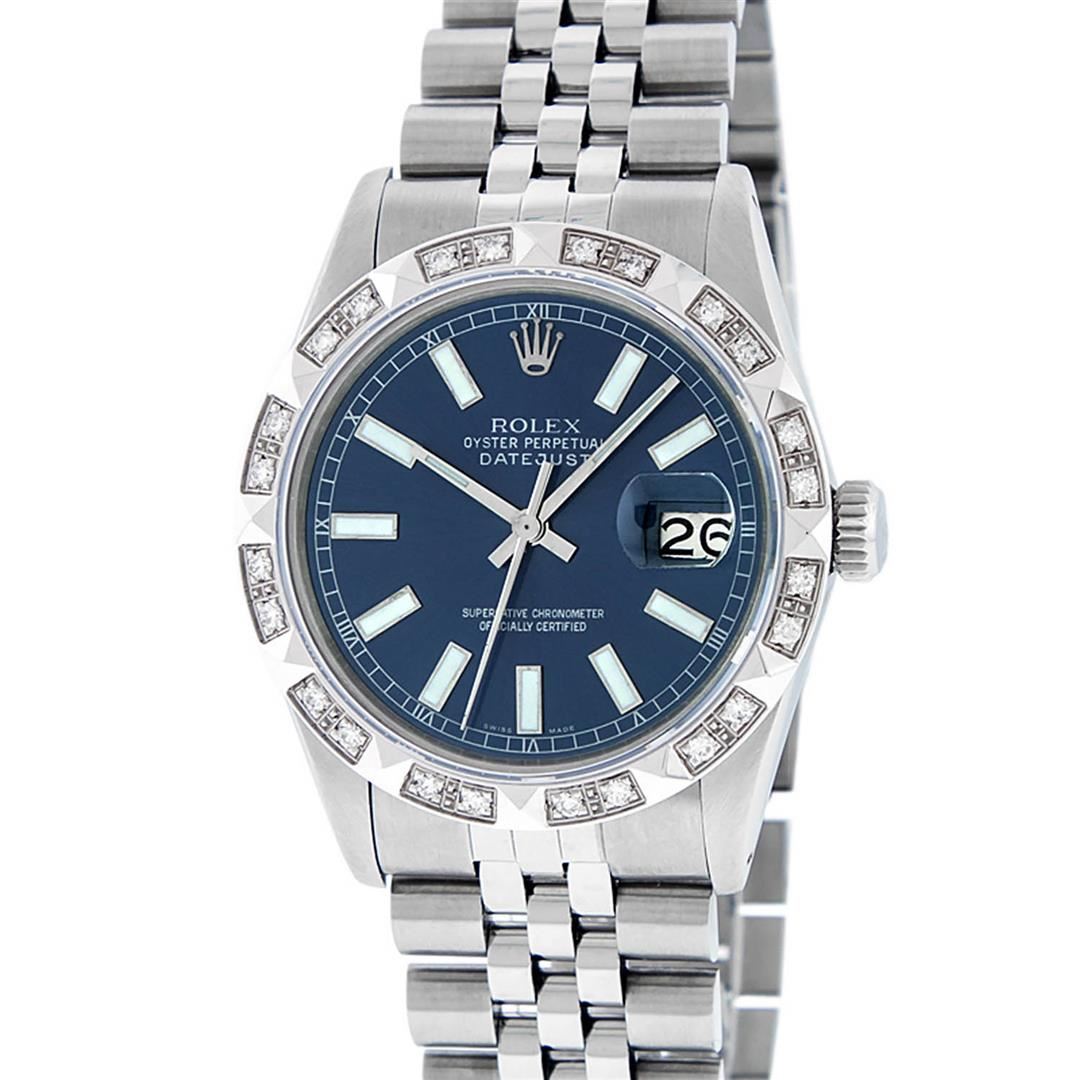 One Mens Stainless Steel Rolex Datejust Polished Bright with Satin Finish, Serviced & Electronically Tested, Stainless Steel Case: 36mm, Stainless Steel Crown, Custom Bezel: New 18K White Gold Pyramid Diamond Bezel, Diamond Count: 24 Diamonds, Total Weight .70 Carat, Clarity: SI-VS, Color: G to H. Custom Crystal: New Synthetic Sapphire Cyclops Lens. Custom Hands: New Luminescent Hands. Movement: Automatic Winding Movement Caliber 3035. Custom Dial: Blue Index Dial. Date Window: 3 O'Clock Position Date Display, Quickset, Model: Datejust. Condition: G-6 Extra Fine. Bracelet: Stainless Steel Jubilee. Bright Polish & Satin Finish. 7.0 Inch Length, Adjustable. Standard Clasp, With Rolex Logo. This Watch Has Been Serviced Time Tested And Is In Excellent Condition It Is Free Of All Scratches And Dents