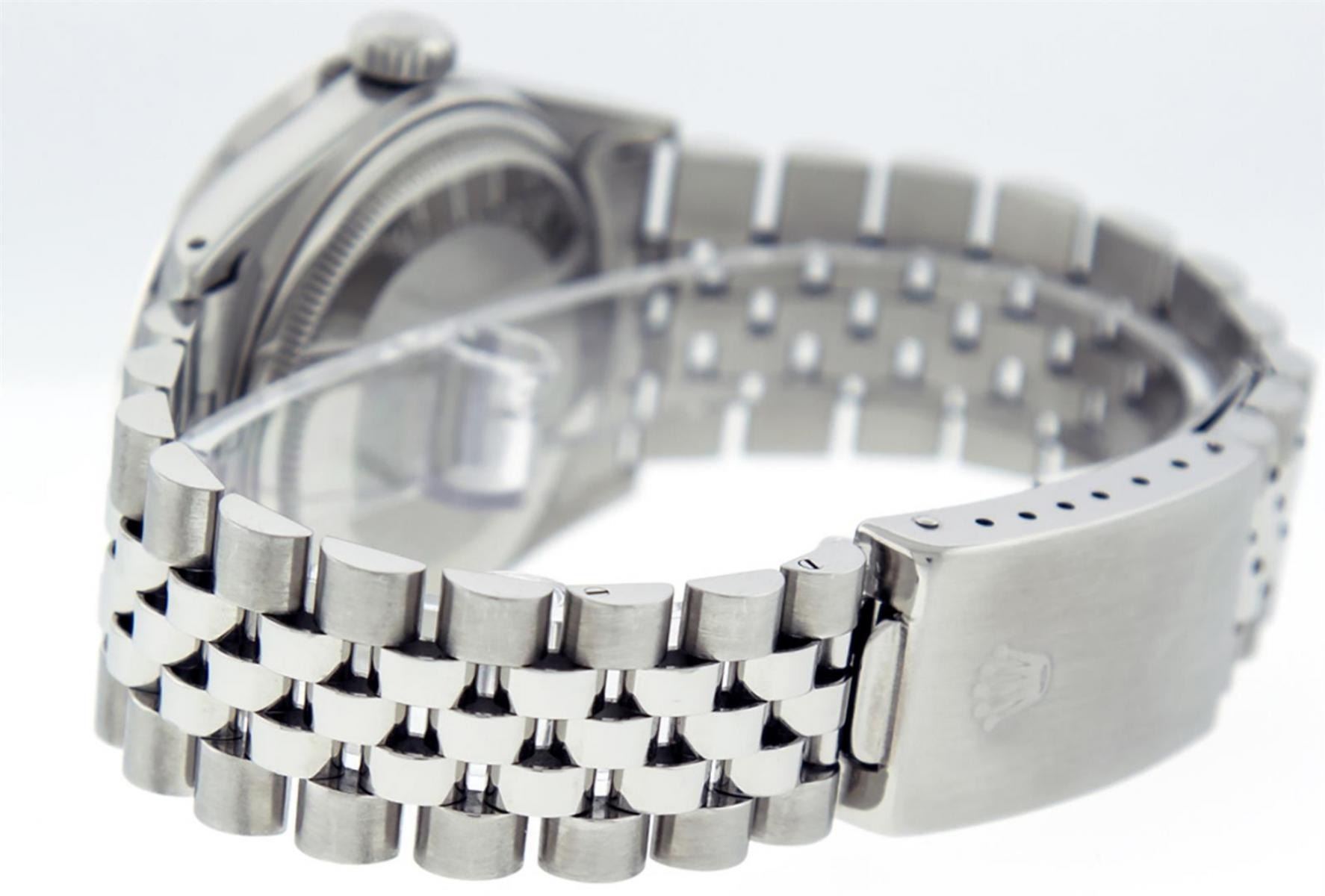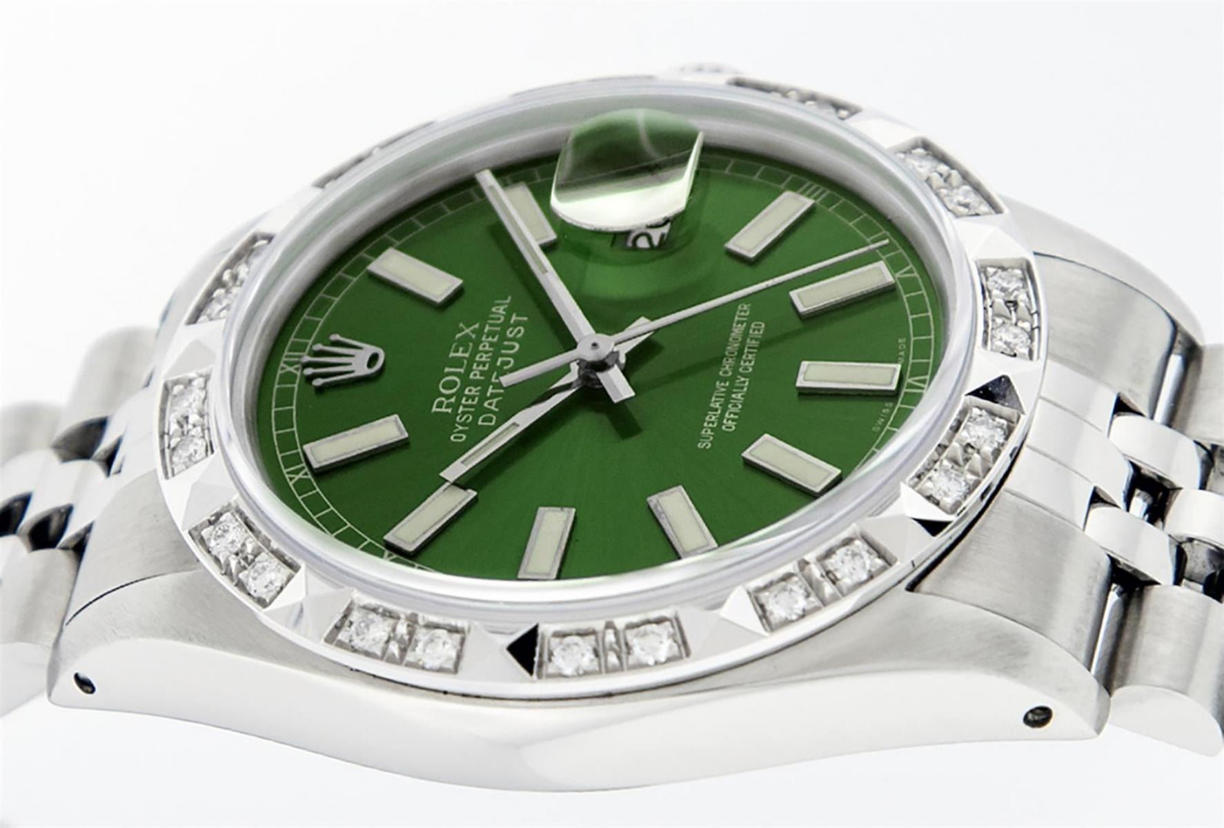One Mens Stainless Steel Rolex Datejust Polished Bright with Satin Finish, Serviced & Electronically Tested, Stainless Steel Case: 36mm, Stainless Steel Crown, Custom Bezel: New 18K White Gold Pyramid Diamond Bezel, Diamond Count: 24 Diamonds On Bezel, Total Weight .70 Carat, Clarity: SI-VS, Color: G to H. Custom Crystal: New Scratch Resistant Synthetic Sapphire Cyclops Lens. Custom Hands: New Luminescent Hands. Movement: Automatic Winding Movement. Custom Dial: Green Index Dial With Square Roman Track. Date Window: 3 O'Clock Position Date Display, Quickset, Model: Datejust. Condition: G-6 Extra Fine. Bracelet: Stainless Steel Jubilee. Bright Polish & Satin Finish. 7.0 Inch Length, Adjustable. Standard Clasp, With Rolex Logo. This Watch Has Been Serviced Time Tested And Is In Excellent Condition It Is Free Of All Scratches And Dents.