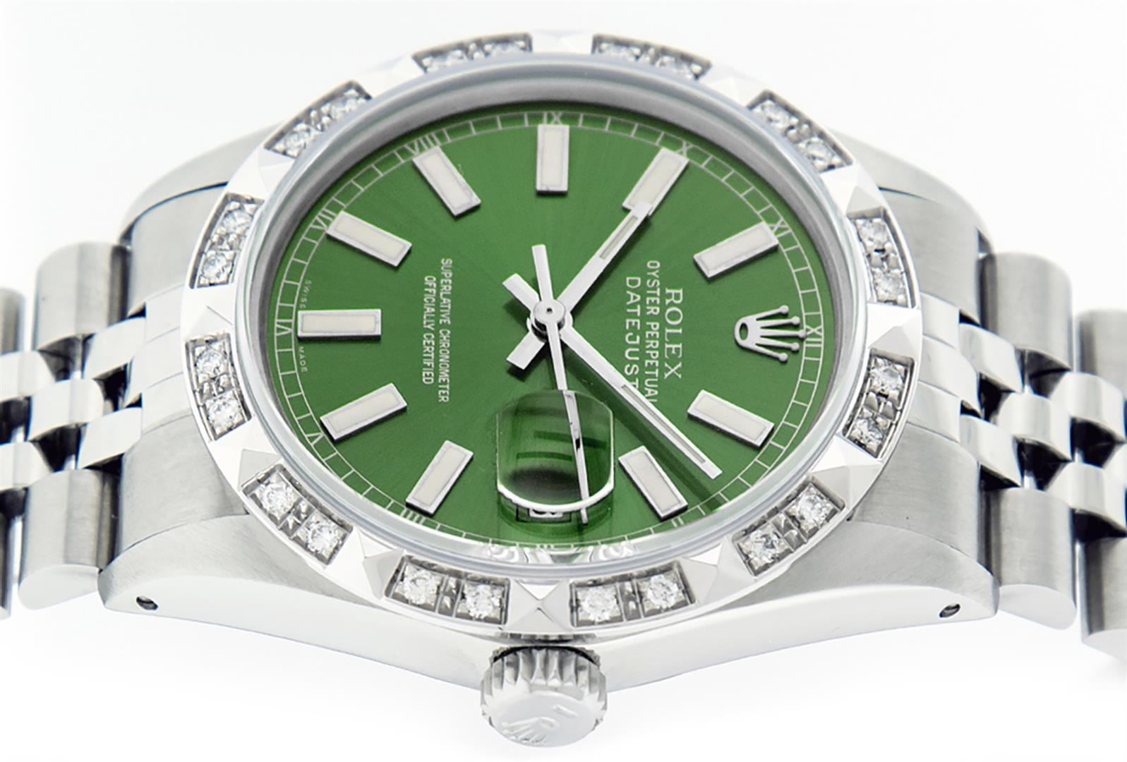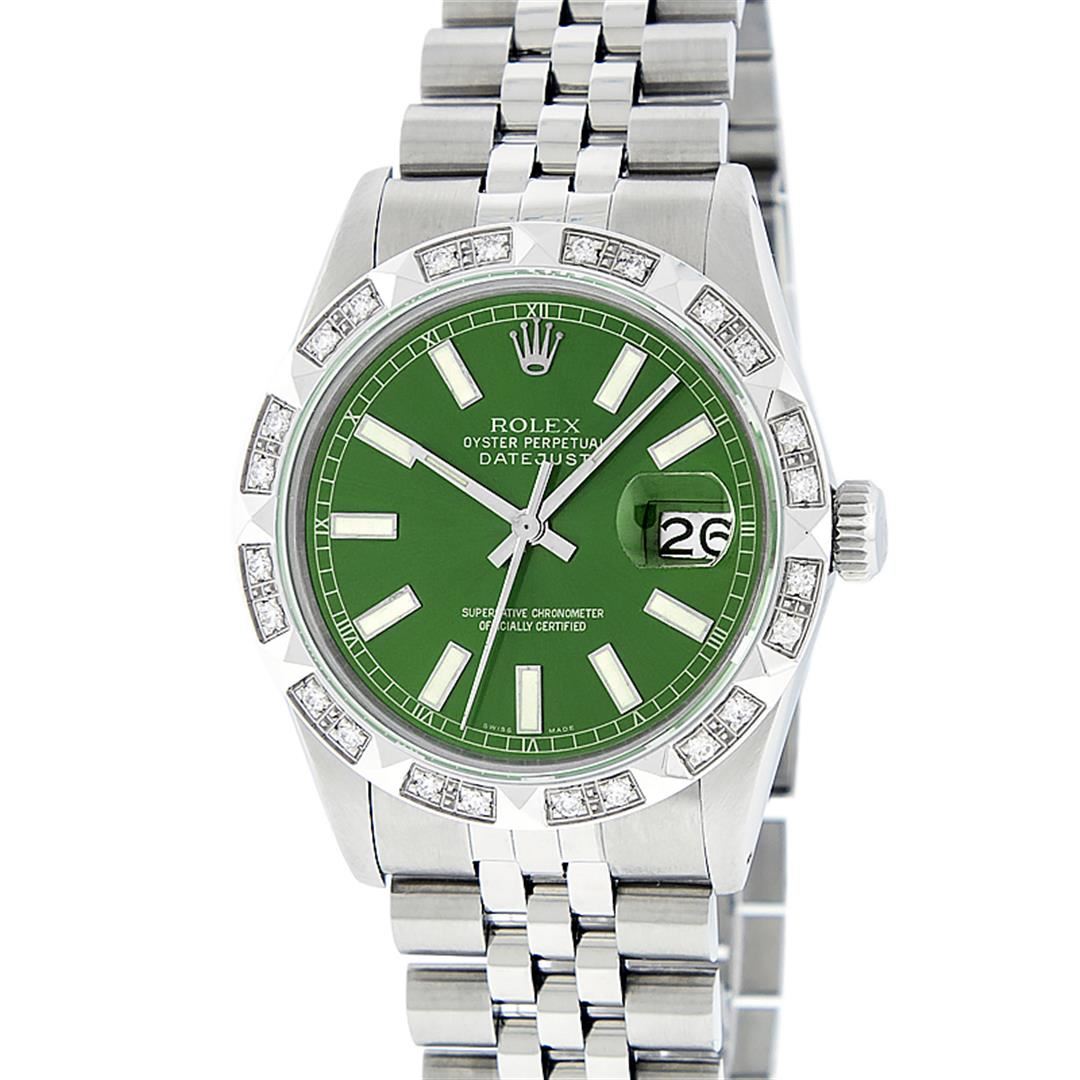 One Mens Pre Owned Stainless Steel Rolex Datejust Polished Bright with Satin Finish, Serviced & Electronically Tested, Stainless Steel Case: 36mm, Stainless Steel Crown, Custom Bezel: New 18K White Gold Pyramid Diamond Bezel, Diamond Count: 24 Diamonds On Bezel, Clarity: SI-VS, Color: G to H. Custom Crystal: New Sapphire With Date Window. Custom Hands: New Luminescent Hands. Rolex Movement: Automatic Winding Movement. Custom Dial: Green Index Dial With Square Roman Track. Date Window: 3 O'Clock Position Date Display, Quickset, Model: Datejust. Condition: G-6 Extra Fine. Rolex Bracelet: Stainless Steel Jubilee Band. Bright Polish & Satin Finish. 7.0 Inch Length, Adjustable. Standard Clasp, With Rolex Logo. This Watch Has Been Serviced Time Tested And Is In Excellent Condition It Is Free Of All Scratches And Dents.