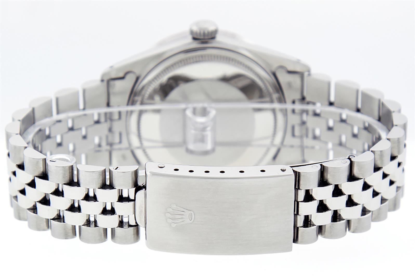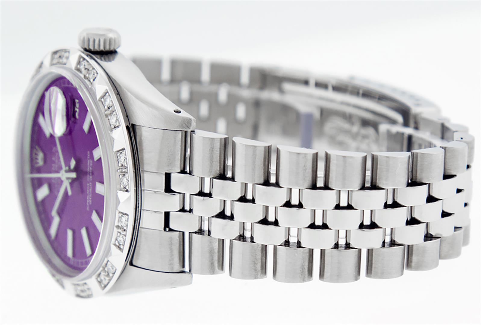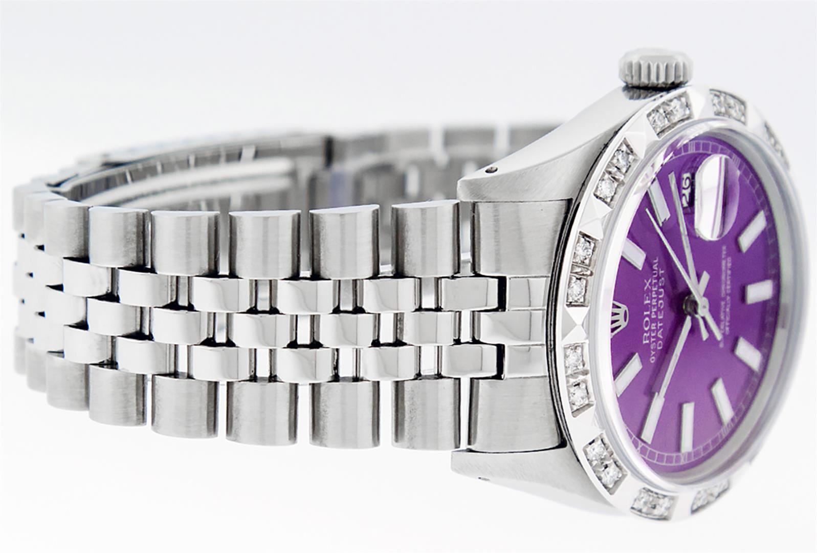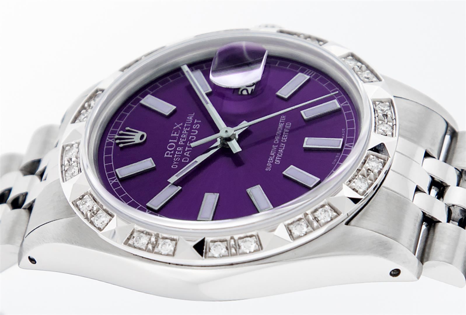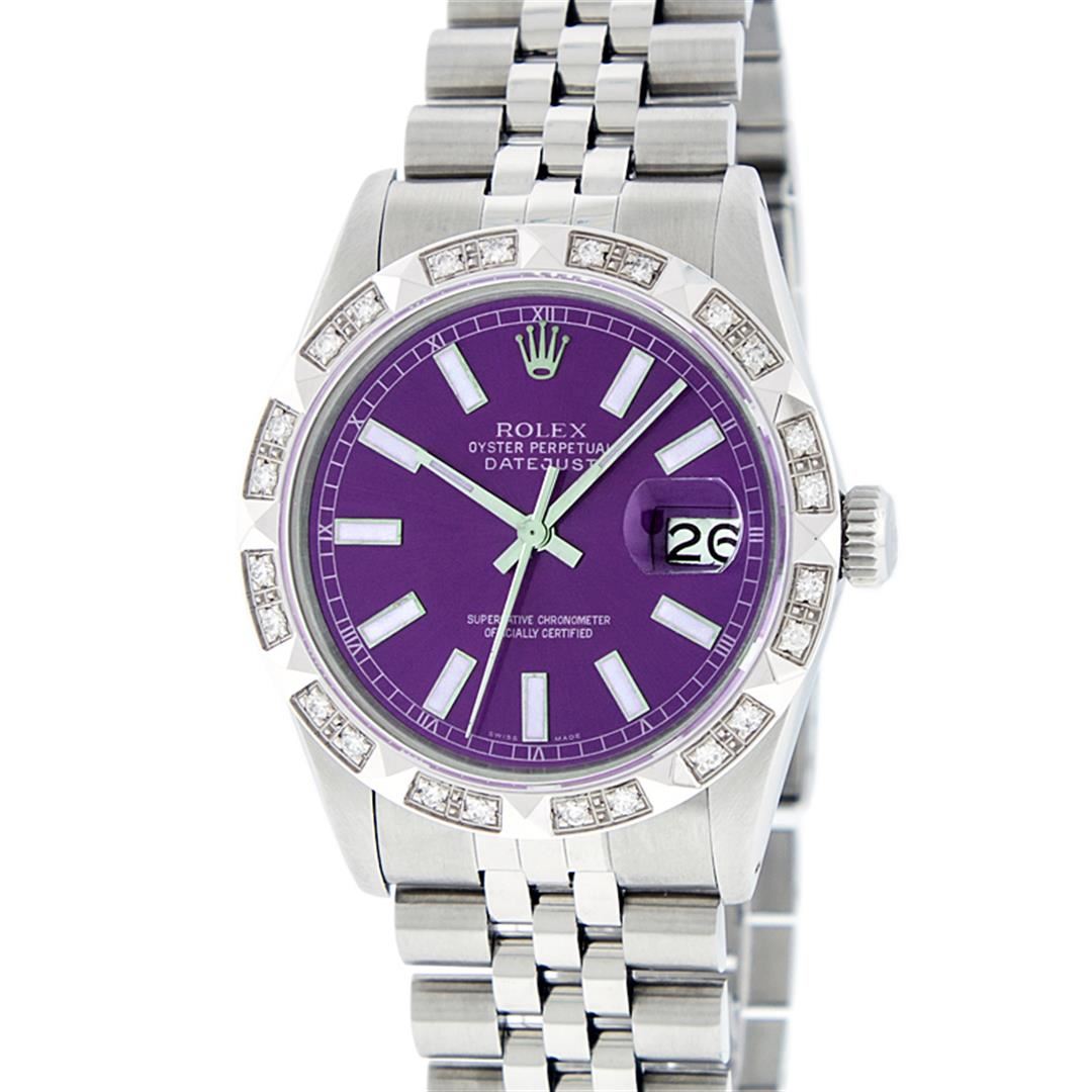 One Mens Pre Owned Stainless Steel Rolex Datejust Polished Bright with Satin Finish, Serviced & Electronically Tested, Stainless Steel Case: 36mm, Stainless Steel Crown, Custom Bezel: New 18K White Gold Pyramid Diamond Bezel, Diamond Count: 24 Diamonds On