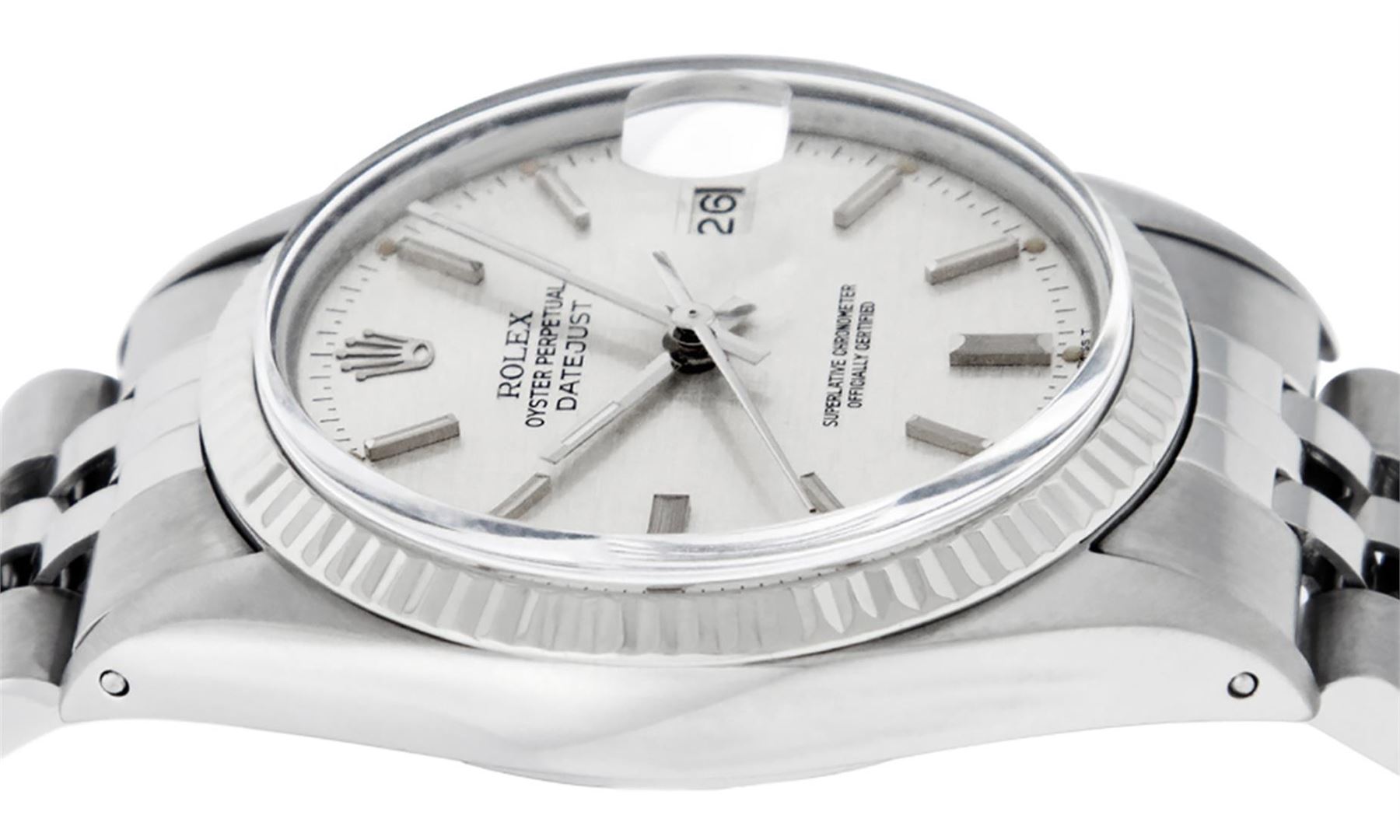 One Mens Pre Owned Stainless Steel Rolex Datejust Polished, Serviced & Electronically Tested, Rolex Stainless Steel Case: 36mm, Rolex Stainless Steel Crown, Bezel: 14K White Gold Fluted Bezel. Custom Crystal: Acrylic Crystal With Date Window, Custom Hands: New Luminescent Hands. Rolex Movement: Automatic Winding Movement 3035. Rolex Dial: Silver Index With Dash Track & Lumi Dot. Date Window: 3 O'Clock Position Date Display, Quickset, Model: Datejust, Condition: G-6 Extra Fine. Rolex Bracelet: Stainless Steel Jubilee Band. Bright Polish & Satin Finish. 7.0 Inch Length, Adjustable. Standard Clasp, With Rolex Logo. This Watch Has Been Serviced Time Tested And Is In Excellent Condition It Is Free Of All Scratches And Dents.