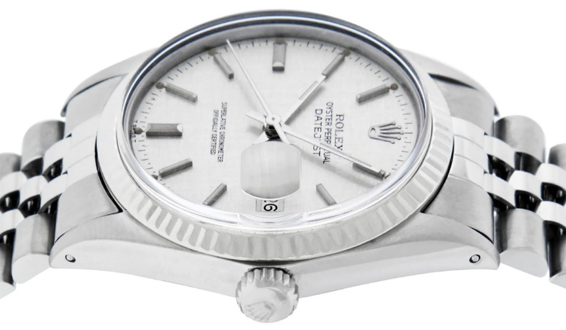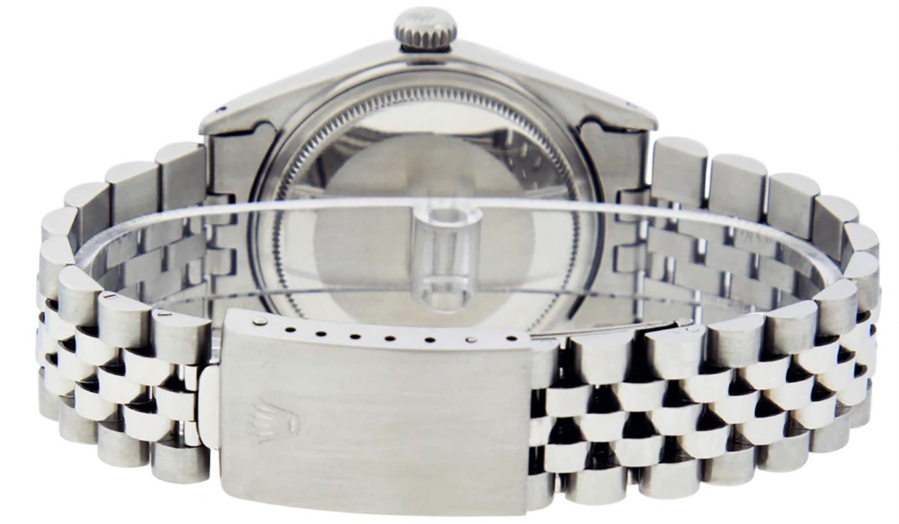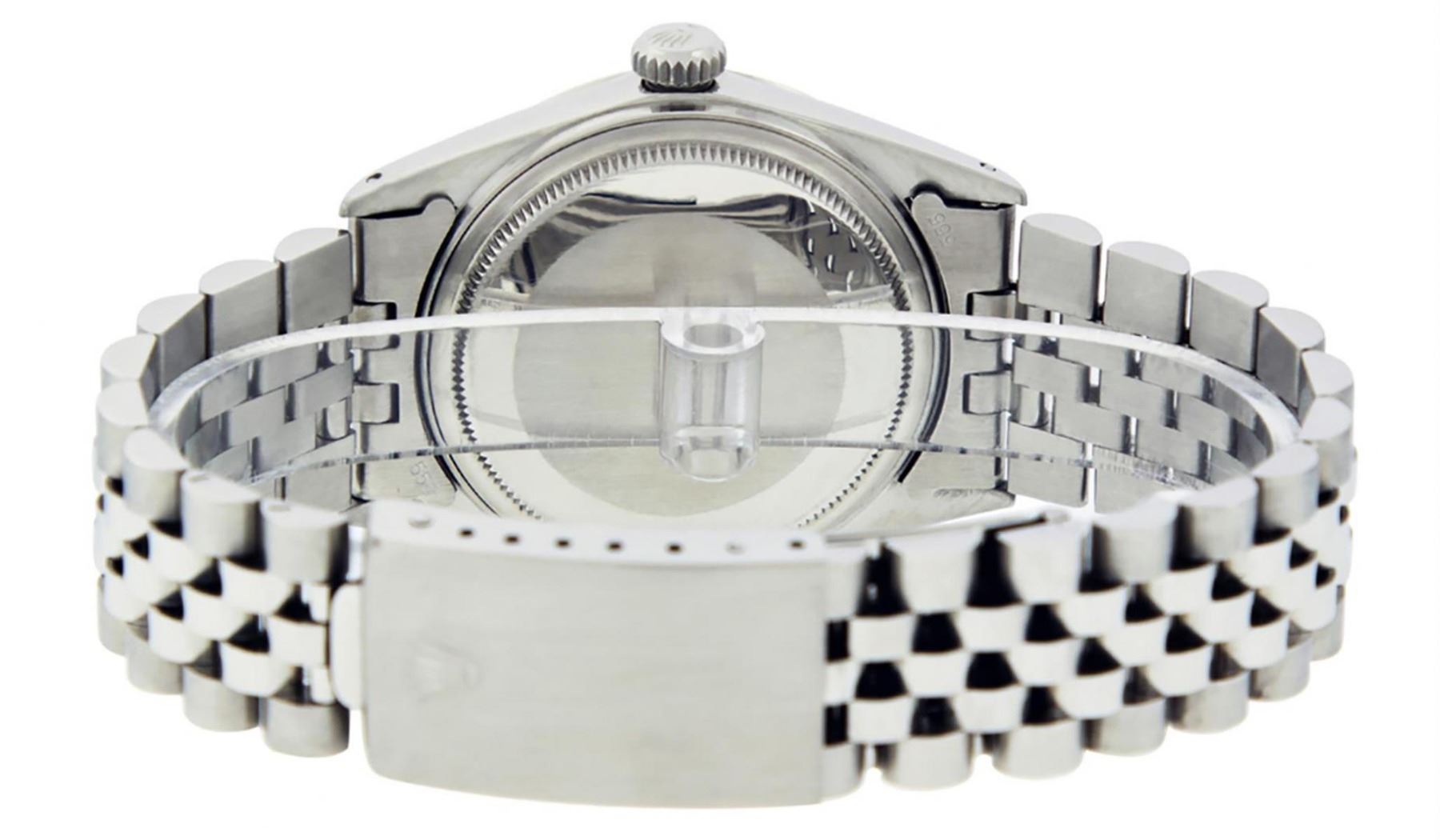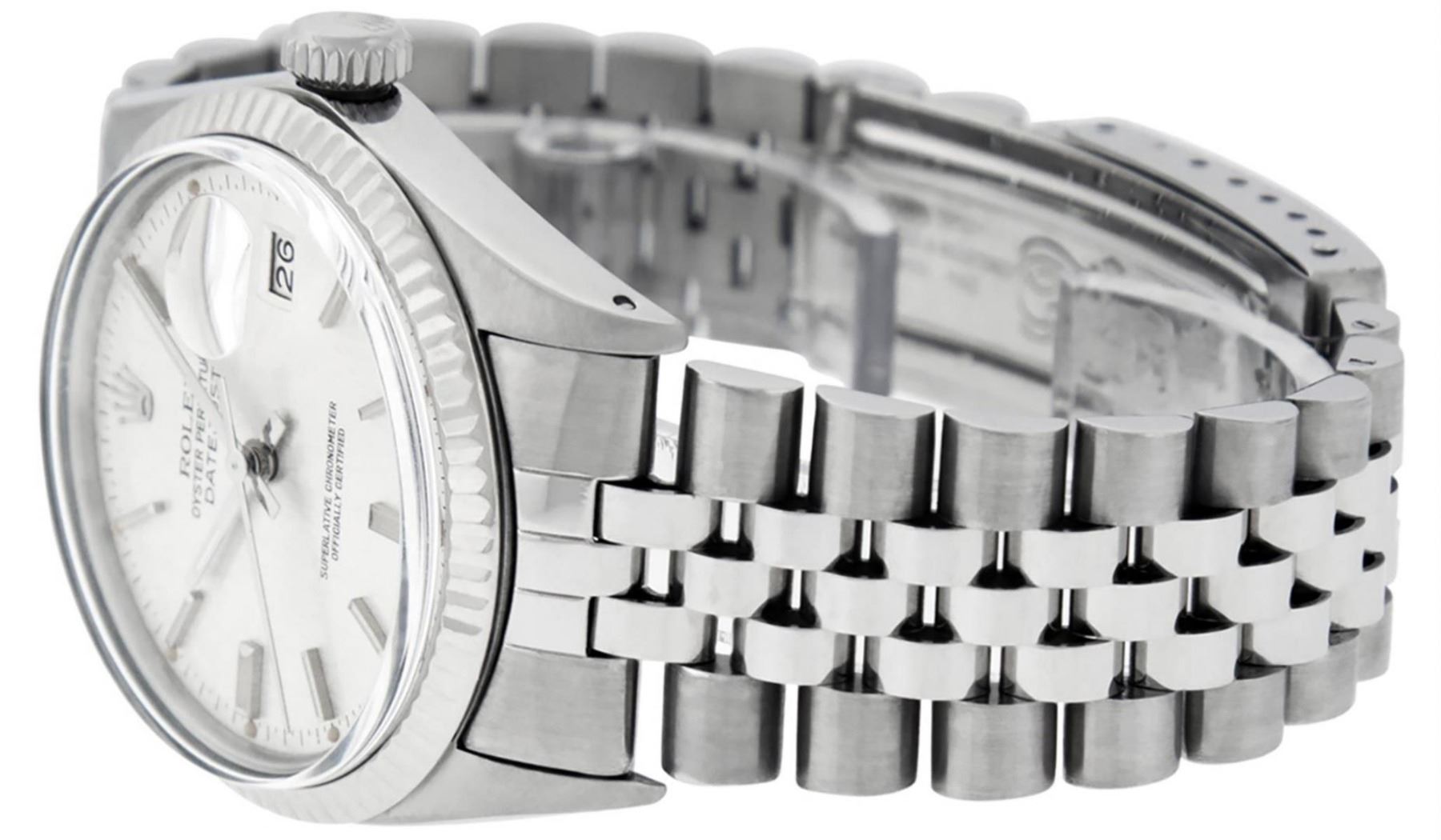 One Mens Stainless Steel Rolex Datejust Polished, Serviced & Electronically Tested, Stainless Steel Case: 36mm, Stainless Steel Crown, Bezel: 14K White Gold Fluted Bezel. Crystal: Acrylic Crystal, Custom Hands: Luminescent Hands. Movement: Automatic Winding Movement. Dial: Silver Index With Dash Track & Lumi Dot. Date Window: 3 O'Clock Position Date Display, Quickset, Model: Datejust, Condition: G-6 Extra Fine. Bracelet: Stainless Steel Jubilee Band. Bright Polish & Satin Finish. 7.0 Inch Length, Adjustable. Standard Clasp, With Rolex Logo. This Watch Has Been Serviced Time Tested And Is In Excellent Condition It Is Free Of All Scratches And Dents.