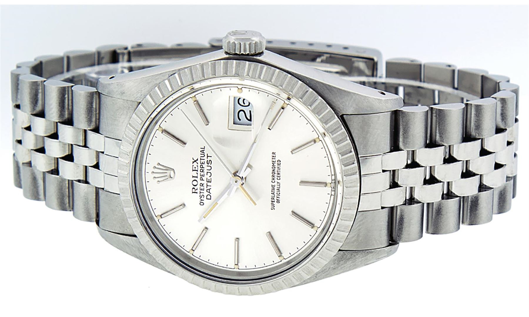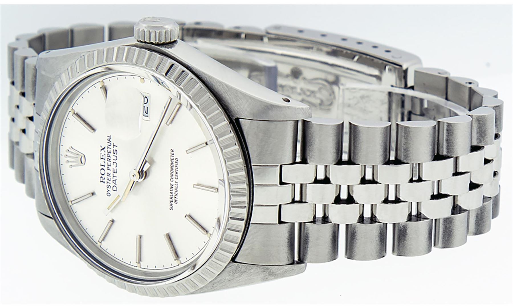 One Mens Stainless Steel Rolex Datejust Polished, Serviced & Electronically Tested, Stainless Steel Case: 36mm, Stainless Steel Crown, Bezel: 14K White Gold Fluted Bezel. Crystal: Acrylic Cyclops Lens. Hands: Luminescent Hands. Movement: Automatic Winding Movement. Dial: Silver Index With Dash Track. Date Window: 3 O'Clock Position Date Display, Quickset, Model: Datejust, Condition: G-6 Extra Fine. Bracelet: Stainless Steel Jubilee Band. Bright Polish & Satin Finish. 7.0 Inch Length, Adjustable. Standard Clasp, With Rolex Logo. This Watch Has Been Serviced Time Tested And Is In Excellent Condition It Is Free Of All Scratches And Dents.