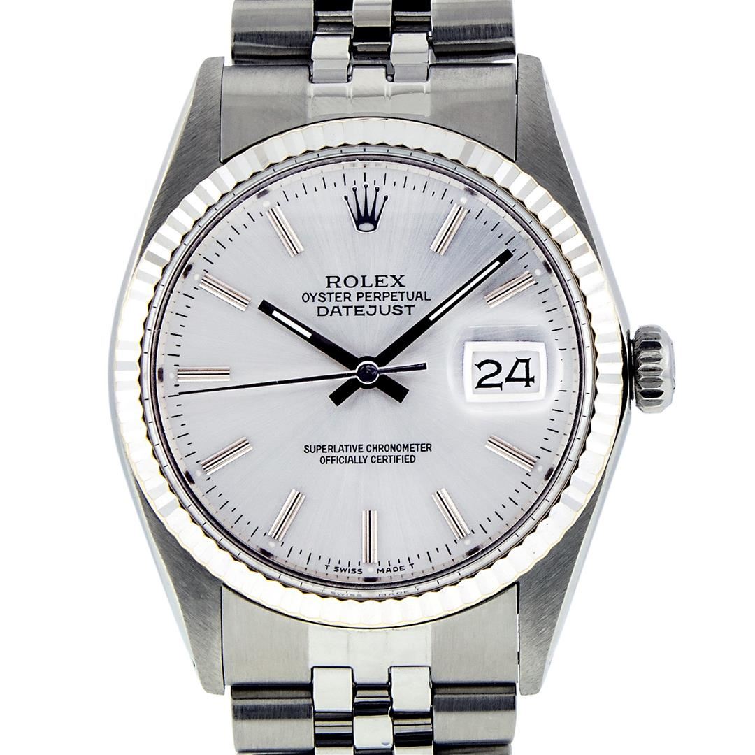 One Mens Pre Owned Stainless Steel Rolex Datejust Polished, Serviced & Electronically Tested, Rolex Stainless Steel Case: 36mm, Rolex Stainless Steel Crown, Rolex Bezel: 14K White Gold Fluted Bezel. Custom Crystal: New Acrylic With Magnified Date Window. Hands: Luminescent Hands. Rolex Movement: Automatic Winding Movement. Rolex Dial: Silver Index With Dash Track And Lumi Dot. Date Window: 3 O'Clock Position Date Display, Quickset, Model: Datejust, Condition: G-6 Extra Fine. Rolex Bracelet: Stainless Steel Jubilee Band. Bright Polish & Satin Finish. 7.0 Inch Length, Adjustable. Standard Clasp, With Rolex Logo. This Watch Has Been Serviced Time Tested And Is In Excellent Condition It Is Free Of All Scratches And Dents.