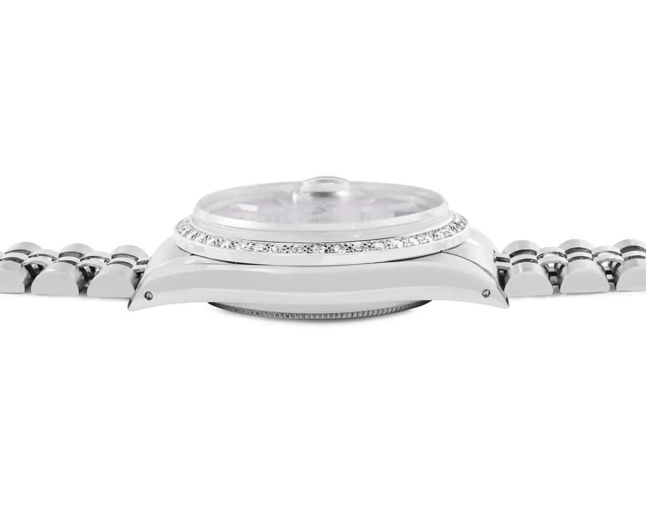 One Mens Pre Owned Stainless Steel Rolex Datejust Polished Bright with Satin Finish, This Watch Has Been Serviced And Electronically Tested, Rolex Stainless Steel Case: 36mm, Rolex Stainless Steel Crown, Custom Bezel: New 18K Beadset Diamond Bezel, Diamond Count: 44 Diamonds. Custom Crystal: New Sapphire With Date Window. Custom Hands: New Luminescent Hands. Rolex Movement: Automatic Winding Movement 3035. Rolex Dial: Silver Index Dial With Dash Track. Date Window: 3 O'Clock Position Date Display, Quickset, Model: Quickset Datejust, Condition: G-6 Extra Fine. Rolex Bracelet: Stainless Steel Jubilee Band. Bracelet: 7.0 Inch Length, Adjustable. Standard Clasp, With Rolex Logo. This Watch Has Been Serviced Time Tested And Is In Excellent Condition It Is Free Of All Scratches And Dents.
