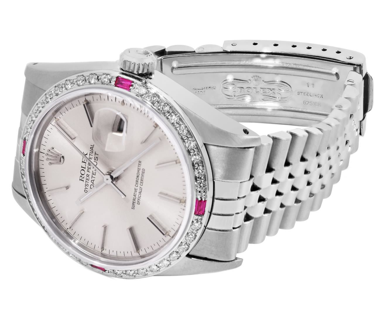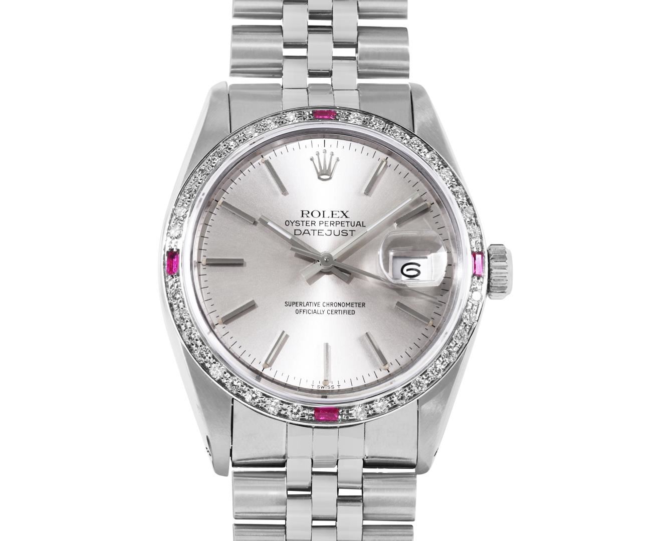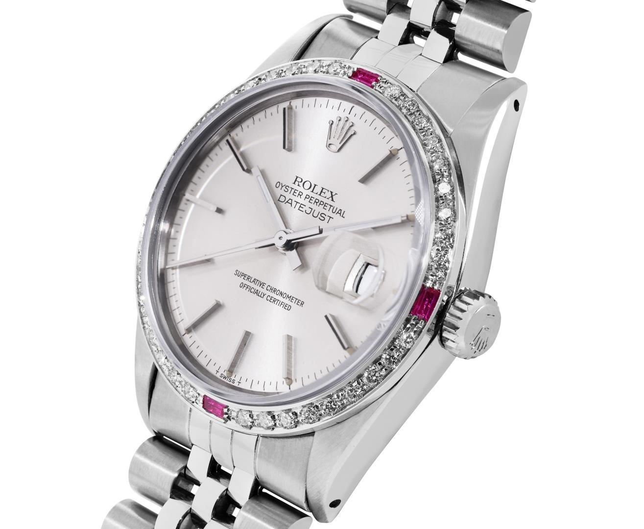 One Mens Pre Owned Rolex Datejust Polished Bright with Satin Finish, This Watch Has Been Serviced & Electronically Tested, Rolex Stainless Steel Case: 36mm, Rolex Stainless Steel Crown, Custom Bezel: New 18K White Gold Ruby Beadset Diamond Bezel, Diamond + Gem Count: 36 Diamonds + 4 Rubies. Custom Crystal: New Sapphire With Date Window. Custom Hands: New Luminescent Hands. Rolex Movement: Automatic Winding Movement 3035. Rolex Dial: Silver Index Dial. Date Window: 3 O'Clock Position Date Display, Quickset, Model: Quickset Datejust, Condition: G-6 Extra Fine. Rolex Bracelet: Stainless Steel Jubilee Band. Bracelet: 7.0 Inch Length, Adjustable. Standard Clasp, With Rolex Logo. This Watch Has Been Serviced Time Tested And Is In Excellent Condition It Is Free Of All Scratches And Dents. This Watch Comes With A Rolex Box.