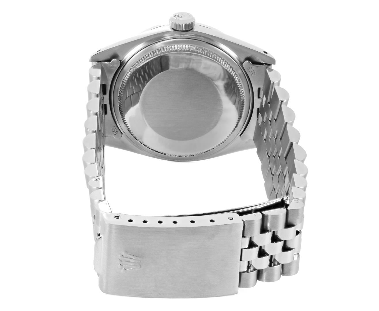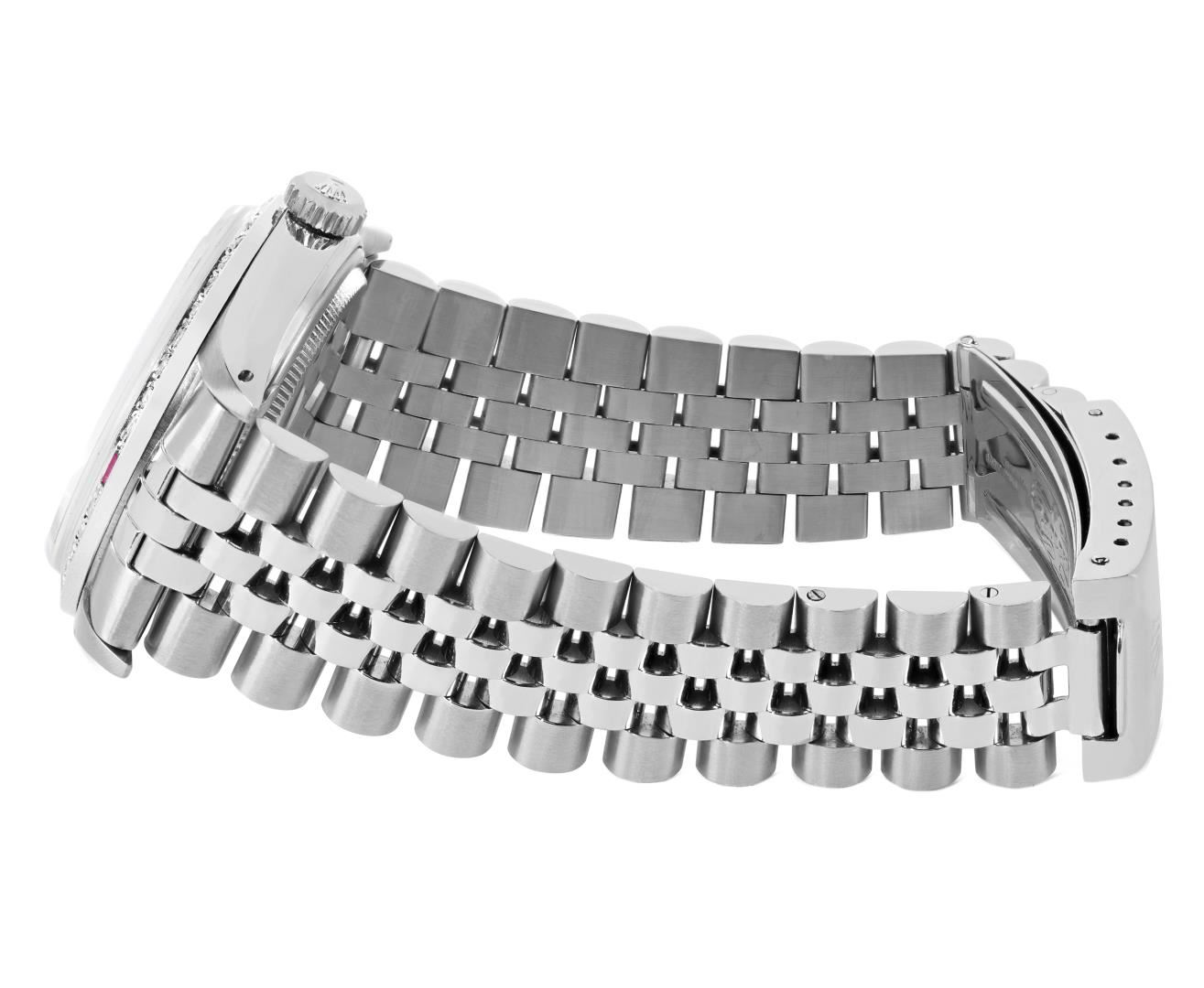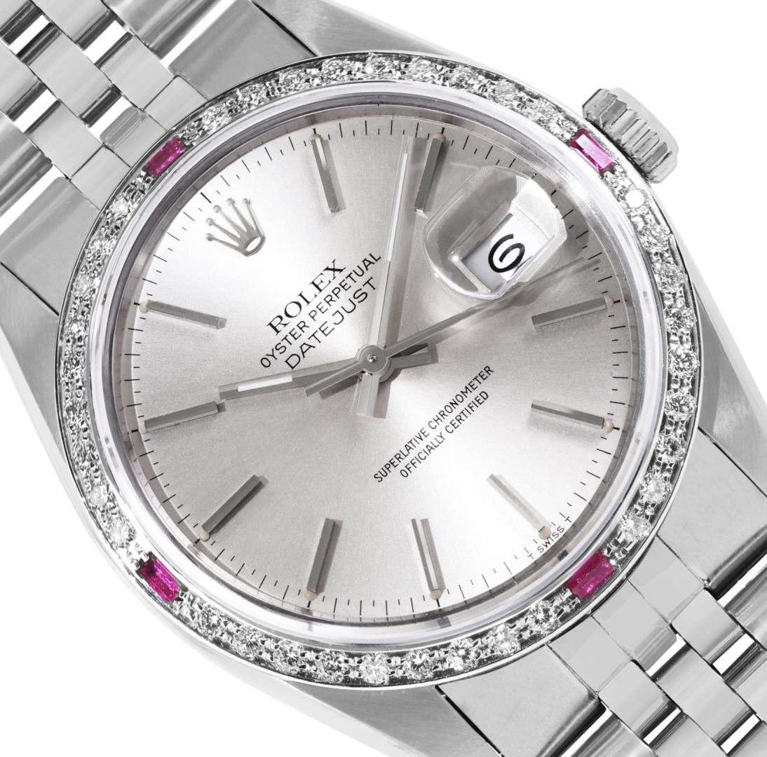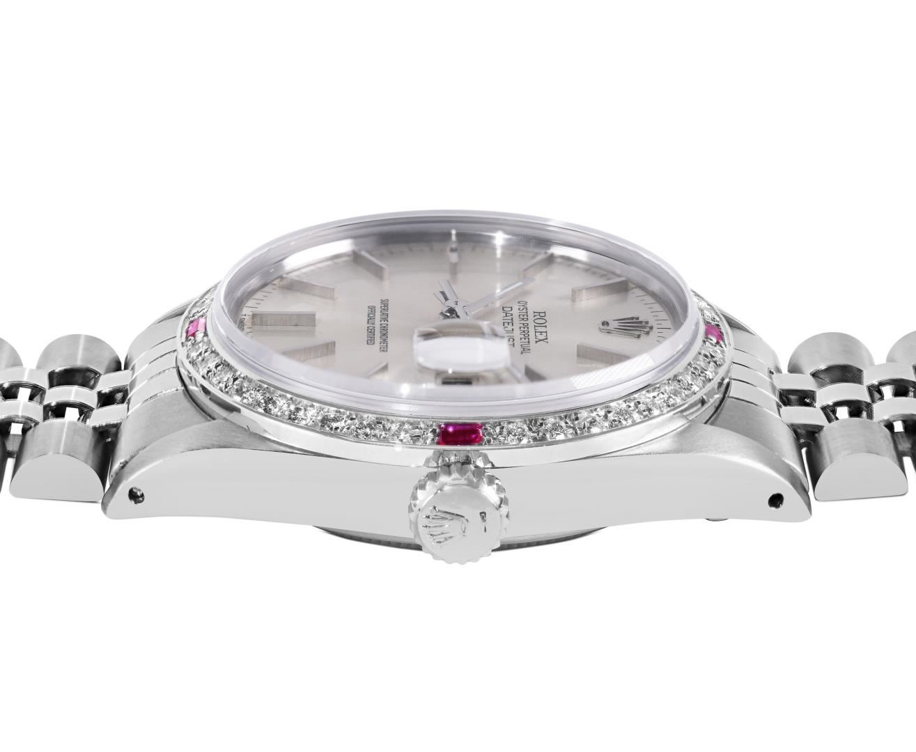 One Mens Pre Owned Rolex Datejust Polished Bright with Satin Finish, This Watch Has Been Serviced & Electronically Tested, Rolex Stainless Steel Case: 36mm, Rolex Stainless Steel Crown, Custom Bezel: New 18K White Gold Ruby Beadset Diamond Bezel, Diamond + Gem Count: 36 Diamonds + 4 Rubies. Custom Crystal: New Sapphire With Date Window. Custom Hands: New Luminescent Hands. Rolex Movement: Automatic Winding Movement 3035. Rolex Dial: Silver Index Dial. Date Window: 3 O'Clock Position Date Display, Quickset, Model: Quickset Datejust, Condition: G-6 Extra Fine. Rolex Bracelet: Stainless Steel Jubilee Band. Bracelet: 7.0 Inch Length, Adjustable. Standard Clasp, With Rolex Logo. This Watch Has Been Serviced Time Tested And Is In Excellent Condition It Is Free Of All Scratches And Dents. This Watch Comes With A Rolex Box.