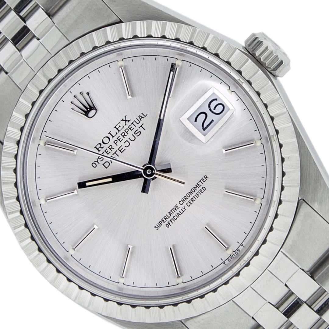 One Mens Pre Owned Stainless Steel Rolex Datejust Polished, Serviced & Electronically Tested, Rolex Stainless Steel Case: 36mm, Stainless Steel Crown, Rolex Bezel: Stainless Steel Engine Turn Bezel. Custom Crystal: Acrylic With Date Window. Hands: Luminescent Hands. Rolex Movement: Automatic Winding Movement 3035. Rolex Dial: Silver Index With Dash Track And Lumi Dots. Date Window: 3 O'Clock Position Date Display, Quickset, Model: Datejust, Condition: G-6 Extra Fine. Rolex Bracelet: Stainless Steel Jubilee Band. Bright Polish & Satin Finish. 7.0 Inch Length, Adjustable. Standard Clasp, With Rolex Logo. This Watch Has Been Serviced Time Tested And Is In Excellent Condition It Is Free Of All Scratches And Dents.
