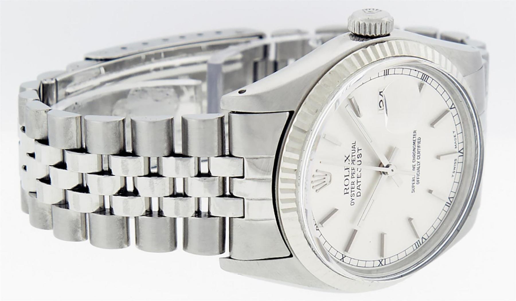 One Mens Rolex Stainless Steel Rolex Datejust Polished, Serviced & Electronically Tested, Stainless Steel Case: 36mm, Stainless Steel Crown, Bezel: 14K White Gold Fluted Bezel. Custom Crystal: New Acrylic Cyclops Lens. Custom Hands: New Luminescent Hands. Movement: Automatic Winding Movement. Custom Dial: Silver Index With Roman Square Track. Date Window: 3 O'Clock Position Date Display, Quickset, Model: Datejust, Condition: G-6 Extra Fine. Bracelet: Stainless Steel Jubilee Band. Bright Polish & Satin Finish. 7.0 Inch Length, Adjustable. Standard Clasp, With Rolex Logo. This Watch Has Been Serviced Time Tested And Is In Excellent Condition It Is Free Of All Scratches And Dents.