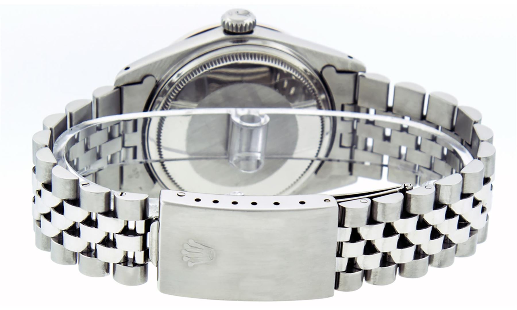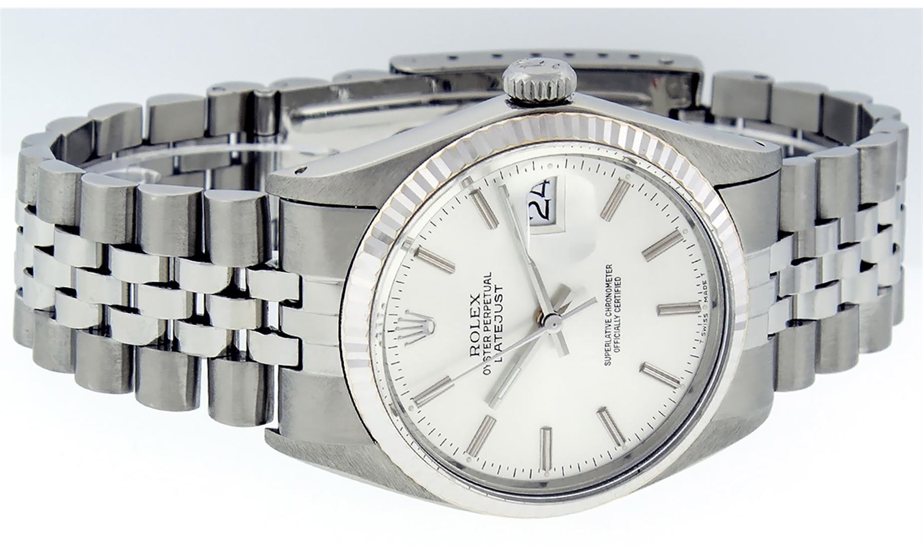 One Mens Stainless Steel Rolex Datejust Polished, Serviced & Electronically Tested, Stainless Steel Case: 36mm, Stainless Steel Crown, Bezel: 14K White Gold Fluted Bezel. Custom Crystal: New Acrylic Cyclops Lens. Hands: Luminescent Hands. Movement: Automatic Winding Movement. Dial: Silver Index With Dash Track. Date Window: 3 O'Clock Position Date Display, Quickset, Model: Datejust, Condition: G-6 Extra Fine. Bracelet: Stainless Steel Jubilee Band. Bright Polish & Satin Finish. 7.0 Inch Length, Adjustable. Standard Clasp, With Rolex Logo. This Watch Has Been Serviced Time Tested And Is In Excellent Condition It Is Free Of All Scratches And Dents.