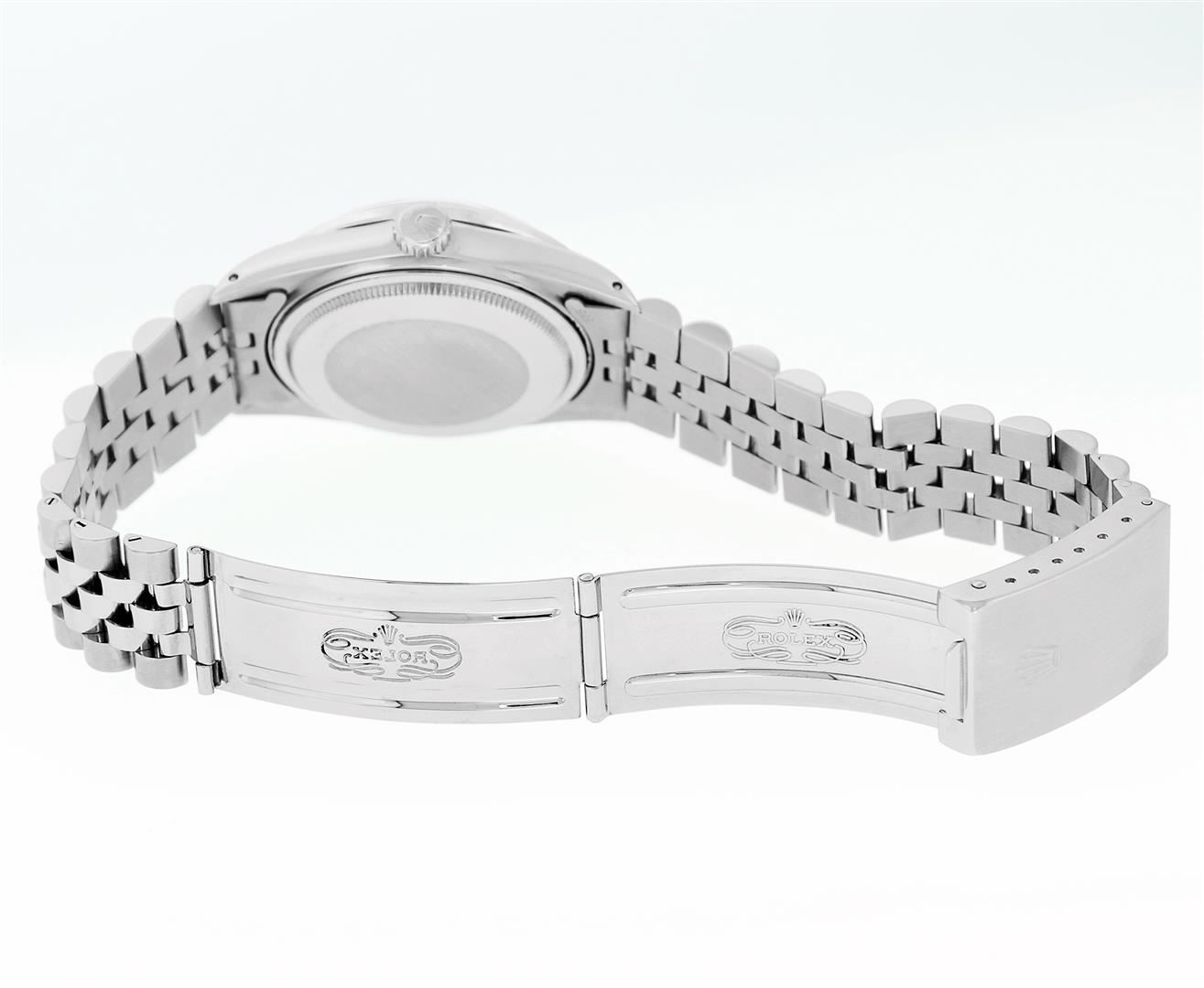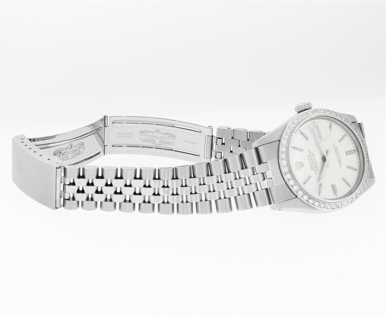One Mens Pre Owned Stainless Steel Rolex Datejust Polished, Serviced & Electronically Tested, Rolex Stainless Steel Case: 36mm, Rolex Stainless Steel Crown, Custom Bezel: New 18K White Gold Beadset Diamond Bezel, Diamond Count: 44 Diamonds, Total Weight 1.00 Carat, Clarity: SI-VS, Color: G to H. Custom Crystal: New Sapphire With Magnified Date Window. Custom Hands: New Luminescent Hands. Rolex Movement: Automatic Winding Movement 3035. Rolex Dial: Silver Index With Dash Track And Lumi Dot. Date Window: 3 O'Clock Position Date Display, Quickset, Model: Datejust, Condition: G-6 Extra Fine. Rolex Bracelet: Stainless Steel Jubilee Band. Bright Polish & Satin Finish. 7.0 Inch Length, Adjustable. Standard Clasp, With Rolex Logo. This Watch Has Been Serviced Time Tested And Is In Excellent Condition It Is Free Of All Scratches And Dents.