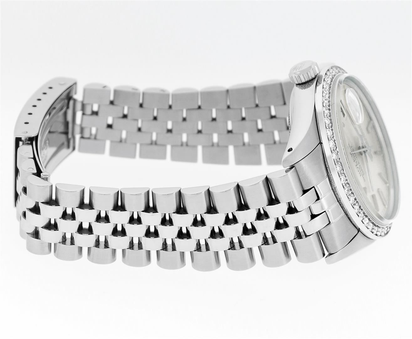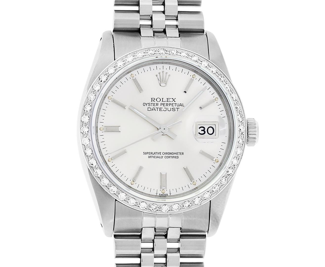 One Mens Pre Owned Stainless Steel Rolex Datejust Polished, Serviced & Electronically Tested, Rolex Stainless Steel Case: 36mm, Rolex Stainless Steel Crown, Custom Bezel: New 18K White Gold Beadset Diamond Bezel, Diamond Count: 44 Diamonds, Total Weight 1.00 Carat, Clarity: SI-VS, Color: G to H. Custom Crystal: New Sapphire With Magnified Date Window. Custom Hands: New Luminescent Hands. Rolex Movement: Automatic Winding Movement 3035. Rolex Dial: Silver Index With Dash Track And Lumi Dot. Date Window: 3 O'Clock Position Date Display, Quickset, Model: Datejust, Condition: G-6 Extra Fine. Rolex Bracelet: Stainless Steel Jubilee Band. Bright Polish & Satin Finish. 7.0 Inch Length, Adjustable. Standard Clasp, With Rolex Logo. This Watch Has Been Serviced Time Tested And Is In Excellent Condition It Is Free Of All Scratches And Dents.