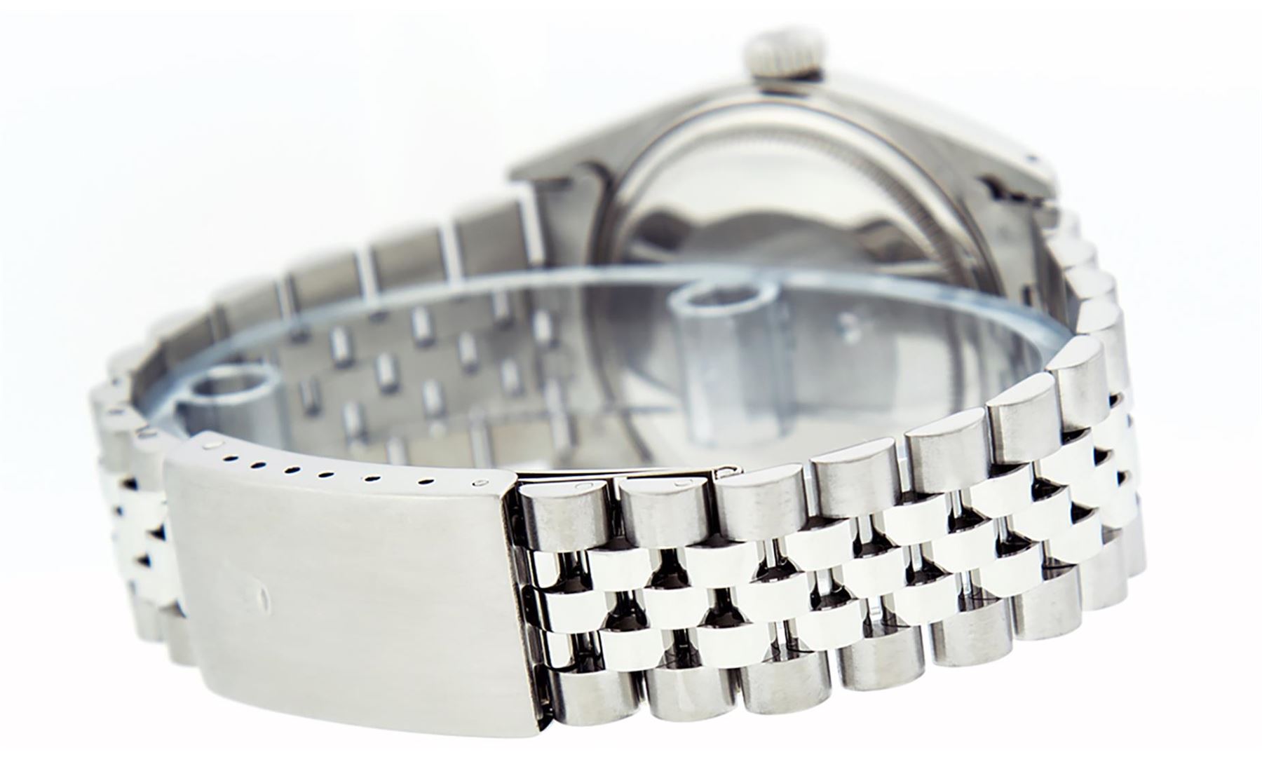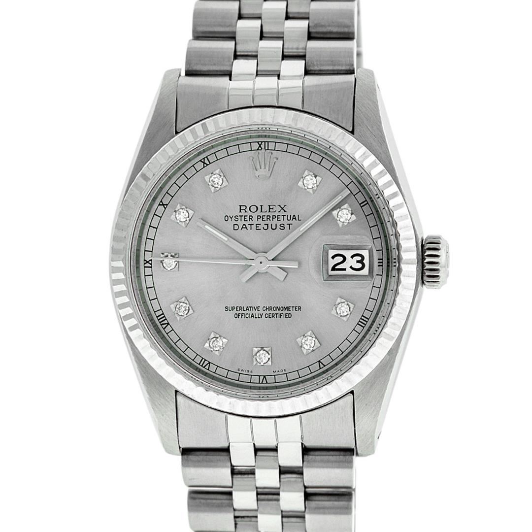 One Mens Stainless Steel Rolex Datejust Polished Bright with Satin Finish, Serviced & Electronically Tested, Stainless Steel Case: 36mm, Stainless Steel Crown, Bezel: White Gold Fluted Bezel. Custom Crystal: New Acrylic Cyclops Lens. Custom Hands: New Luminescent Hands. Movement: Automatic Winding Movement. Custom Dial: Slate Grey Diamond Dial With Square Roman Track, Diamond Count: 10 Diamond in Dial G To H In Color, SI-VS Clarity. Date Window: 3 O'Clock Position Date Display, Quickset, Model: Datejust, Condition: G-6 Extra Fine. Bracelet: Stainless Steel Jubilee. Bright Polish & Satin Finish. 7.0 Inch Length, Adjustable. Standard Clasp, With Rolex Logo. Watch Has Been Serviced And Polished It Is Free Of All Scratches And Dents. This Watch Has Been Serviced Time Tested And Is In Excellent Condition It Is Free Of All Scratches And Dents.