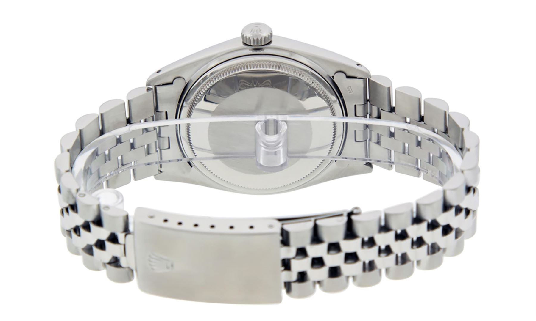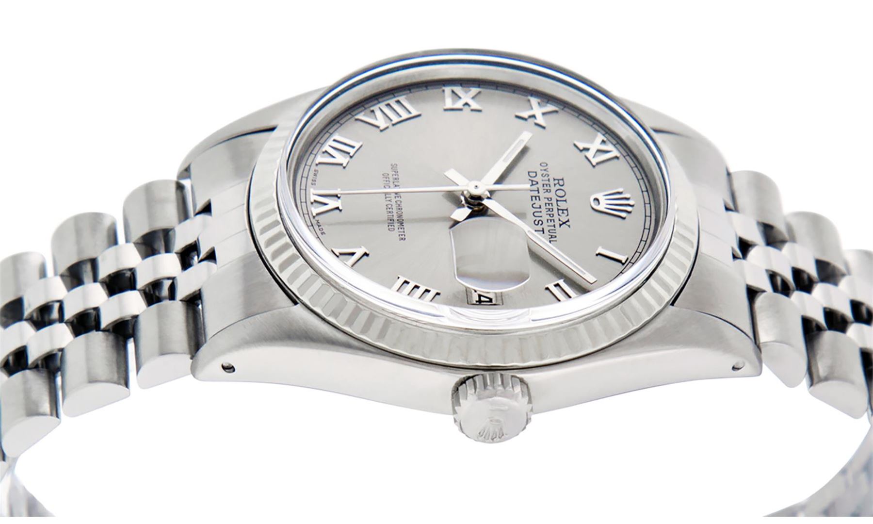 One Mens Pre Owned Stainless Steel Rolex Datejust Polished, Serviced & Electronically Tested, Rolex Stainless Steel Case: 36mm, Rolex Stainless Steel Crown, Rolex Bezel: 14K White Gold Fluted Bezel. Custom Crystal: New Plastic With Date Window. Custom Hands: New Luminescent Hands. Rolex Movement: Automatic Winding Movement 3035. Custom Dial: Refinished To Slate Grey Roman With Square Track. Date Window: 3 O'Clock Position Date Display, Quickset, Model: Datejust, Condition: G-6 Extra Fine. Rolex Bracelet: Stainless Steel Jubilee Band. Bright Polish & Satin Finish. 7.0 Inch Length, Adjustable. Standard Clasp, With Rolex Logo. This Watch Has Been Serviced Time Tested And Is In Excellent Condition It Is Free Of All Scratches And Dents.