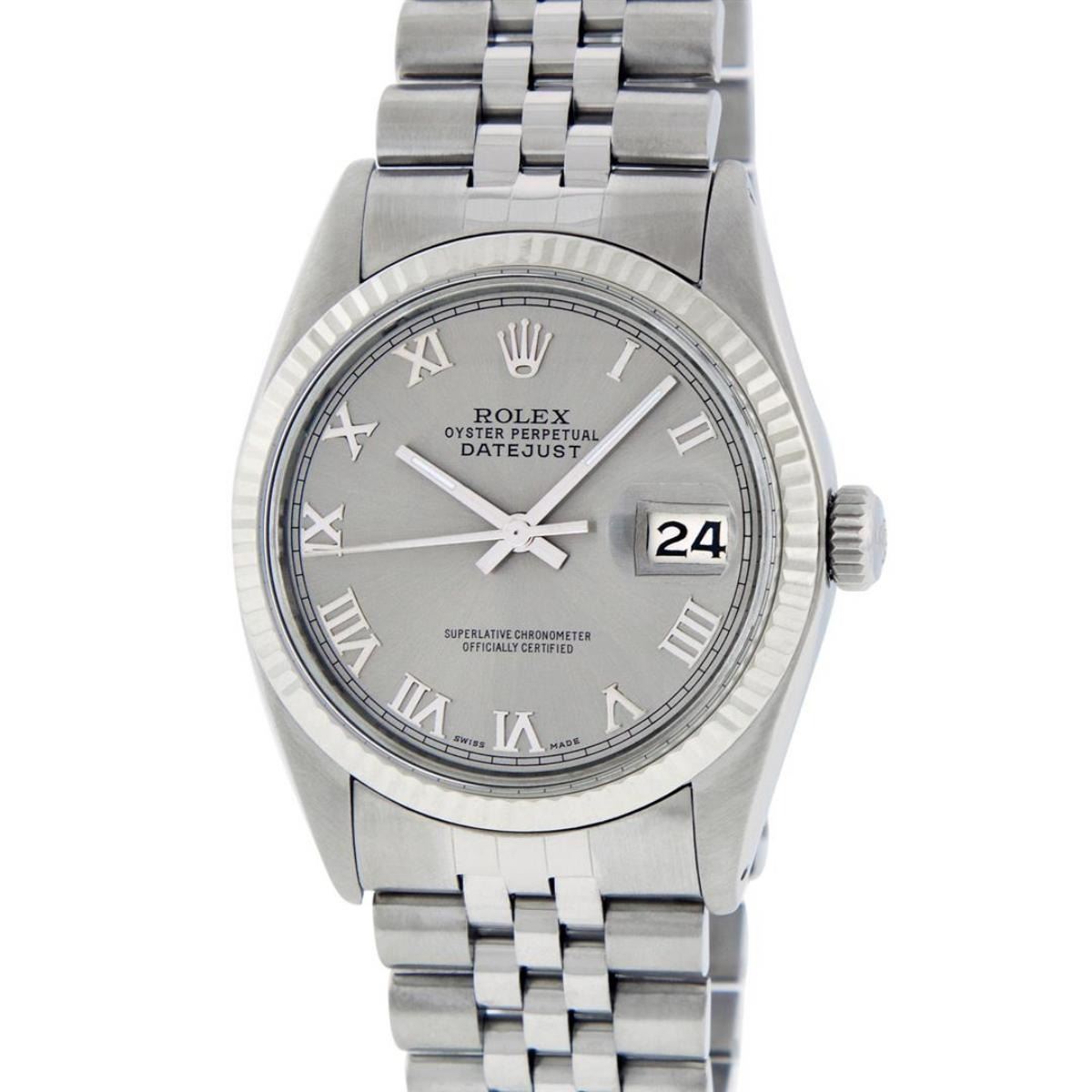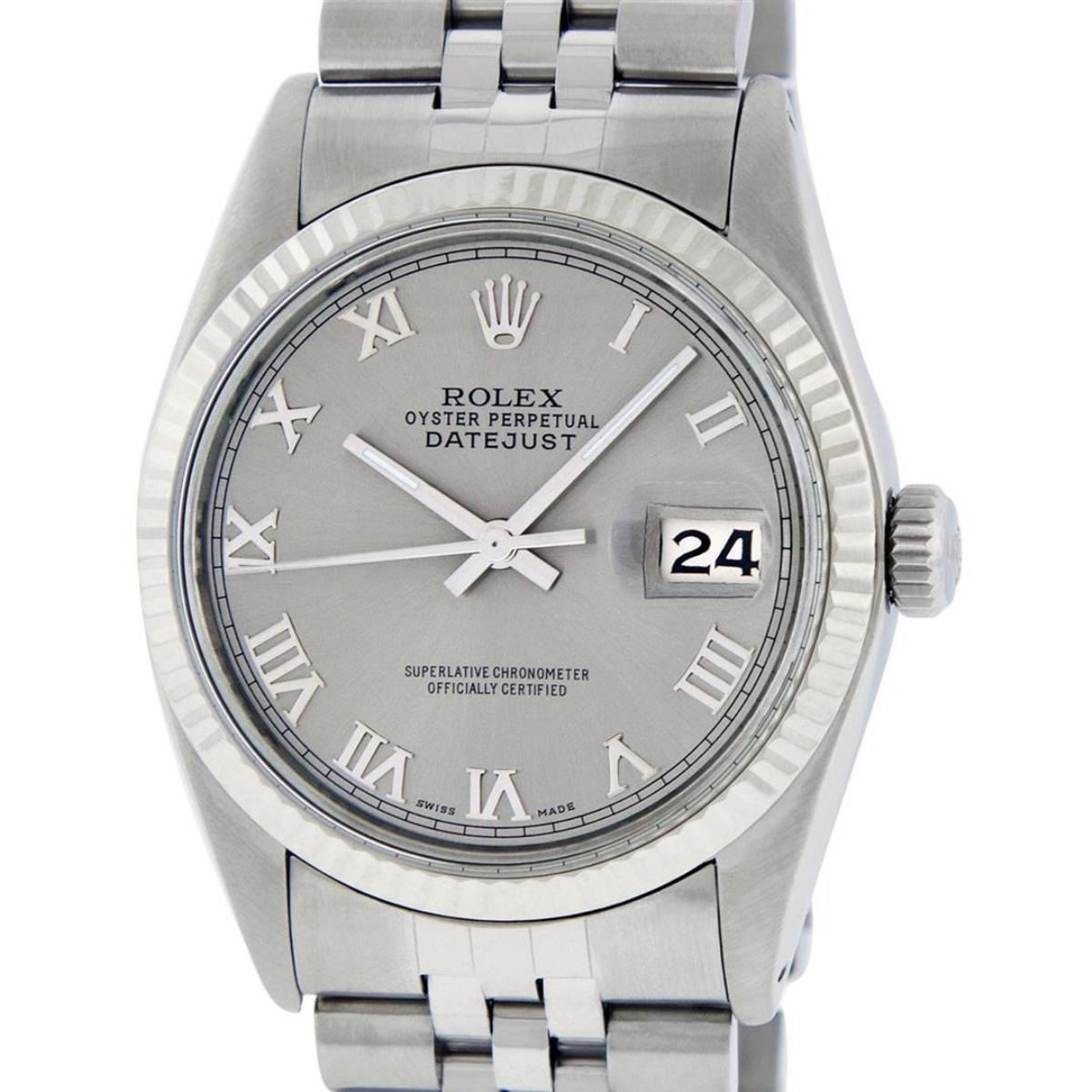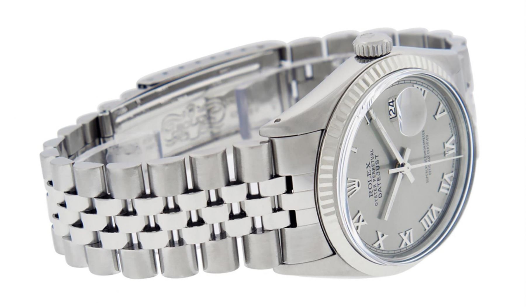 One Mens Stainless Steel Rolex Datejust Polished, Serviced & Electronically Tested, Stainless Steel Case: 36mm, Stainless Steel Crown, Bezel: 14K White Gold Fluted Bezel. Custom Crystal: New Acrylic Cyclops Lens. Custom Hands: New Luminescent Hands. Movement: Automatic Winding Movement. Custom Dial: Slate Grey Roman With Square Track. Date Window: 3 O'Clock Position Date Display, Quickset, Model: Datejust, Condition: G-6 Extra Fine. Bracelet: Stainless Steel Jubilee. Bright Polish & Satin Finish. 7.0 Inch Length, Adjustable. Standard Clasp, With Rolex Logo. This Watch Has Been Serviced Time Tested And Is In Excellent Condition It Is Free Of All Scratches And Dents.