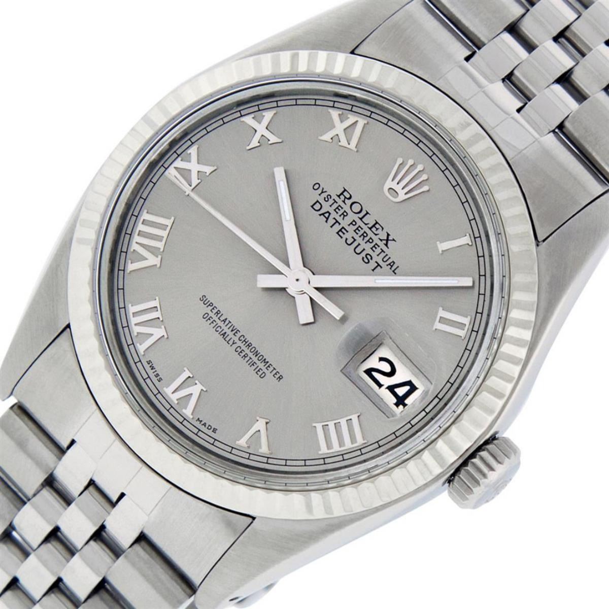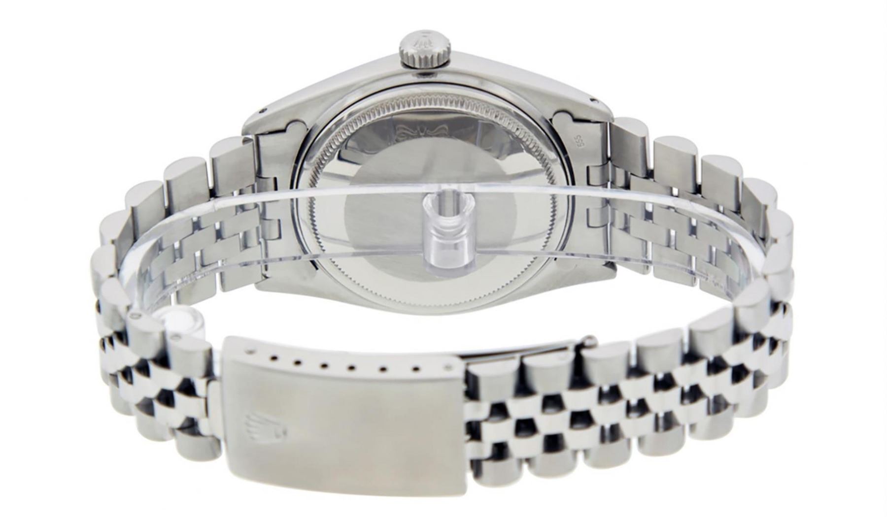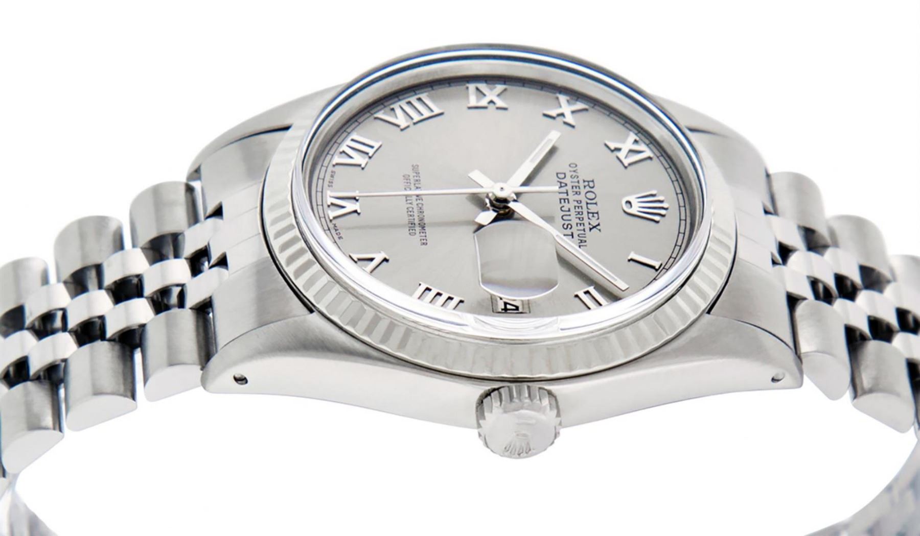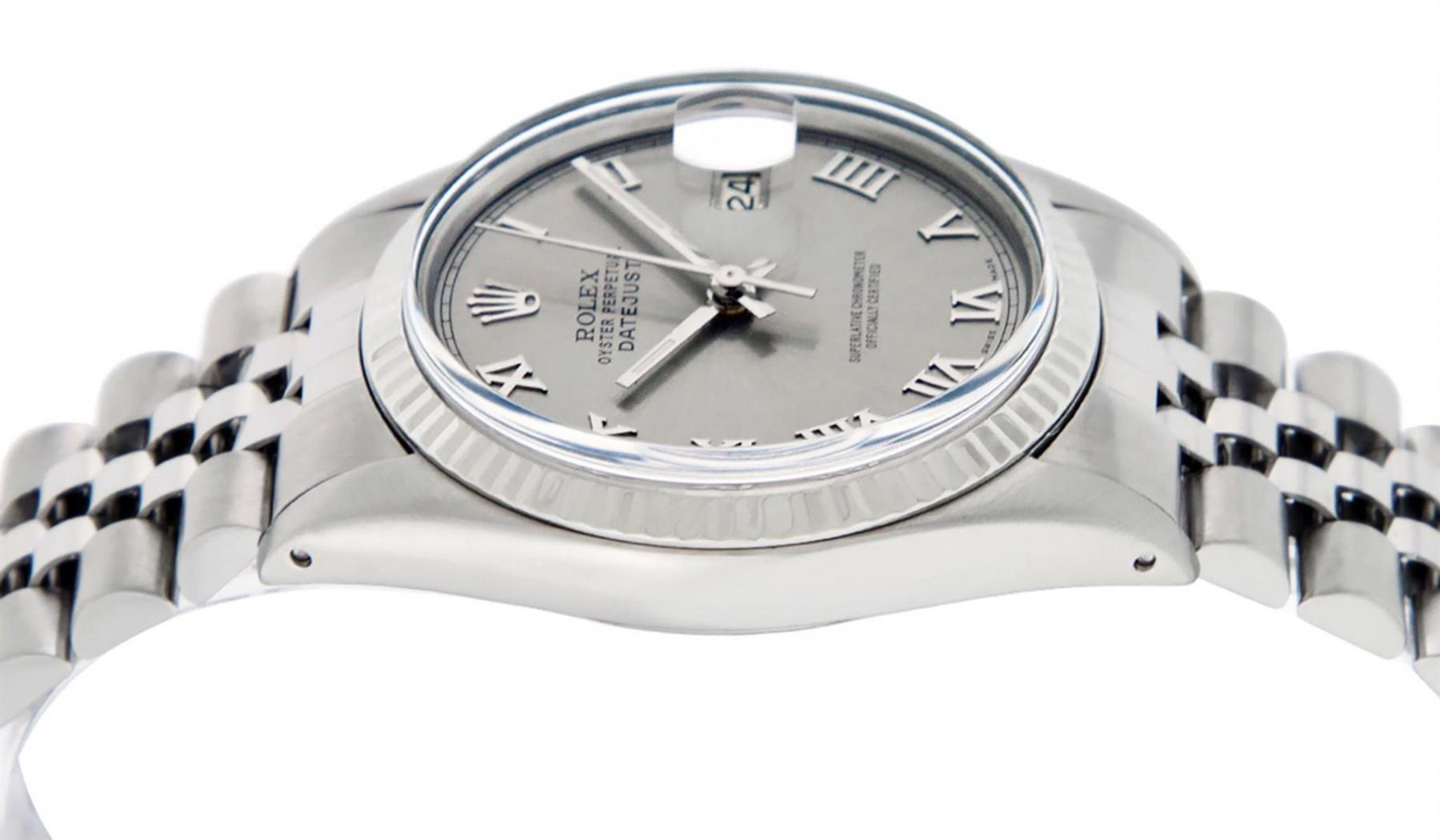 One Mens Stainless Steel Rolex Datejust Polished, Serviced & Electronically Tested, Stainless Steel Case: 36mm, Stainless Steel Crown, Bezel: 14K White Gold Fluted Bezel. Custom Crystal: New Acrylic Cyclops Lens. Custom Hands: New Luminescent Hands. Movement: Automatic Winding Movement. Custom Dial: Slate Grey Roman With Square Track. Date Window: 3 O'Clock Position Date Display, Quickset, Model: Datejust, Condition: G-6 Extra Fine. Bracelet: Stainless Steel Jubilee. Bright Polish & Satin Finish. 7.0 Inch Length, Adjustable. Standard Clasp, With Rolex Logo. This Watch Has Been Serviced Time Tested And Is In Excellent Condition It Is Free Of All Scratches And Dents.