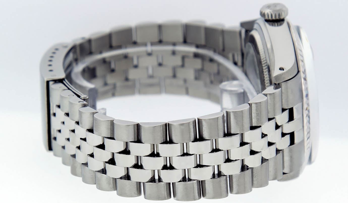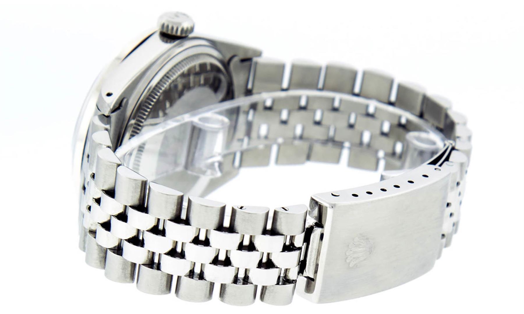 One Mens Rolex Datejust Polished Bright with Satin Finish, Serviced & Electronically Tested, Stainless Steel Case: 36mm, Stainless Steel Crown, Bezel: 14K White Gold Fluted Bezel. Custom Crystal: New Acrylic Cyclops Lens. Custom Hands: New Luminescent Hands. Movement: Automatic Winding Movement Caliber 3035. Custom Dial: Black Baguette Diamond 8 + 2 Synthetic Emerald Dial, Stone Count: 8 Baguette Diamonds in Dial + 2 Synthetic Emerald Baguettes, G To H In Color, Si-VS Clarity. Date Window: 3 O'Clock Position Date Display, Quickset, Model: Datejust, Condition: G-6 Extra Fine. Bracelet: Stainless Steel Jubilee. Bright Polish & Satin Finish. 7.0 Inch Length, Adjustable. Standard Clasp, With Rolex Logo. Watch Has Been Serviced And Polished It Is Free Of All Scratches And Dents.