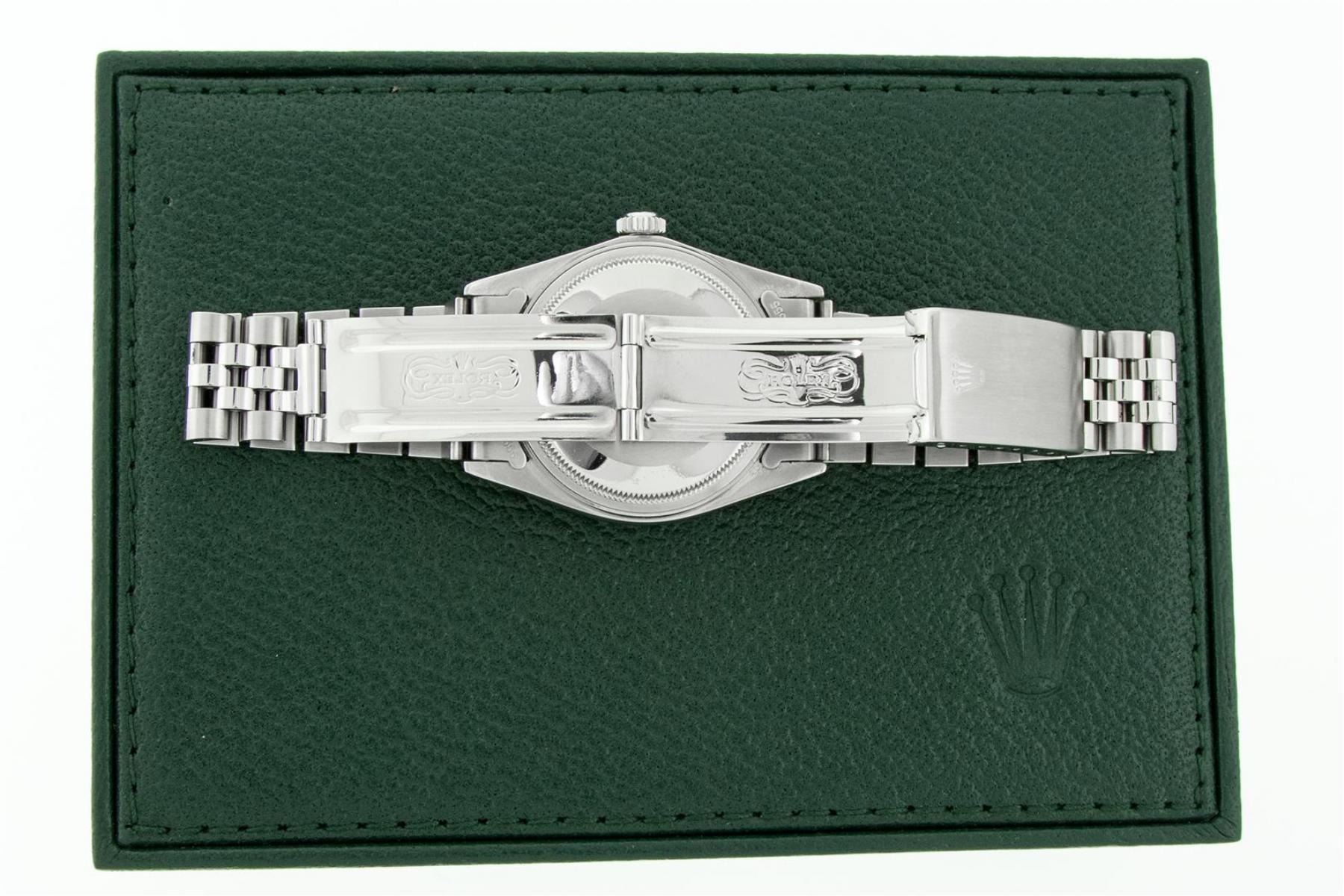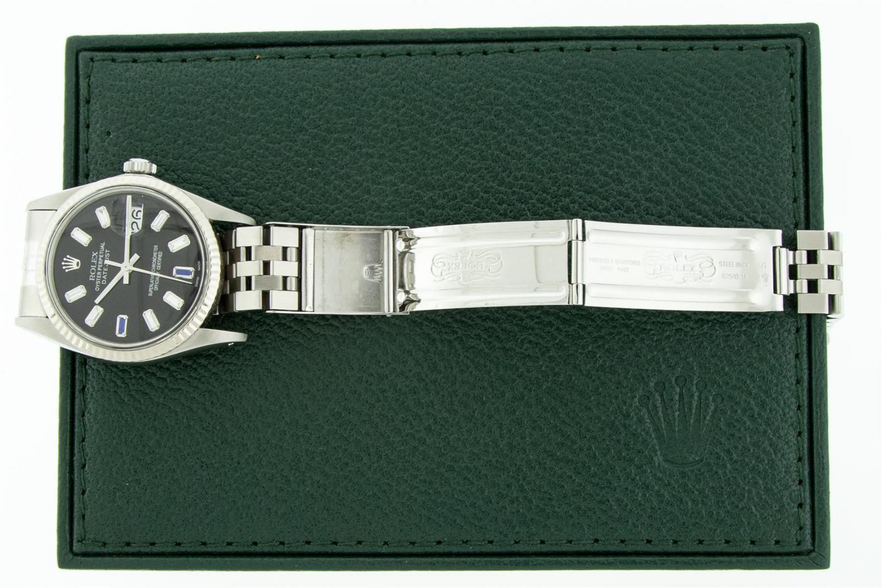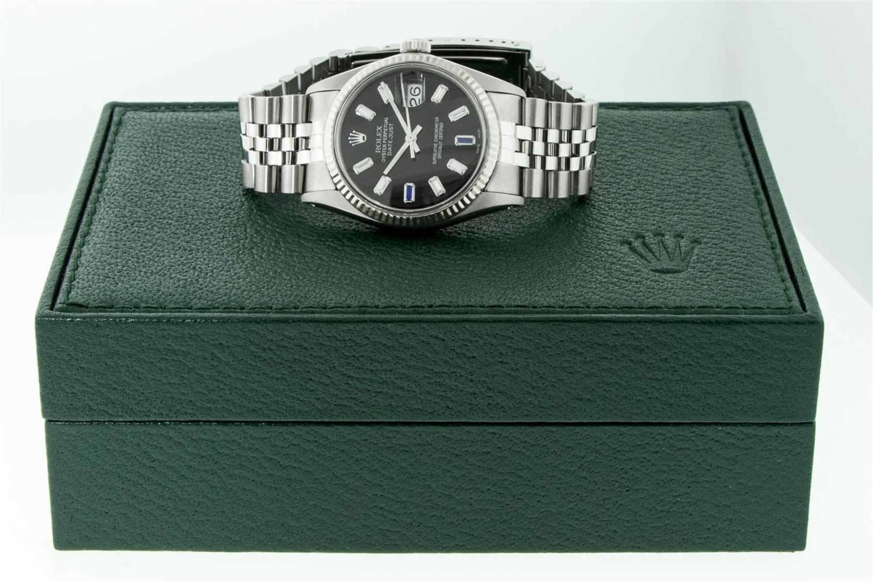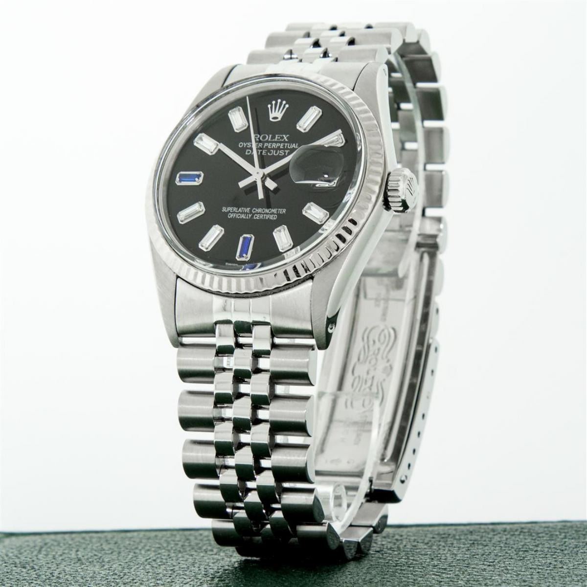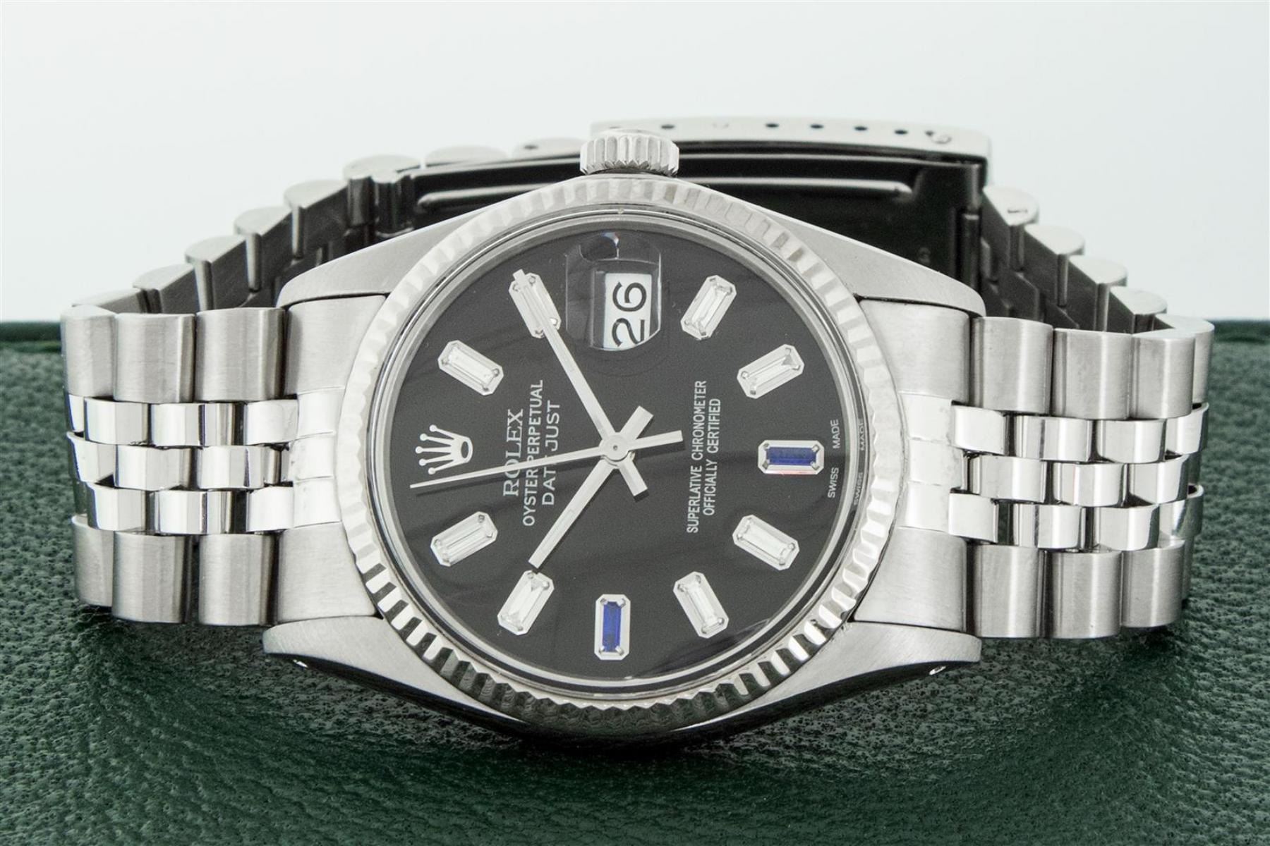One Mens Stainless Steel Rolex Datejust Polished Bright with Satin Finish, Serviced & Electronically Tested, Stainless Steel Case: 36mm, Stainless Steel Crown, Bezel: 14K White Gold Fluted Bezel. Custom Crystal: New Acrylic Cyclops Lens. Custom Hands: New Luminescent Hands. Movement: Automatic Winding Movement. Custom Dial: Black Baguette Diamond 8 + 2 Synthetic Sapphire Dial, Stone Count: 8 Baguette Diamonds in Dial + 2 Synthetic Sapphire Baguettes, G To H In Color, SI-VS Clarity. Date Window: 3 O'Clock Position Date Display, Quickset, Model: Datejust, Condition: G-6 Extra Fine. Bracelet: Stainless Steel Jubilee. Bright Polish & Satin Finish. 7.0 Inch Length, Adjustable. Standard Clasp, With Rolex Logo. Watch Has Been Serviced And Polished It Is Free Of All Scratches And Dents.