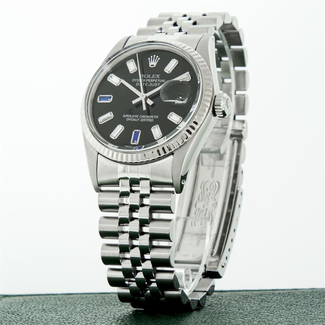 One Mens Stainless Steel Rolex Datejust Polished Bright with Satin Finish, Serviced & Electronically Tested, Stainless Steel Case: 36mm, Stainless Steel Crown, Bezel: 14K White Gold Fluted Bezel. Custom Crystal: New Acrylic Cyclops Lens. Custom Hands: New Luminescent Hands. Movement: Automatic Winding Movement. Custom Dial: Black Baguette Diamond 8 + 2 Synthetic Sapphire Dial, Stone Count: 8 Baguette Diamonds in Dial + 2 Synthetic Sapphire Baguettes, G To H In Color, SI-VS Clarity. Date Window: 3 O'Clock Position Date Display, Quickset, Model: Datejust, Condition: G-6 Extra Fine. Bracelet: Stainless Steel Jubilee. Bright Polish & Satin Finish. 7.0 Inch Length, Adjustable. Standard Clasp, With Rolex Logo. Watch Has Been Serviced And Polished It Is Free Of All Scratches And Dents.