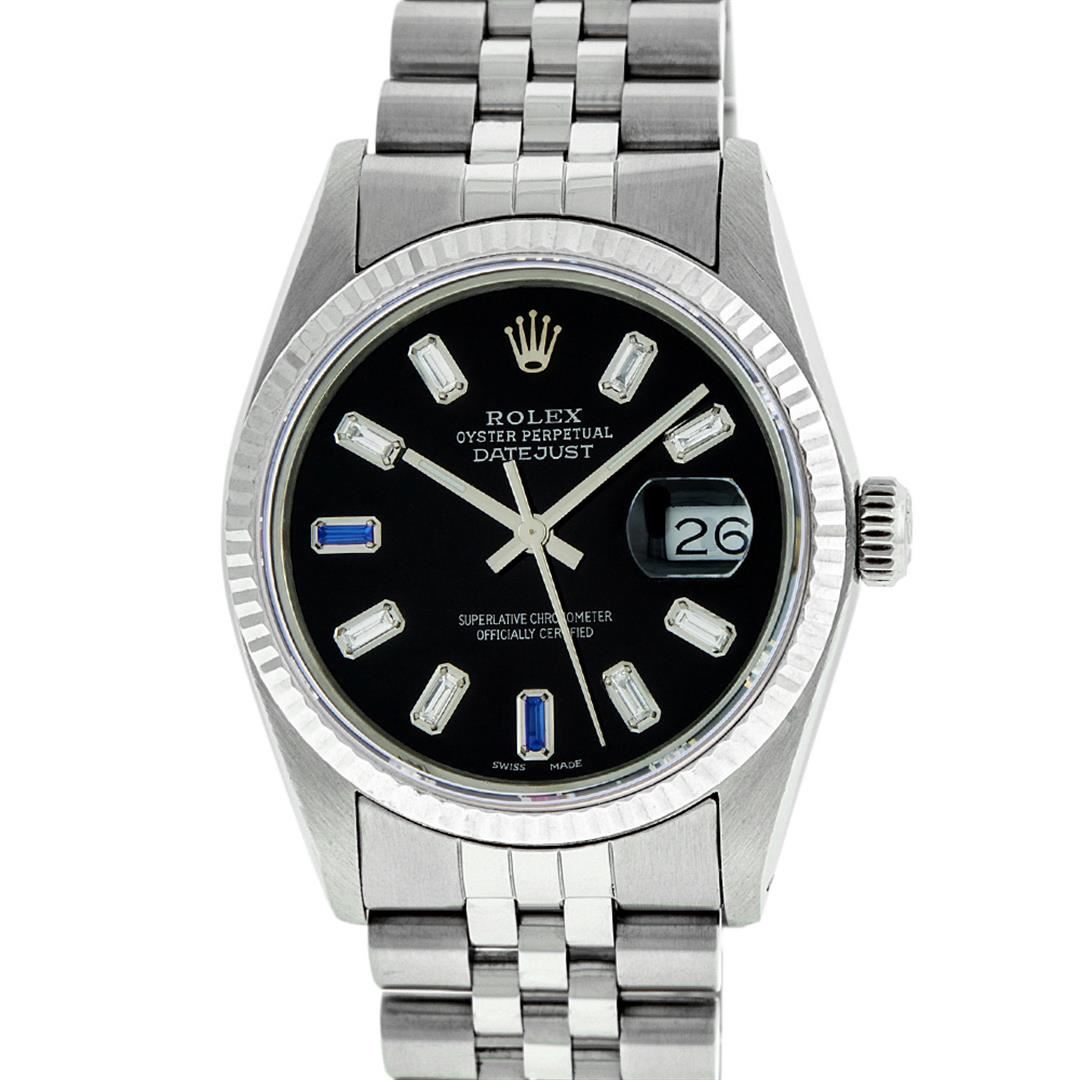 One Mens Stainless Steel Rolex Datejust Polished Bright with Satin Finish, Serviced & Electronically Tested, Stainless Steel Case: 36mm, Stainless Steel Crown, Bezel: 14K White Gold Fluted Bezel. Custom Crystal: New Acrylic Cyclops Lens. Custom Hands: New Luminescent Hands. Movement: Automatic Winding Movement. Custom Dial: Black Baguette Diamond 8 + 2 Synthetic Sapphire Dial, Stone Count: 8 Baguette Diamonds in Dial + 2 Synthetic Sapphire Baguettes, G To H In Color, SI-VS Clarity. Date Window: 3 O'Clock Position Date Display, Quickset, Model: Datejust, Condition: G-6 Extra Fine. Bracelet: Stainless Steel Jubilee. Bright Polish & Satin Finish. 7.0 Inch Length, Adjustable. Standard Clasp, With Rolex Logo. Watch Has Been Serviced And Polished It Is Free Of All Scratches And Dents.