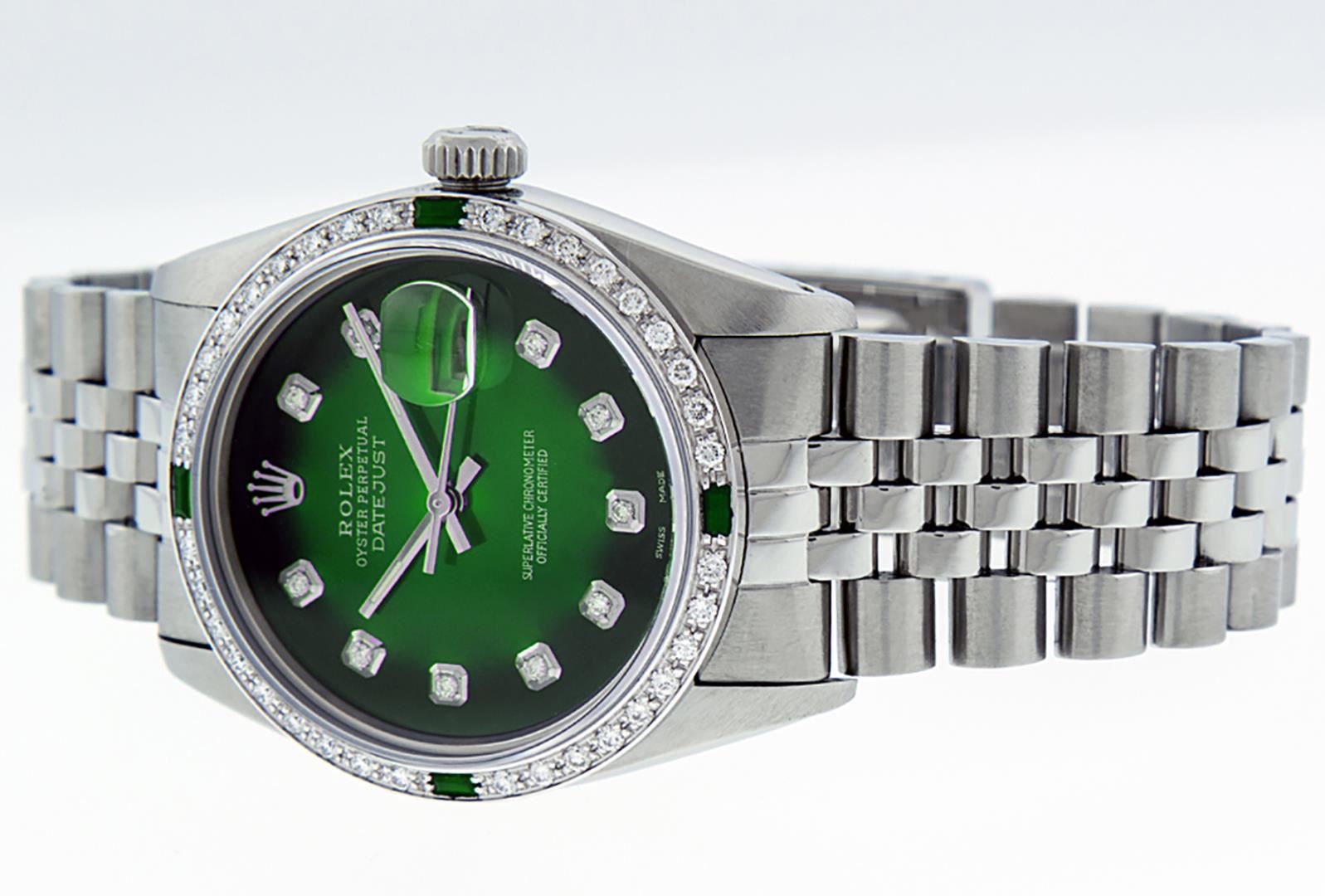 One Mens Pre Owned Rolex Datejust Polished, Serviced And Electronically Tested, Stainless Steel Case: 36mm, Stainless Steel Crown, Custom Bezel: 18K White Gold Emerald Beadset Diamond Bezel, Diamond + Gem Count: 36 Diamonds + 4 Emeralds. Custom Crystal: New Sapphire With Magnified Date Window. Custom Hands: New Luminescent Hands. Rolex Movement: Automatic Winding Movement 3035. Custom Dial: Custom Green Vignette With Added Diamond Hour Markers, 10 Diamonds In Dial. Date Window: 3 O'Clock Position Date Display, Quickset, Model: Quickset Datejust. Condition: G-6 Extra Fine. Rolex Bracelet: Stainless Steel Jubilee Band. Bright Polish And Satin Finish. 7.0 Inch Length, Adjustable. Standard Clasp, With Rolex Logo. This Watch Has Been Serviced Time Tested And Is In Excellent Condition It Is Free Of All Scratches And Dents.