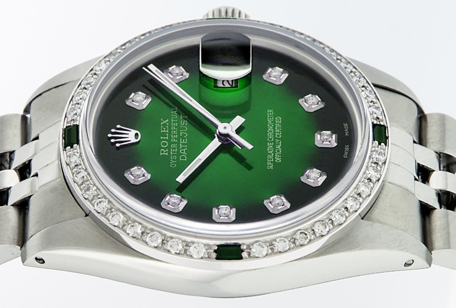 One Mens Pre Owned Rolex Datejust Polished, Serviced And Electronically Tested, Stainless Steel Case: 36mm, Stainless Steel Crown, Custom Bezel: 18K White Gold Emerald Beadset Diamond Bezel, Diamond + Gem Count: 36 Diamonds + 4 Emeralds. Custom Crystal: New Sapphire With Magnified Date Window. Custom Hands: New Luminescent Hands. Rolex Movement: Automatic Winding Movement 3035. Custom Dial: Custom Green Vignette With Added Diamond Hour Markers, 10 Diamonds In Dial. Date Window: 3 O'Clock Position Date Display, Quickset, Model: Quickset Datejust. Condition: G-6 Extra Fine. Rolex Bracelet: Stainless Steel Jubilee Band. Bright Polish And Satin Finish. 7.0 Inch Length, Adjustable. Standard Clasp, With Rolex Logo. This Watch Has Been Serviced Time Tested And Is In Excellent Condition It Is Free Of All Scratches And Dents.